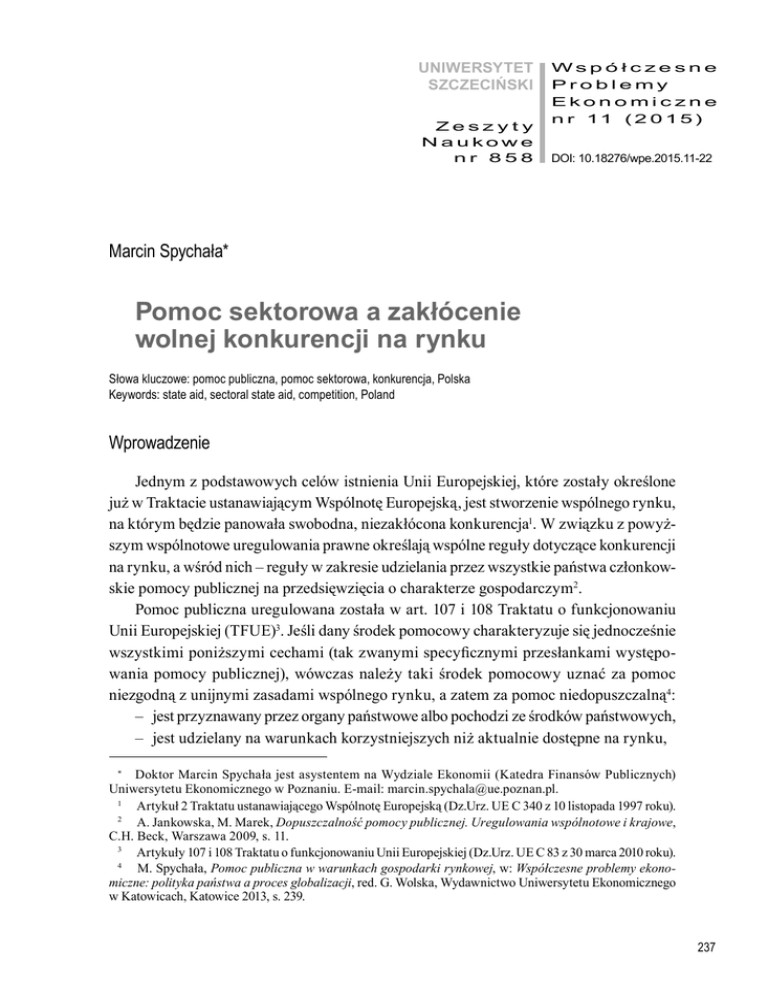 UNIWERSYTET SZCZECIŃSKI Zeszyty Naukowe nr 858 Wspó łczesne Problemy Ekonomiczne n r 11 ( 2 0 1 5 ) DOI: 10.18276/wpe.2015.11-22 Marcin Spychała* Pomoc sektorowa a zakłócenie wolnej konkurencji na rynku Słowa kluczowe: pomoc publiczna, pomoc sektorowa, konkurencja, Polska Keywords: state aid, sectoral state aid, competition, Poland Wprowadzenie Jednym z podstawowych celów istnienia Unii Europejskiej, które zostały określone już w Traktacie ustanawiającym Wspólnotę Europejską, jest stworzenie wspólnego rynku, na którym będzie panowała swobodna, niezakłócona konkurencja1. W związku z powyższym wspólnotowe uregulowania prawne określają wspólne reguły dotyczące konkurencji na rynku, a wśród nich – reguły w zakresie udzielania przez wszystkie państwa członkowskie pomocy publicznej na przedsięwzięcia o charakterze gospodarczym2. Pomoc publiczna uregulowana została w art. 107 i 108 Traktatu o funkcjonowaniu Unii Europejskiej (TFUE)3. Jeśli dany środek pomocowy charakteryzuje się jednocześnie wszystkimi poniższymi cechami (tak zwanymi specyficznymi przesłankami występowania pomocy publicznej), wówczas należy taki środek pomocowy uznać za pomoc niezgodną z unijnymi zasadami wspólnego rynku, a zatem za pomoc niedopuszczalną4: –– jest przyznawany przez organy państwowe albo pochodzi ze środków państwowych, –– jest udzielany na warunkach korzystniejszych niż aktualnie dostępne na rynku, Doktor Marcin Spychała jest asystentem na Wydziale Ekonomii (Katedra Finansów Publicznych) Uniwersytetu Ekonomicznego w Poznaniu. E-mail: [email protected]. 1 Artykuł 2 Traktatu ustanawiającego Wspólnotę Europejską (Dz.Urz. UE C 340 z 10 listopada 1997 roku). 2 A. Jankowska, M. Marek, Dopuszczalność pomocy publicznej. Uregulowania wspólnotowe i krajowe, C.H. Beck, Warszawa 2009, s. 11. 3 Artykuły 107 i 108 Traktatu o funkcjonowaniu Unii Europejskiej (Dz.Urz. UE C 83 z 30 marca 2010 roku). 4 M. Spychała, Pomoc publiczna w warunkach gospodarki rynkowej, w: Współczesne problemy ekonomiczne: polityka państwa a proces globalizacji, red. G. Wolska, Wydawnictwo Uniwersytetu Ekonomicznego w Katowicach, Katowice 2013, s. 239. * 237 Współczesne Problemy Ekonomiczne nr 11 (2015) –– ma selektywny charakter, –– grozi zakłóceniem bądź też zakłóca konkurencję na rynku, –– ma ujemny wpływ na wymianę handlową między państwami Unii. Celem artykułu jest przedstawienie struktury pomocy sektorowej udzielanej w Polsce w latach 2003–2012. W opracowaniu postanowiono zweryfikować hipotezę, według której pomoc sektorowa wywiera istotny wpływ na zakłócenie wolnej konkurencji na rynku. Do osiągnięcia powyższego celu zastosowano metodę opisową oraz przyczynową. Dane statystyczne dotyczące pomocy sektorowej zaczerpnięto z okresowych raportów Urzędu Ochrony Konkurencji i Konsumentów dotyczących pomocy udzielonej w Polsce w badanych latach. Celowi artykułu podporządkowana została jego treść oraz układ. Najpierw przedstawiono istotę pomocy sektorowej, a następnie przeprowadzono analizę wielkości i struktury tej pomocy udzielonej w Polsce. Sektorowe przeznaczenie pomocy publicznej Liberalizacja Pomoc publiczna według swojego przeznaczenia jest dzielona na trzy następujące grupy: pomoc horyzontalną, pomoc regionalną oraz pomoc sektorową. Podstawowym celem pomocy regionalnej jest stymulowanie rozwoju słabiej rozwiniętych regionów Unii Europejskiej. Pomoc horyzontalna służy z kolei rozwiązaniu określonego problemu o strategicznym charakterze albo o ogólnym zasięgu – dotyczy na przykład wdrażania innowacji, wzrostu zatrudnienia lub ochrony środowiska. Natomiast pomoc sektorowa skierowana jest do przedsiębiorstw prowadzących działalność w ramach ściśle określonych gałęzi gospodarki. Pomoc sektorowa adresowana jest do przedsiębiorstw prowadzących działalność gospodarczą w ramach tak zwanych sektorów wrażliwych wtedy, gdy napotykają one na problemy finansowe ograniczające ich swobodne funkcjonowanie na rynku5. Tradycyjnie do sektorów wrażliwych zalicza się następujące sektory gospodarki6: –– górnictwo węgla, –– hutnictwo żelaza i stali, –– przemysł stoczniowy, –– przemysł włókien syntetycznych, –– wytwarzanie energii elektrycznej, –– kinematografię, –– telekomunikację, –– sektor gazu ziemnego. 5 Finanse publiczne, red. T. Juja, Wydawnictwo Uniwersytetu Ekonomicznego w Poznaniu, Poznań 2011, s. 364. 6 P. Nicolaides, M. Kekelekis, M. Kleis, State Aid Policy in the European Community, Wolters Kluwer, London 2008, s. 48. 238 Marcin Spychała Pomoc sektorowa a zakłócenie wolnej konkurencji na rynku Liberalizacja Poza wymienionymi powyżej za sektory wrażliwe uważane są również: leśnictwo, rolnictwo, rybołówstwo oraz akwakultura, a także sektor transportu (drogowego, kolejowego, śródlądowego, morskiego, lotniczego oraz intermodalnego i multimodalnego), jednak w przypadku tych sektorów stosowane są odmienne reguły dopuszczalności pomocy publicznej. W związku z oddzieleniem pomocy przeznaczonej na rozwój obszarów wiejskich pomoc w tych sektorach regulują Wytyczne Wspólnoty w sprawie pomocy państwa w sektorze rolnym i leśnym oraz Wytyczne dla celów analizy pomocy państwa dla rybołówstwa i akwakultury7. Ponadto, w statystyce publicznej pomoc udzielona w ramach tych sektorów nie jest uznawana za pomoc sektorową, dlatego też nie zostanie ona objęta zakresem niniejszego opracowania. Pomoc sektorowa służy wsparciu przede wszystkim procesów o charakterze restrukturyzacyjnym. Z tego też względu powinna mieć ona charakter doraźny, a także wyjątkowy, dlatego nie powinna być w zasadzie przeznaczona na nowe inwestycje8. Konieczność udzielenia pomocy publicznej przedsiębiorstwom prowadzącym działalność gospodarczą w sektorach wrażliwych może być spowodowane takimi czynnikami, jak9: przerost zatrudnie