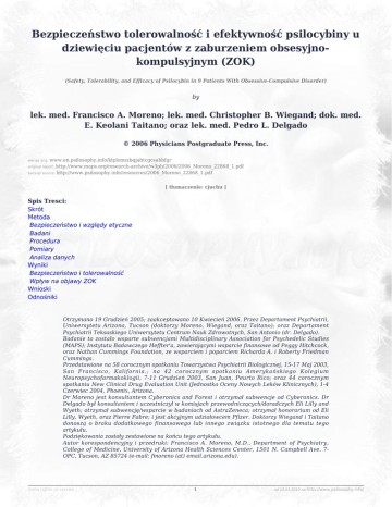 Bezpieczeństwo tolerowalność i efektywność psilocybiny u dziewięciu pacjentów z zaburzeniem obsesyjnokompulsyjnym (ZOK) (Safety, Tolerability, and Efficacy of Psilocybin in 9 Patients With Obsessive-Compulsive Disorder) by lek. med. Francisco A. Moreno; lek. med. Christopher B. Wiegand; dok. med. E. Keolani Taitano; oraz lek. med. Pedro L. Delgado © 2006 Physicians Postgraduate Press, Inc. wersja ang. www.en.psilosophy.info/ktplsmszbqjabtcgcsabbfgr original report: http://www.maps.org/research-archive/w3pb/2006/2006_Moreno_22868_1.pdf backup source: http://www.psilosophy.info/resources/2006_Moreno_22868_1.pdf [ tłumaczenie: cjuchu ] Spis Tresci: Skrót Metoda Bezpieczeństwo i względy etyczne Badani Procedura Pomiary Analiza danych Wyniki Bezpieczeństwo i tolerowalność Wpływ na objawy ZOK Wnioski Odnośniki Otrzymano 19 Grudzień 2005; zaakceptowano 10 Kwiecień 2006. Przez Departament Psychiatrii, Uniwersytetu Arizona, Tucson (doktorzy Moreno, Wiegand, oraz Taitano); oraz Departament Psychiatrii Teksaskiego Uniwersytetu Centrum Nauk Zdrowotnych, San Antonio (dr. Delgado). Badanie to zostało wsparte subwencjami Multidisciplinary Association for Psychedelic Studies (MAPS); Instytutu Badawczego Heffter'a, zawierającymi wsparcie finansowe od Peggy Hitchcock, oraz Nathan Cummings Foundation, ze wsparciem i poparciem Richarda A. i Roberty Friedman Cummings. Przedstawione na 58 corocznym spotkaniu Towarzystwa Psychiatrii Biologicznej, 15-17 Maj 2003, San Francisco, Kalifornia.; na 42 corocznym spotkaniu Amerykańskiego Kolegium Neuropsychofarmakoklogii, 7-11 Grudzień 2003, San Juan, Peurto Rico; oraz 44 corocznym spotkaniu New Clinical Drug Evaluation Unit (Jednostka Oceny Nowych Leków Klinicznych), 1-4 Czerwiec 2004, Phoenix, Arizona. Dr Moreno jest konsultantem Cyberonics and Forest i otrzymał subwencje od Cyberonics. Dr Delgado był konsultantem i uczestniczył w komisjach przewodniczących/doradczych Eli Lilly and Wyeth; otrzymał subwencję/wsparcie w badaniach od AstraZeneca; otrzymał honorarium od Eli Lilly, Wyeth, oraz Pierre Fabre; i jest akcyjnym udziałowcem Pfizer. Doktorzy Wiegand i Taitano donoszą o braku dodatkowego finansowego lub innego związku istotnego dla tematu tego artykułu. Podziękowania zostały zestawione na końcu tego artykułu. Autor korespondencyjny i przedruki: Francisco A. Moreno, M.D., Department of Psychiatry, College of Medicine, University of Arizona Health Sciences Center, 1501 N. Campbell Ave. 7OPC, Tucson, AZ 85724 (e-mail: fmoreno (at) email.arizona.edu). soma rights re-served 1 od 10.03.2010 na http://www.psilosophy.info/ bezpieczeństwo tolerowalność i efektywność psilocybiny przy zok www.psilosophy.info/ktplsmszbqjabtcgcsabbfgr Skrót Kontekst: Anegdotyczne raporty sugerują, że środki psychodeliczne mogą złagodzić symptomy zaburzenia obsesyjno-kompulsyjnego (ZOK). To ulepszone badanie podwójnie ślepej próby rozpatrzyło bezpieczeństwo, tolerowalność, oraz kliniczne efekty psilocybiny, potencjalnego agonisty 5-HT1A oraz 5-HT2A/2C u pacjentów z ZOK. Metoda: Dziewięciu badanych z ZOK określonych DSM-IV obecnie bez innych poważnych zaburzeń psychiatrycznych uczestniczyło w góra 4 jednodawkowych kontaktach z psilocybiną w dawkach wahających się od subhalucynogennych do mocno halucynogennych. Dawki, niska (100 µg/kg), średnia (200 µg/kg), oraz wysoka (300 µg/kg), zostały przydzielone w tej kolejności, a bardzo niska dawka (25 µg/kg) została wstawiona losowo metodą podwójnie ślepej próby po jakimś czasie po pierwszej dawce. Dni testowe oddzielone były przynajmniej jednym tygodniem. Każda sesja została przeprowadzona w ośmiogodzinnym okresie w kontrolowanych warunkach kliniki ambulatoryjnej; badani byli następnie przenoszeni do psychiatrycznych oddziałów szpitalnych na całonocną obserwację. W 0, 4, 8, oraz 24 godzinie po przyjęciu zastosowano Skalę Obsesji Kompulsji Yale Brown (YBOCS) oraz wizualną skalę analogową (WSA) mierzącą całościowe nasilenie objawów obsesyjno kompulsyjnych. W 8 godzinie zastosowano Skalę Oceny Halucynogenności (SOH) (ang. Hallucinogen Rating Scale-HRS), a objawy czynności życiowych zebrano w 0, 1, 4, 8, oraz 24 godzinie po przyjęciu. Badanie przeprowadzono między Listopadem 2001 a Listopadem 2004. Wyniki: Dziewięciu badanym podano łącznie 29 dawek psilocybiny. Jeden badany doznał przejściowego nadciśnienia nie związanego z niepokojem lub objawami somatycznymi, lecz nie zaobserwowano żadnych innych ważnych niepożądanych efektów. U wszystkich badanych w czasie 1 lub kilku sesji analiz zaobserwowano wyraźne spadki o zmiennym stopniu symptomów ZOK (23%-100% spadek w teście YBOCS). Powtarzane pomiary analizy niezgodności dla wszystkich wartości YBOCS ujawniły znacząco główny wpływ czasu na lambdę Wilksa (F=9,86, df=3,3; p=0.046), lecz żadnego znaczącego wpływu dawki (F=2,25, df=3,3; p=0.261) lub interakcji czasu i dawki (F=0,923, df=9,45; p=0,515). Poprawa trwała w zasadzie dłużej niż 24 godzinny czas pomiarów. Wnioski: Psilocybinę bezpiecznie zastosowano na badanych z ZOK w kontrolowanym środowisku medycznym, a u kilku badanych miała związek z ostrą redukcją grupy symptomów ZOK. (J Clin Psychiatry 2006;67:1735-1740) Zaburzenie Obsesyjno Kompulsyjne (ZOK) jest chronicznym i osłabiającym stanem występującym z powszechnością 2% do 3%, co czyni je czwartym najpowszechniejszym rozpoznaniem psychiatrycznym1,2 i jednym z tych, z bardzo wysokim obciążeniem chorobowym. 3 Ponadto, ZOK jest przeważnie powikłany obecnością urojeń współistniejących, skłonności samobójczych, paniki, nadużywania substancji, depresji, oraz problemów interpersonalnych. Wielu pacjentów z ZOK opóźnia lub zupełnie unika prowadzenia opieki, a spośród szukających pomocy, wielu pozostaje nierozpoznanych i nieleczonych. Jest już dobrze ustalone, że SRI - inhibitory wychwytu zwrotnego serotoniny (5-HT), takie jak selektywne in