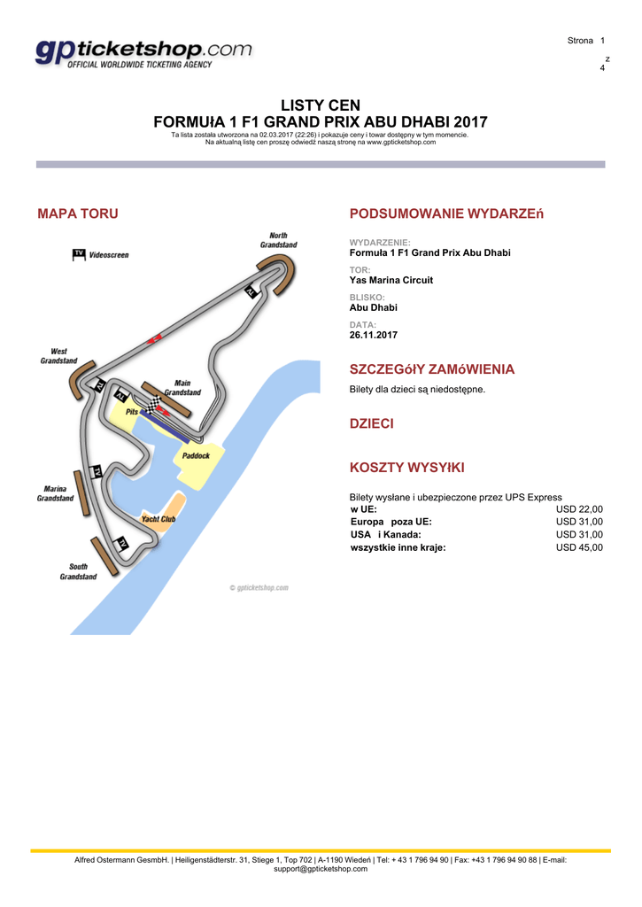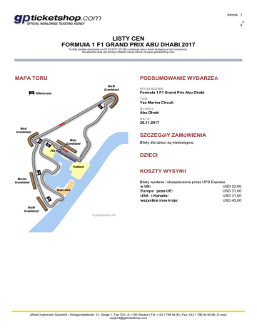 Strona 1 4 LISTY CEN FORMUłA 1 F1 GRAND PRIX ABU DHABI 2017 Ta lista została utworzona na 02.03.2017 (22:26) i pokazuje ceny i towar dostępny w tym momencie. Na aktualną listę cen proszę odwiedź naszą stronę na www.gpticketshop.com MAPA TORU PODSUMOWANIE WYDARZEń WYDARZENIE: Formuła 1 F1 Grand Prix Abu Dhabi TOR: Yas Marina Circuit BLISKO: Abu Dhabi DATA: 26.11.2017 SZCZEGółY ZAMóWIENIA Bilety dla dzieci są niedostępne. DZIECI KOSZTY WYSYłKI Bilety wysłane i ubezpieczone przez UPS Express w UE: USD 22,00 Europa poza UE: USD 31,00 USA i Kanada: USD 31,00 wszystkie inne kraje: USD 45,00 Alfred Ostermann GesmbH. | Heiligenstädterstr. 31, Stiege 1, Top 702 | A-1190 Wiedeń | Tel: + 43 1 796 94 90 | Fax: +43 1 796 94 90 88 | E-mail: [email protected] z Strona 2 4 BILETY NA FORMUłA 1 PADDOCK CLUB™ W CENIE KAżDEGO BILETU DLA GOśCI: Wstęp na tor Kawa, herbata, rogaliczki i przekąski Open bar z szampanem Gourmet obiad z wykwintnymi winami Wizyta(y) w pit stopie w wyznaczonym czasie Wstęp na Support Race Paddock Oficjalny program i zatyczki do uszu Rozrywka Uprzywilejowany widok na prostą start/meta (tylko Pit Building Terrace i Pit Building Lounge) Parking dla każdych 3 gości (pięciu w Monako) Dodatkowe usługi, tak jak menu śniadaniowe, także mogą byc zaklupione. KAżDY SUITE DYSPONUJE: Dywanem Stołami (dla 10 gości), krzesła i obrusy Kwiatami Wejście z osobistą nazwą firmy Płaskoekranowy TV (transmisje określa i zapewnia Formula One Management Ltd.) Klimatyzacja (oprócz niezadaszonych) Suity mogą być dostosowane do potrzeb klienta dodatkowym wyposażeniem, np. głośnikami. BILETY Bilety na Paddock Club bez opłaty manipulacyjnej FORMULARZ ZAMóWIENIA FAX Alfred Ostermann GesmbH. | Heiligenstädterstr. 31, Stiege 1, Top 702 | A-1190 Wiedeń | Tel: + 43 1 796 94 90 | Fax: +43 1 796 94 90 88 | E-mail: [email protected] z Strona 3 4 Bilety na Paddock Club bez opłaty manipulacyjnej FORMULARZ ZAMóWIENIA FAX FAX NR: +43 1 7969490-88 Proszę wypełnij ten formularz w całości i DRUKOWANYMI LITERAMI. Imię i nazwisko: firma: adres: Kraj / Kod pocztowy / Miasto: E-Mail: Tel: Zamawiam bilety na Formuła 1 F1 Grand Prix Abu Dhabi (2017-11-26) Przeczytałem i zaakceptowałem ogólne warunki firmy Ilość Cena za sztukę USD Total USD plus 5% opłaty manipulacyjne z kosztami wysyłki Suma Metoda płatności Przelew bankowy Karta kredytowa: VISA | Mastercard | Diners Club Posiadacz karty: Numer karty: Ważna do: Kod CVV: OGóLNE WARUNKI FIRMY Ważne od: 01. 01. 2010 1.Ogólne Warunki Sprzedaży Ogólne warunki firmy są ważne na sprzedaż przez przedsiębiorstwo A. Ostermann Gmbh (dalej określone jako gpticketshop.com). Wszelkie różniące się warunki klientów mogą być tylko ustalone na piśmie. Zaznaczając pole przy końcu zamówienia “Z moim zamówieniem akceptuję warunki sprzedaży firmy gpticketshop.com”, kupujący akceptuje nasze warunki sprzedaży i jest do nich zobowiązany. Kupując bilet, klient akceptuje warunki organizatora. Nasz wybór artykułów w sprzedaży nie jest zobowiązujący i może ulec zmianom bez uprzedniego powiadomienia. Zamówenie dokonane przez kogokolwiek w wieku od 18 lat tworzy umowę sprzedaży na ogólnych warunkach sprzedaży naszej firmy. Automatyczne potwierdzenie przyjęcia twojego zamówienia, wysłane przez pocztę elektroniczną nie oznacza zawarcia kontraktu między sprzedającym i kupującym. Umowa sprzedaży staje się ważna po wysłaniu rachunku do klienta. Klient musi w pełni i poprawnie wypełnić formularz. Jakakolwiek szkowa wynikająca z błędnego lub niekompletnego wypełnienia formularza nie zostanie pokryta przez gpticketshop.com. Jako, że od naszej firmy nie zależą wszystkie elementy usługi, którą osobiście dostrczamy do klienta, jesteśmy zmuszeni współpracować z innymi kompetentnymi trzecimi firmami. 2. Zamówienie Umowa sprzedaży upoważnia się w następujący sposób: 1)Na stronie proszę wybierz bilety i ich ilość (+/-), którą życzysz sobie kupić i kliknij na przycisk obok “Zamów” . 2) Następnie wybierz swój region i określ metodę płatniczą i kliknij na przycisk “Kontynuuj zamówienie” . 3)Proszę sprawdź zawartość swojej karty zakupowej. 4)Następnie wprowadź wymagane dane w polu “Szczegóły zamówienia”. Proszę pamiętaj, że wyślemy zamówione i opłacone bilety na adres wskazany tutaj. 5)Kiedy przeczytasz i zaakceptujesz Ogólne Warunki Sprzedaży Firmy i zgodę na przetwarzanie danych osobowych, zaznacz odpowiednie pole i wyślij zamówienie, będące dla nas ofertą kontraktu. Alfred Ostermann GesmbH. | Heiligenstädterstr. 31, Stiege 1, Top 702 | A-1190 Wiedeń | Tel: + 43 1 796 94 90 | Fax: +43 1 796 94 90 88 | E-mail: [email protected] z Strona 4 4 5)Kiedy przeczytasz i zaakceptujesz Ogólne Warunki Sprzedaży Firmy i zgodę na przetwarzanie danych osobowych, zaznacz odpowiednie pole i wyślij zamówienie, będące dla nas ofertą kontraktu. 6)Następnie kontrakt zostanie ostatecznie zawarty przez nasze potwierdzenie emailem. W pełni opłacone bilety zostaną wysłane przez UPS, na około 2 tygodnie przed wydażeniem. Czasami z powodów nieprzewidzianych wypadków będziesz musiał odebrać bilety na torze. Oczywiście opłata za przesyłkę zostanie zwrócona. 3. Język kontraktu Językami kontraktu są niemiecki i angielski. Informacja, serwis obsługi i skargi będą także załatwiane po angielsku i po niemiecku. 4. Ceny Nasza usługa rozpocznie się kiedy otrzymamy pełną płatność za usługi opisane w umowie. Faktury muszą być regulowane w Euro lub Dolarach Amerykańskich, USD, jak wskazane na fakturze. Wszystkie ceny zawierają VAT. Wszystkie ceny są ważne tylko w momencie składania zamówienia. W dodatku do wskazanej ceny biletów, zostaniesz obciążony opłatą manipulacyjną i kosztami wysyłki. Opłata manipulacyjna i koszty wysyłki będą dokładnie pokazane w koszyku i w potwierdzeniu zamówienia przez email. Je