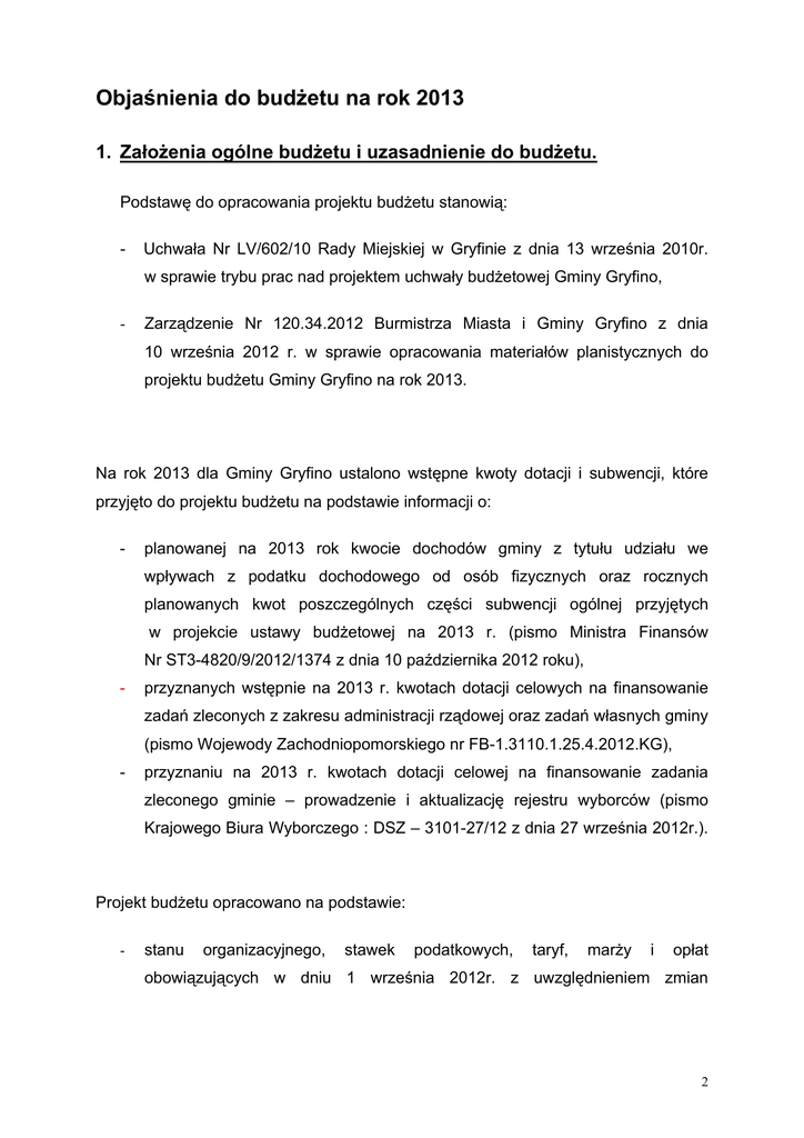 Objaśnienia do budżetu na rok 2013 1. Założenia ogólne budżetu i uzasadnienie do budżetu. Podstawę do opracowania projektu budżetu stanowią: - Uchwała Nr LV/602/10 Rady Miejskiej w Gryfinie z dnia 13 września 2010r. w sprawie trybu prac nad projektem uchwały budżetowej Gminy Gryfino, - Zarządzenie Nr 120.34.2012 Burmistrza Miasta i Gminy Gryfino z dnia 10 września 2012 r. w sprawie opracowania materiałów planistycznych do projektu budżetu Gminy Gryfino na rok 2013. Na rok 2013 dla Gminy Gryfino ustalono wstępne kwoty dotacji i subwencji, które przyjęto do projektu budżetu na podstawie informacji o: - planowanej na 2013 rok kwocie dochodów gminy z tytułu udziału we wpływach z podatku dochodowego od osób fizycznych oraz rocznych planowanych kwot poszczególnych części subwencji ogólnej przyjętych w projekcie ustawy budżetowej na 2013 r. (pismo Ministra Finansów Nr ST3-4820/9/2012/1374 z dnia 10 października 2012 roku), - przyznanych wstępnie na 2013 r. kwotach dotacji celowych na finansowanie zadań zleconych z zakresu administracji rządowej oraz zadań własnych gminy (pismo Wojewody Zachodniopomorskiego nr FB-1.3110.1.25.4.2012.KG), - przyznaniu na 2013 r. kwotach dotacji celowej na finansowanie zadania zleconego gminie – prowadzenie i aktualizację rejestru wyborców (pismo Krajowego Biura Wyborczego : DSZ – 3101-27/12 z dnia 27 września 2012r.). Projekt budżetu opracowano na podstawie: - stanu organizacyjnego, stawek podatkowych, taryf, marży i opłat obowiązujących w dniu 1 września 2012r. z uwzględnieniem zmian 2 wchodzących w życie przed lub z dniem 1 stycznia 2013 roku oraz nowych zamierzeń, - istniejącej na dzień 1 września 2012 r. sieci placówek, finansowanych z budżetu gminy z uwzględnieniem przewidywanych zmian w roku 2013, - przewidywanego wykonania planu dochodów i wydatków budżetowych określonych na 2012 r. jako baza wyjściowa do planu na 2013 r., - przewidywanego wykonania wydatków do końca 2012 r. w tym wynagrodzeń, - zatrudnienia wg stanu na dzień 1 września 2012 r. z uwzględnieniem przewidywanych zmian w roku 2013, - umów kredytowych. Projekt budżetu został opracowany zgodnie z Rozporządzeniem Ministra Finansów z dnia 2 marca 2010 r. w sprawie szczegółowej klasyfikacji dochodów, wydatków, przychodów i rozchodów oraz środków pochodzących ze źródeł zagranicznych (Dz.U. Nr 38 poz. 207 z późniejszymi zmianami). Zadania przewidziane do realizacji w 2013 r. zawierają szczegółowy opis tych zadań wraz z kalkulacją wydatków i podaniem podstawy prawnej. Do opracowania planów finansowych jednostek organizacyjnych gminy przyjęto następujące procedury i wskaźniki: Dochody: - dochody budżetowe (podatki i opłaty) oszacowano zgodnie ze stawkami ustalonymi na rok 2013, - pozostałe szacunki dochodów własnych zostały zaplanowane wg obowiązujących przepisów prawa z zakresu zadań prowadzonych przez wydziały i jednostki organizacyjne gminy. Wydatki: - wynagrodzenia osobowe pracowników doprowadzono do stanu rocznego łącznie z wszystkimi elementami (zasadnicze, wysługa lat, premia i dodatki) oraz wzrost wysługi lat i inne wynikające z przepisów zobowiązania pracodawcy wobec pracowników, 3 - nie zaplanowano podwyżek płac łącznie ze wszystkimi składnikami wynagrodzeń, - ustalono wysokość składki na ubezpieczenie społeczne i fundusz pracy zgodnie z obowiązującymi przepisami prawa, natomiast dla pracowników instytucji oświaty i kultury zgodnie z ich wewnętrznymi przepisami, - pozostałe wydatki bieżące zaplanowano na poziomie przewidywanego wykonania wydatków bieżących za III kwartały 2012 roku oraz informacji dotyczącej przewidywanej kwoty do wykonania na koniec roku. Poziom wydatków bieżących przyjętych na tej podstawie pozwolił na zmniejszenie wydatków bieżących średnio o 5%. - wydatki z tytułu dodatkowego wynagrodzenia rocznego dla pracowników sfery budżetowej zaplanowano w wysokości 8,5% sumy wynagrodzenia, o którym mowa w art. 4 ustawy z dnia 12 grudnia 1997 r. o dodatkowym wynagrodzeniu rocznym dla pracowników jednostek sfery budżetowej (Dz. U. Nr 160 poz. 1080 z późniejszymi zmianami), - dla pracowników sfery budżetowej przyjęto kwotę bazową do wyliczenia Funduszu Świadczeń Socjalnych na poziomie roku 2012, - dla nauczycieli dokonano odpisu na zakładowy fundusz świadczeń socjalnych zgodnie z nowelizacją art. 53 ustawy z dnia 26 stycznia 1982r. Karta Nauczyciela (Dz. U. Nr 97, poz. 674 z 2006 r. z późn. zm.). Zestawienie dochodów sporządzono wg źródeł i działów klasyfikacji budżetowej w szczegółowości do rozdziałów i paragrafów, ponadto dokonano podziału na dochody bieżące oraz dochody majątkowe. Natomiast zestawienie wydatków sporządzono w podziale na działy i rozdziały klasyfikacji budżetowej z wyodrębnieniem: a) wydatków bieżących, w tym w szczególności: − wynagrodzeń, − pochodnych od wynagrodzeń, − dotacji na zadania bieżące, − świadczeń na rzecz osób fizycznych, − wydatków na programy finansowane z udziałem środków, o których mowa w art.5 ust.1 pkt 2 i 3 ustawy o finansach publicznych, − wydatków na obsługę długu, 4 − wydatków związanych z realizacją zadań statutowych. b) wydatków majątkowych. Do projektu budżetu na 2013 rok zaproponowano plan dochodów, który został sporządzony dokładnie i bezpiecznie. Bazą do wyliczenia kwot ujętych w planie był rok 2012, dokumentacja źródłowa oraz obowiązujące prawo w tym zakresie. Przedkładany projekt budżetu gminy na rok 2013 zaproponowany do uchwalenia przez Wysoką Radę przewiduje: 1. dochody budżetowe w wysokości 117.273.698 zł, 2. wydatki budżetowe w wysokości 117.441.542 zł, 3. deficyt w wysokości (1-2) 167.844 zł, 4. rozchody budżetowe w wysokości 27.850.600 zł, a) spłata zaciągniętych kredytów – 26.289.600 zł, b) spłata pożyczek – 1.561.000 zł, 5. przychody budżetowe w w