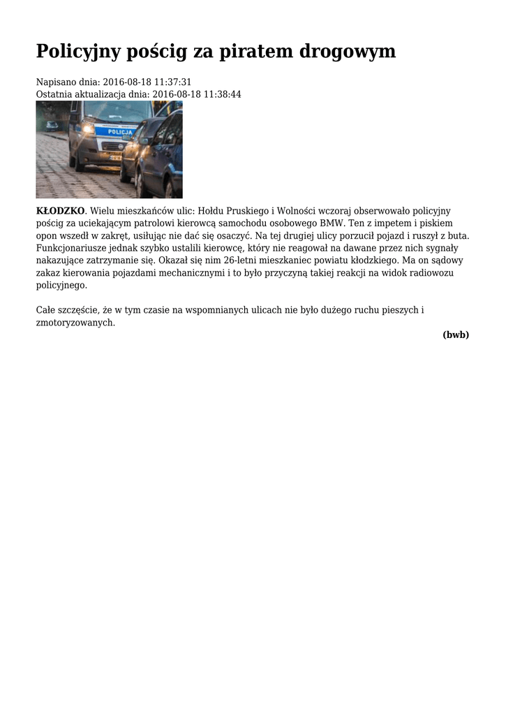 Policyjny pościg za piratem drogowym Napisano dnia: 2016-08-18 11:37:31 Ostatnia aktualizacja dnia: 2016-08-18 11:38:44 KŁODZKO. Wielu mieszkańców ulic: Hołdu Pruskiego i Wolności wczoraj obserwowało policyjny pościg za uciekającym patrolowi kierowcą samochodu osobowego BMW. Ten z impetem i piskiem opon wszedł w zakręt, usiłując nie dać się osaczyć. Na tej drugiej ulicy porzucił pojazd i ruszył z buta. Funkcjonariusze jednak szybko ustalili kierowcę, który nie reagował na dawane przez nich sygnały nakazujące zatrzymanie się. Okazał się nim 26-letni mieszkaniec powiatu kłodzkiego. Ma on sądowy zakaz kierowania pojazdami mechanicznymi i to było przyczyną takiej reakcji na widok radiowozu policyjnego. Całe szczęście, że w tym czasie na wspomnianych ulicach nie było dużego ruchu pieszych i zmotoryzowanych. (bwb)