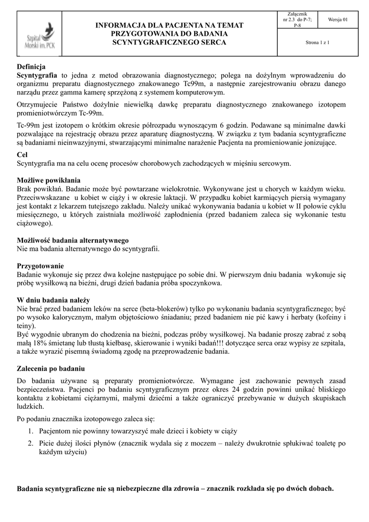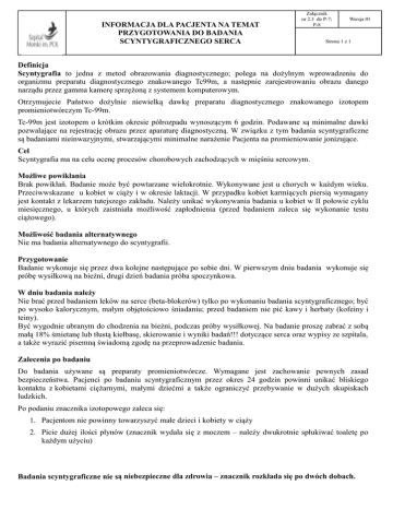 INFORMACJA DLA PACJENTA NA TEMAT PRZYGOTOWANIA DO BADANIA SCYNTYGRAFICZNEGO SERCA Załącznik nr 2.3 do P-7; P-8 Wersja 01 Strona 1 z 1 Definicja Scyntygrafia to jedna z metod obrazowania diagnostycznego; polega na dożylnym wprowadzeniu do organizmu preparatu diagnostycznego znakowanego Tc99m, a następnie zarejestrowaniu obrazu danego narządu przez gamma kamerę sprzężoną z systemem komputerowym. Otrzymujecie Państwo dożylnie niewielką dawkę preparatu diagnostycznego znakowanego izotopem promieniotwórczym Tc-99m. Tc-99m jest izotopem o krótkim okresie półrozpadu wynoszącym 6 godzin. Podawane są minimalne dawki pozwalające na rejestrację obrazu przez aparaturę diagnostyczną. W związku z tym badania scyntygraficzne są badaniami nieinwazyjnymi, stwarzającymi minimalne narażenie Pacjenta na promieniowanie jonizujące. Cel Scyntygrafia ma na celu ocenę procesów chorobowych zachodzących w mięśniu sercowym. Możliwe powikłania Brak powikłań. Badanie może być powtarzane wielokrotnie. Wykonywane jest u chorych w każdym wieku. Przeciwwskazane u kobiet w ciąży i w okresie laktacji. W przypadku kobiet karmiących piersią wymagany jest kontakt z lekarzem tutejszego zakładu. Należy unikać wykonywania badania u kobiet w II połowie cyklu miesięcznego, u których zaistniała możliwość zapłodnienia (przed badaniem zaleca się wykonanie testu ciążowego). Możliwość badania alternatywnego Nie ma badania alternatywnego do scyntygrafii. Przygotowanie Badanie wykonuje się przez dwa kolejne następujące po sobie dni. W pierwszym dniu badania wykonuje się próbę wysiłkową na bieżni, drugi dzień badania próba spoczynkowa. W dniu badania należy Nie brać przed badaniem leków na serce (beta-blokerów) tylko po wykonaniu badania scyntygraficznego; być po wysoko kalorycznym, małym objętościowo śniadaniu; przed badaniem nie pić kawy i herbaty (kofeiny i teiny). Być wygodnie ubranym do chodzenia na bieżni, podczas próby wysiłkowej. Na badanie proszę zabrać z sobą małą 18% śmietanę lub tłustą kiełbasę, skierowanie i wyniki badań!!! dotyczące serca oraz wypisy ze szpitala, a także wyrazić pisemną świadomą zgodę na przeprowadzenie badania. Zalecenia po badaniu Do badania używane są preparaty promieniotwórcze. Wymagane jest zachowanie pewnych zasad bezpieczeństwa. Pacjenci po badaniu scyntygraficznym przez okres 24 godzin powinni unikać bliskiego kontaktu z kobietami ciężarnymi, małymi dziećmi a także ograniczyć przebywanie w dużych skupiskach ludzkich. Po podaniu znacznika izotopowego zaleca się: 1. Pacjentom nie powinny towarzyszyć małe dzieci i kobiety w ciąży 2. Picie dużej ilości płynów (znacznik wydala się z moczem – należy dwukrotnie spłukiwać toaletę po każdym użyciu) Badania scyntygraficzne nie są niebezpieczne dla zdrowia – znacznik rozkłada się po dwóch dobach.