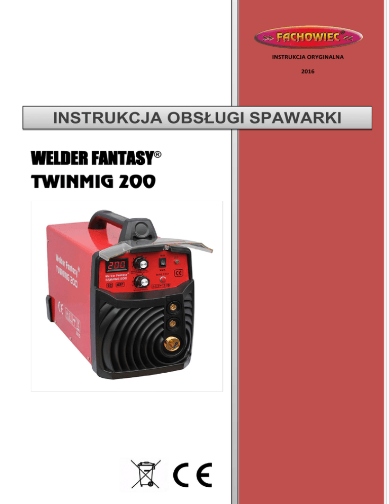 INSTRUKCJA ORYGINALNA 2016 INSTRUKCJA OBSŁUGI SPAWARKI WELDER FANTASY® INSTRUKCJA OBSŁUGI – WELDER FANTASY MAGICMIG Przed przystąpieniem do eksploatacji niniejszego urządzenia przeczytaj całą instrukcję ze zrozumieniem i zachowaj ją do przyszłego użytku SPIS TREŚCI 1. ZASADY BEZPIECZEŃSTWA, OPIS SYMBOLI ................................................................................ 3 2. PRZEZNACZENIE .......................................................................................................................... 6 3. OPIS URZĄDZENIA....................................................................................................................... 6 4. DANE TECHNICZNE ..................................................................................................................... 6 5. OBSŁUGA URZĄDZENIA ............................................................................................................. 7 A. PRZED PRZYSTĄPIENIEM DO PRACY: ........................................................................................... 7 B. MONTAŻ SZPULI Z DRUTEM SPAWALNICZYM............................................................................. 9 C. INSTALACJA BUTLI Z GAZEM OSŁONOWYM .............................................................................. 10 6. PROCES SPAWANIA MIG/MAG ................................................................................................. 11 7. OBSŁUGA BIEŻĄCA URZĄDZENIA .............................................................................................. 12 A. WARUNKI PRACY ....................................................................................................................... 12 B. BEZPIECZEŃSTWO PRACY .......................................................................................................... 12 C. ŚRODKI OSTROŻNOŚCI:.............................................................................................................. 12 D. KONSERWACJA .......................................................................................................................... 13 E. SCHEMAT PODŁĄCZENIA WTYCZEK ZASILAJĄCYCH .................................................................. 14 8. ROZWIĄZYWANIE PROBLEMÓW .............................................................................................. 15 9. SCHEMAT ELEKTRYCZNY ........................................................................................................... 16 10. EKOLOGIA ................................................................................................................................. 16 11. DEKLARACJA ZGODNOŚCI WE .................................................................................................. 18 12. NOTATKI.................................................................................................................................... 23 WYKAZ ILUSTRACJI Rys 1. TWINMIG 200 panel przedni ...................................................................................................... 8 Rys 2. Kierunek obrotu szpuli z drutem spawalniczym (zdjęcie poglądowe) ..................................... 10 Rys 3. Widok ściany tylnej urządzenia ................................................................................................ 10 Rys 4. Spawanie MIG/MAG - schemat ................................................................................................ 11 Rys 5. Schemat elektryczny ................................................................................................................. 16 Strona 2 z 24 INSTRUKCJA OBSŁUGI – WELDER FANTASY MAGICMIG WYKAZ TABEL Tabela 1. Dane techniczne....................................................................................................................... 6 Tabela 2. Biegunowość spawania dla poszczególnych metod .............................................................. 12 Tabela 3. Rozwiązywanie problemów ................................................................................................... 15 1. ZASADY BEZPIECZEŃSTWA, OPIS SYMBOLI Należy bezwzględnie zapoznać się z poniższymi oznaczeniami oraz zasadami bezpieczeństwa w celu ochrony zdrowia i życia własnego oraz innych osób. Przeczytaj instrukcję przed uruchomieniem urządzenia. Używaj wyłącznie oryginalnego wyposażenia dostarczonego przez producenta. Niektóre podzespoły mogą eksplodować. Zawsze używaj osłony twarzy oraz odzieży ochronnej z długimi rękawami. Napięcie statyczne może uszkodzić podzespoły elektroniczne. Używaj atestowanych osłon twarzy oraz tarcz spawalniczych. Zawsze używaj odzieży ochronnej przeznaczonej dla spawaczy. Odpryski metalu mogą uszkodzić oczy. Zawsze korzystaj z okularów ochronnych. Porażenie prądem elektrycznym może spowodować śmierć. Nie dotykaj podzespołów elektryczny gdy urządzenie podłączone jest do zasilania. Używaj suchych i kompletnych rękawic ochronnych i odzieży ochronnej. Gazy i opary mogą być niebezpieczne dla zdrowia. Podczas procesu spawania wydobywają się gazy i opary spawalnicze. Wdychanie tych substancji może być niebezpieczne dla zdrowia. Ochrona wzroku filtrami spawalniczymi. W zależności od stosowanego natężenia prądu, używaj tarcz ochronnych z odpowiednimi filtrami. Strona 3 z 24 INSTRUKCJA OBSŁUGI – WELDER FANTASY MAGICMIG Części ruchome urządzenia mogą spowodować urazy. Zbyt długa ciągła praca może spowodować przegrzanie urządzenia. Odczekaj do momentu wystudzenia się urządzenia. Postępuj zgodnie z wytycznymi w rozdziale „Sprawność i zabezpieczenie termiczne”. Uszkodzone butle z gazami technicznymi mogą eksplodować. W butlach zgromadzony jest gaz pod wysokim ciśnieniem. Upewnij się, że butle obsługiwane są i przechowywane zgodnie z wymogami BHP i P.POŻ. Spawane elementy mogą poparzyć. Wystający drut z palnika jest ostry i może spowodować przeb