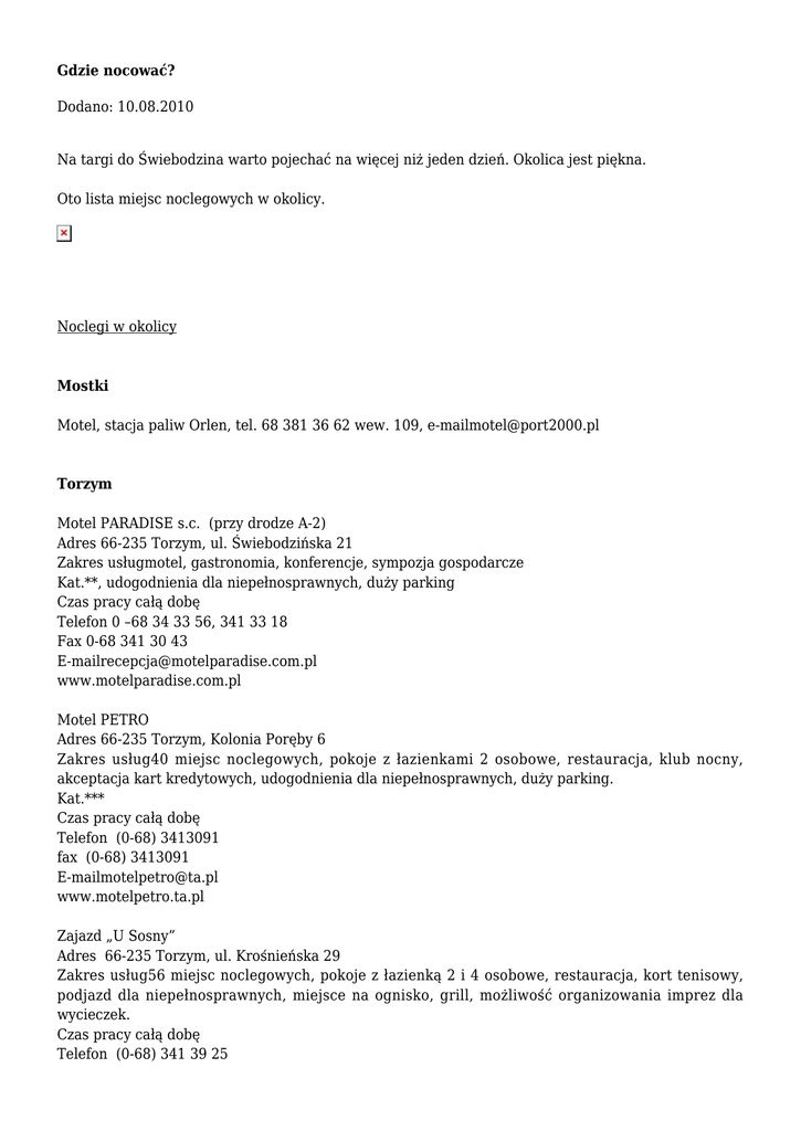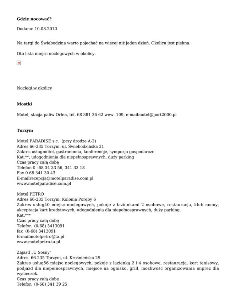 Gdzie nocować? Dodano: 10.08.2010 Na targi do Świebodzina warto pojechać na więcej niż jeden dzień. Okolica jest piękna. Oto lista miejsc noclegowych w okolicy. Noclegi w okolicy Mostki Motel, stacja paliw Orlen, tel. 68 381 36 62 wew. 109, [email protected] Torzym Motel PARADISE s.c. (przy drodze A-2) Adres 66-235 Torzym, ul. Świebodzińska 21 Zakres usługmotel, gastronomia, konferencje, sympozja gospodarcze Kat.**, udogodnienia dla niepełnosprawnych, duży parking Czas pracy całą dobę Telefon 0 –68 34 33 56, 341 33 18 Fax 0-68 341 30 43 [email protected] www.motelparadise.com.pl Motel PETRO Adres 66-235 Torzym, Kolonia Poręby 6 Zakres usług40 miejsc noclegowych, pokoje z łazienkami 2 osobowe, restauracja, klub nocny, akceptacja kart kredytowych, udogodnienia dla niepełnosprawnych, duży parking. Kat.*** Czas pracy całą dobę Telefon (0-68) 3413091 fax (0-68) 3413091 [email protected] www.motelpetro.ta.pl Zajazd „U Sosny” Adres 66-235 Torzym, ul. Krośnieńska 29 Zakres usług56 miejsc noclegowych, pokoje z łazienką 2 i 4 osobowe, restauracja, kort tenisowy, podjazd dla niepełnosprawnych, miejsce na ognisko, grill, możliwość organizowania imprez dla wycieczek. Czas pracy całą dobę Telefon (0-68) 341 39 25 fax (0-68) 341 39 25 [email protected] www.usosny.republika.pl Zajazd „Chrobry” ( przy drodze A-2) Adres 66-235 Torzym, ul. Warszawska 19 Zakres usług34 miejsca noclegowe, w tymapartamenty, pokoje 2 i 4 osobowe z łazienką. Restauracja – kuchnia staropolska, bar, punkt wymiany walut, akceptacja kart kredytowych, udogodnienia dla niepełnosprawnych - podjazdy, organizacja dancingów, akceptacja zwierząt. Czas pracy czynny całą dobę Telefon (0-68) 341 34 80 fax (0-68) 341 34 80 MARKO Adres 66-235 Torzym, ul. Wojska Polskiego 40A Zakres usług 20 miejsc noclegowych, pokoje 2 i 3 osobowe z łazienkami. Restauracja. Parking dozorowany, akceptacja zwierząt, akceptacja kart kredytowych. Czas pracy całą dobę Telefon 0-68 341 34 12 www.spangshus.dk/marco/marcopol.htm Boczów Motel U OLKA - Suchecki Aleksander Adres 66-235 Torzym, Boczów ul. Sikorskiego 25 Zakres usług58 miejsc noclegowych, pokoje 2 i 4 osobowe z łazienkami, parking. Czas pracy czynny całą dobę Telefon (0-68) 341 40 05 [email protected] www.moteluolka.pl POD LWEM Adres 66-235 Torzym, Boczów Pl. Konst. 3-go Maja 2 Zakres usług12 miejsc noclegowych, pokoje z łazienkami 3 osobowe, parking dozorowany. Czas pracy czynny całą dobę Telefon (0-68) 341 40 84 NAD JEZIOREM ( przy drodze A-2) Adres 66-235 Torzym, Boczów Zbigniew Hanas, Zakres usług20 miejsc noclegowych, pokoje z łazienkami, bar- posiłki domowe, duży parking. Czas pracy czynny całą dobę Telefon (0-68) 341 40 77 Pokoje gościnne PRIMA Torzym Adres 66-235 Torzym, ul. Wojska Polskiego 57 Zakres usług4 pokoje dwuosobowe z łazienkami, bar Czas pracy całą dobę Pokoje Gościnne MIRA Adres 66-235 Torzym, ul. Jeziorna 19a Zakres usług pokoje z łazienkami Czas pracy całą dobe Telefon 0-68 341 38 66, (0-68) 3413091 Pokoje Gościnne Karpezo Maria Adres 66-235 Torzym, ul. Wojska Polskiego 31 Zakres usług pokoje Czas pracy całą dobe Telefon 0-68 341 3234 Roman Berens Adres 66-235 Torzym, ul. Krośnieńska 29 Zakres usług pokoje 5 miejsca noclegowe 13 Czas pracy całoroczny Telefon 0-68 341 3219 Wiktor Woźniak Adres 66-235 Torzym, wieś Drzewce 16/1 Zakres usług pokoje 3 miejsca noclegowe 8 Czas pracy całoroczny Telefon 0-68 341 3180 Marek Bródka Adres 66-235 Torzym, wieś Pniów 10 Zakres usług pokoje 5 miejsca noclegowe 10 Czas pracy całoroczny Telefon 0602753630 Gospodarstwo agroturystyczne Krystyna i Andrzej Wójtowicz Adres 66-235 Torzym, wieś Dębrznica 32 Zakres usług pokoje 3 miejsca noclegowe 6 pokój 1 miejsca noclegowe 9 Czas pracycałoroczne Telefon 0-68 341 3219; 0604425662 [email protected] www.newland.pl Garbicz Pałac MAGNAT Adres 66-235 Torzym, Garbicz 37 Zakres usług120 miejsc, w tym 60 pok. 2-osob., nocleg + wyżywienie, dostosowany do osób niepełnosprawnych, pokoje z łazienkami 2 osobowe, kryty basen, zabiegi rehabilitacyjne, restauracja, sala konferencyjna na 200 miejsc, kort tenisowy, stadnina koni, sauna, akceptacja kart kredytowych, organizacja imprez na zamówienie, jadalnia –200 miejsc Czas pracy czynny całą dobę Telefon (0-68) 341 40 61 fax 0-68 341 40 63 [email protected] www.palacmagnat.com "Garbiczówka" Adres 66-235 Torzym, Garbicz 34 Czas pracy01 lipiec - 31 sierpień Telefon 0683414003 [email protected] www.garbicz.biz.ly Świebodzin Hotel "Ideal" ul. Wojska Polskiego 12 66-200 Świebodzin tel.+48 68 381 04 35 fax .+48 68 381 04 34 [email protected] www.idealhotels.pl Hotel Lubuski ul. Piłsudskiego 20 66- 200 Świebodzin tel.+48 68 475 66 44 fax .+ 48 68 475 66 43 Hotel "Sen" ul. Gen. Świerczewskiego 1 66-200 Świebodzin tel.+48 68 475 66 44 fax .+48 68 475 66 43 [email protected] www.hotelsen.pl Szkolne Schronisko Młodzieżowe Os. Żaków 3 66-200 Świebodzin tel.+48 68 382 30 35, +48 606 483 092 fax .+48 68 382 30 35 Ośrodek Kolonijno Wczasowy Nowy Dworek 66-200 Świebodzin Nowy Dworek tel.tel.+48 68 382 22 31, 0 513 057 540 [email protected] nowydworek.com.pl Łagów Zamek Joanitów ul. Kościuszki 3 66-220 Łagów tel.+48 68 341 20 10 fax .+48 68 341 21 19 [email protected] www.zamek-lagow.pl Hotel "Patio" ul. Podgórna 8 66-220 Łagów tel.+48 68 341 21 68 fax .+48 68 341 21 68 Gospodarstwo Agroturystyczne "Róża" ul. Ogrodowa 6 66-220 Łagów tel.+48 68 341 22 06 fax .+48 68 341 22 50 Gospodarstwo Agroturystyczne - Stanisław Pisarek Zamęt 2 a 66-220 Łagów tel.+48 68 341 11 30, +48 601 539 221 Wanda Cichocka ul. Słoneczna 1 66-220 Łagów tel.+48 68 341 22 40, +48 605 737 848 www.uwandy-lagow.pl Kazimierz Bandura ul. Pensjonatowa 6 66-220 Łagów tel.+48 68 341 10 84 , +48 68 341 23 56 Gospodarstwo Agroturystyczne - Anna Kozacka ul. Słoneczna 9 66-220 Łagów tel.+48 68 341 23 34 [email protected] www.reges.pl/kozacka.htm Gospodarstwo Agrotury