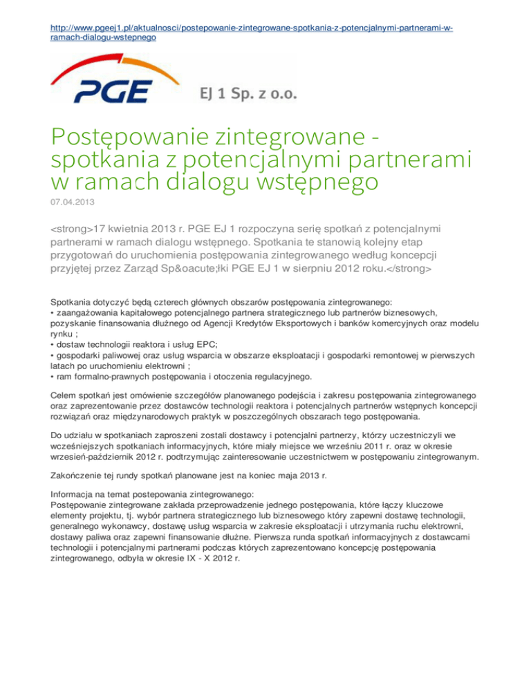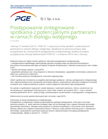 http://www.pgeej1.pl/aktualnosci/postepowanie-zintegrowane-spotkania-z-potencjalnymi-partnerami-wramach-dialogu-wstepnego Postępowanie zintegrowane spotkania z potencjalnymi partnerami w ramach dialogu wstępnego 07.04.2013 <strong>17 kwietnia 2013 r. PGE EJ 1 rozpoczyna serię spotkań z potencjalnymi partnerami w ramach dialogu wstępnego. Spotkania te stanowią kolejny etap przygotowań do uruchomienia postępowania zintegrowanego według koncepcji przyjętej przez Zarząd Spółki PGE EJ 1 w sierpniu 2012 roku.</strong> Spotkania dotyczyć będą czterech głównych obszarów postępowania zintegrowanego: • zaangażowania kapitałowego potencjalnego partnera strategicznego lub partnerów biznesowych, pozyskanie finansowania dłużnego od Agencji Kredytów Eksportowych i banków komercyjnych oraz modelu rynku ; • dostaw technologii reaktora i usług EPC; • gospodarki paliwowej oraz usług wsparcia w obszarze eksploatacji i gospodarki remontowej w pierwszych latach po uruchomieniu elektrowni ; • ram formalno-prawnych postępowania i otoczenia regulacyjnego. Celem spotkań jest omówienie szczegółów planowanego podejścia i zakresu postępowania zintegrowanego oraz zaprezentowanie przez dostawców technologii reaktora i potencjalnych partnerów wstępnych koncepcji rozwiązań oraz międzynarodowych praktyk w poszczególnych obszarach tego postępowania. Do udziału w spotkaniach zaproszeni zostali dostawcy i potencjalni partnerzy, którzy uczestniczyli we wcześniejszych spotkaniach informacyjnych, które miały miejsce we wrześniu 2011 r. oraz w okresie wrzesień-październik 2012 r. podtrzymując zainteresowanie uczestnictwem w postępowaniu zintegrowanym. Zakończenie tej rundy spotkań planowane jest na koniec maja 2013 r. Informacja na temat postepowania zintegrowanego: Postępowanie zintegrowane zakłada przeprowadzenie jednego postępowania, które łączy kluczowe elementy projektu, tj. wybór partnera strategicznego lub biznesowego który zapewni dostawę technologii, generalnego wykonawcy, dostawę usług wsparcia w zakresie eksploatacji i utrzymania ruchu elektrowni, dostawy paliwa oraz zapewni finansowanie dłużne. Pierwsza runda spotkań informacyjnych z dostawcami technologii i potencjalnymi partnerami podczas których zaprezentowano koncepcję postępowania zintegrowanego, odbyła w okresie IX - X 2012 r.