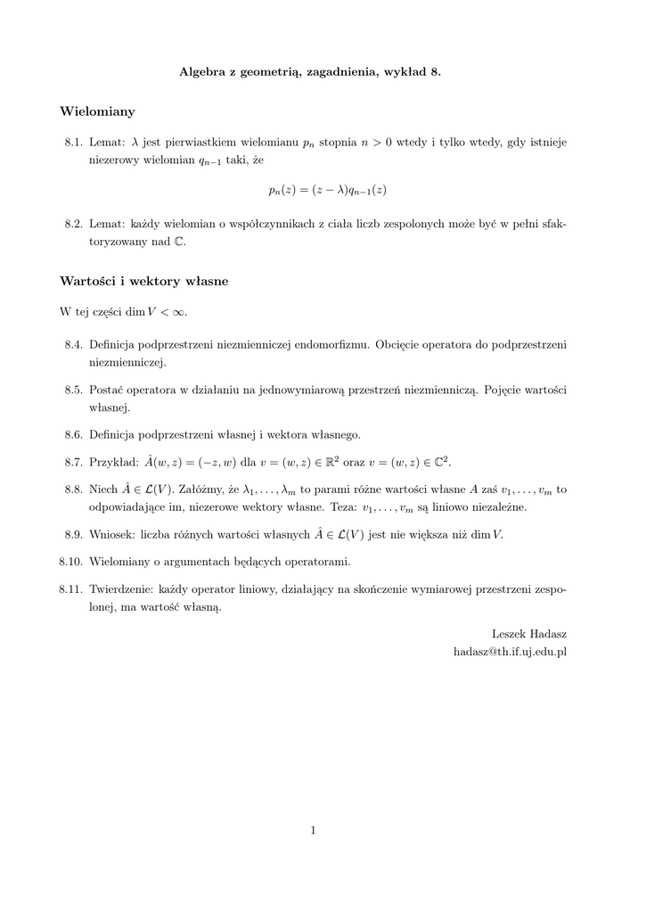 Algebra z geometrią, zagadnienia, wykład 8. Wielomiany 8.1. Lemat: λ jest pierwiastkiem wielomianu pn stopnia n > 0 wtedy i tylko wtedy, gdy istnieje niezerowy wielomian qn−1 taki, że pn (z) = (z − λ)qn−1 (z) 8.2. Lemat: każdy wielomian o współczynnikach z ciała liczb zespolonych może być w pełni sfaktoryzowany nad C. Wartości i wektory własne W tej części dim V < ∞. 8.4. Definicja podprzestrzeni niezmienniczej endomorfizmu. Obcięcie operatora do podprzestrzeni niezmienniczej. 8.5. Postać operatora w działaniu na jednowymiarową przestrzeń niezmienniczą. Pojęcie wartości własnej. 8.6. Definicja podprzestrzeni własnej i wektora własnego. 8.7. Przykład: Â(w, z) = (−z, w) dla v = (w, z) ∈ R2 oraz v = (w, z) ∈ C2 . 8.8. Niech  ∈ L(V ). Załóżmy, że λ1 , . . . , λm to parami różne wartości własne A zaś v1 , . . . , vm to odpowiadające im, niezerowe wektory własne. Teza: v1 , . . . , vm są liniowo niezależne. 8.9. Wniosek: liczba różnych wartości własnych  ∈ L(V ) jest nie większa niż dim V. 8.10. Wielomiany o argumentach będących operatorami. 8.11. Twierdzenie: każdy operator liniowy, działający na skończenie wymiarowej przestrzeni zespolonej, ma wartość własną. Leszek Hadasz [email protected] 1