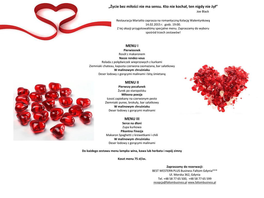 „Życie bez miłości nie ma sensu. Kto nie kochał, ten nigdy nie żył” Joe Black Restauracja Mariatto zaprasza na romantyczną Kolację Walentynkową 14.02.2015 r. godz. 19:00. Z tej okazji przygotowaliśmy specjalne menu. Zapraszamy do wyboru spośród trzech zestawów! MENU I Pierwiosnek Rosół z makaronem Nasze rendez-vous Rolada z polędwiczek wieprzowych z kurkami Ziemniaki chateau, kapusta czerwona zasmażana, bar sałatkowy W malinowym chruśniaku Deser lodowy z gorącymi malinami i bitą śmietaną MENU II Pierwszy pocałunek Żurek po staropolsku Miłosna poezja Łosoś zapiekany na czerwonym pesto Ziemniaki puree, brokuły, bar sałatkowy W malinowym chruśniaku Deser lodowy z gorącymi malinami MENU III Serce na dłoni Zupa kurkowa Pikantna Finezja Makaron Spaghetti z krewetkami i chili W malinowym chruśniaku Deser lodowy z gorącymi malinami Do każdego zestawu menu lampka wina, kawa lub herbata i napój zimny Koszt menu 75 zł/os. Zapraszamy do rezerwacji: BEST WESTERN PLUS Business Faltom Gdynia*** Ul. Morska 362, Gdynia Tel. +48 58 77 65 500, +48 58 77 65 599 [email protected] www.faltombusiness.pl