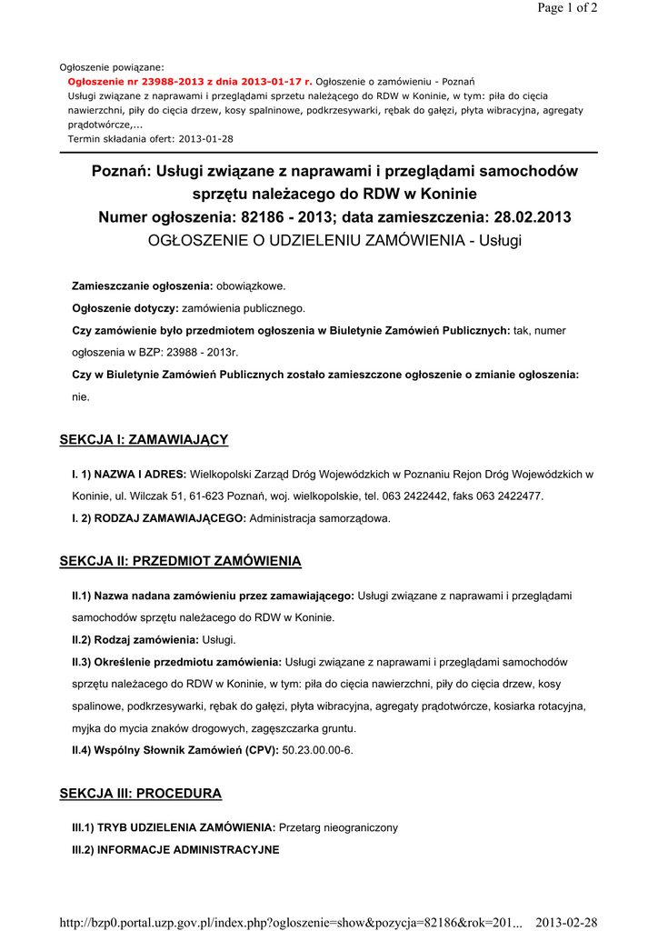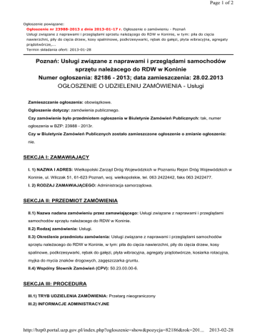 Page 1 of 2 Ogłoszenie powiązane: Ogłoszenie nr 23988-2013 z dnia 2013-01-17 r. Ogłoszenie o zamówieniu - Poznań Usługi związane z naprawami i przeglądami sprzetu naleŜącego do RDW w Koninie, w tym: piła do cięcia nawierzchni, piły do cięcia drzew, kosy spalninowe, podkrzesywarki, rębak do gałęzi, płyta wibracyjna, agregaty prądotwórcze,... Termin składania ofert: 2013-01-28 Poznań: Usługi związane z naprawami i przeglądami samochodów sprzętu naleŜacego do RDW w Koninie Numer ogłoszenia: 82186 - 2013; data zamieszczenia: 28.02.2013 OGŁOSZENIE O UDZIELENIU ZAMÓWIENIA - Usługi Zamieszczanie ogłoszenia: obowiązkowe. Ogłoszenie dotyczy: zamówienia publicznego. Czy zamówienie było przedmiotem ogłoszenia w Biuletynie Zamówień Publicznych: tak, numer ogłoszenia w BZP: 23988 - 2013r. Czy w Biuletynie Zamówień Publicznych zostało zamieszczone ogłoszenie o zmianie ogłoszenia: nie. SEKCJA I: ZAMAWIAJĄCY I. 1) NAZWA I ADRES: Wielkopolski Zarząd Dróg Wojewódzkich w Poznaniu Rejon Dróg Wojewódzkich w Koninie, ul. Wilczak 51, 61-623 Poznań, woj. wielkopolskie, tel. 063 2422442, faks 063 2422477. I. 2) RODZAJ ZAMAWIAJĄCEGO: Administracja samorządowa. SEKCJA II: PRZEDMIOT ZAMÓWIENIA II.1) Nazwa nadana zamówieniu przez zamawiającego: Usługi związane z naprawami i przeglądami samochodów sprzętu naleŜacego do RDW w Koninie. II.2) Rodzaj zamówienia: Usługi. II.3) Określenie przedmiotu zamówienia: Usługi związane z naprawami i przeglądami samochodów sprzętu naleŜacego do RDW w Koninie, w tym: piła do cięcia nawierzchni, piły do cięcia drzew, kosy spalinowe, podkrzesywarki, rębak do gałęzi, płyta wibracyjna, agregaty prądotwórcze, kosiarka rotacyjna, myjka do mycia znaków drogowych, zagęszczarka gruntu. II.4) Wspólny Słownik Zamówień (CPV): 50.23.00.00-6. SEKCJA III: PROCEDURA III.1) TRYB UDZIELENIA ZAMÓWIENIA: Przetarg nieograniczony III.2) INFORMACJE ADMINISTRACYJNE http://bzp0.portal.uzp.gov.pl/index.php?ogloszenie=show&pozycja=82186&rok=201... 2013-02-28 Page 2 of 2 Zamówienie dotyczy projektu/programu finansowanego ze środków Unii Europejskiej: nie SEKCJA IV: UDZIELENIE ZAMÓWIENIA IV.1) DATA UDZIELENIA ZAMÓWIENIA: 25.02.2013. IV.2) LICZBA OTRZYMANYCH OFERT: 2. IV.3) LICZBA ODRZUCONYCH OFERT: 0. IV.4) NAZWA I ADRES WYKONAWCY, KTÓREMU UDZIELONO ZAMÓWIENIA: PPHU AUTO - GRADECKI Grzegorz Gradecki, ul. Leśna 4, 62-590 Golina, kraj/woj. wielkopolskie. IV.5) Szacunkowa wartość zamówienia (bez VAT): 5500,00 PLN. IV.6) INFORMACJA O CENIE WYBRANEJ OFERTY ORAZ O OFERTACH Z NAJNIśSZĄ I NAJWYśSZĄ CENĄ Cena wybranej oferty: 6765,00 Oferta z najniŜszą ceną: 6765,00 / Oferta z najwyŜszą ceną: 10316,63 Waluta: PLN. http://bzp0.portal.uzp.gov.pl/index.php?ogloszenie=show&pozycja=82186&rok=201... 2013-02-28