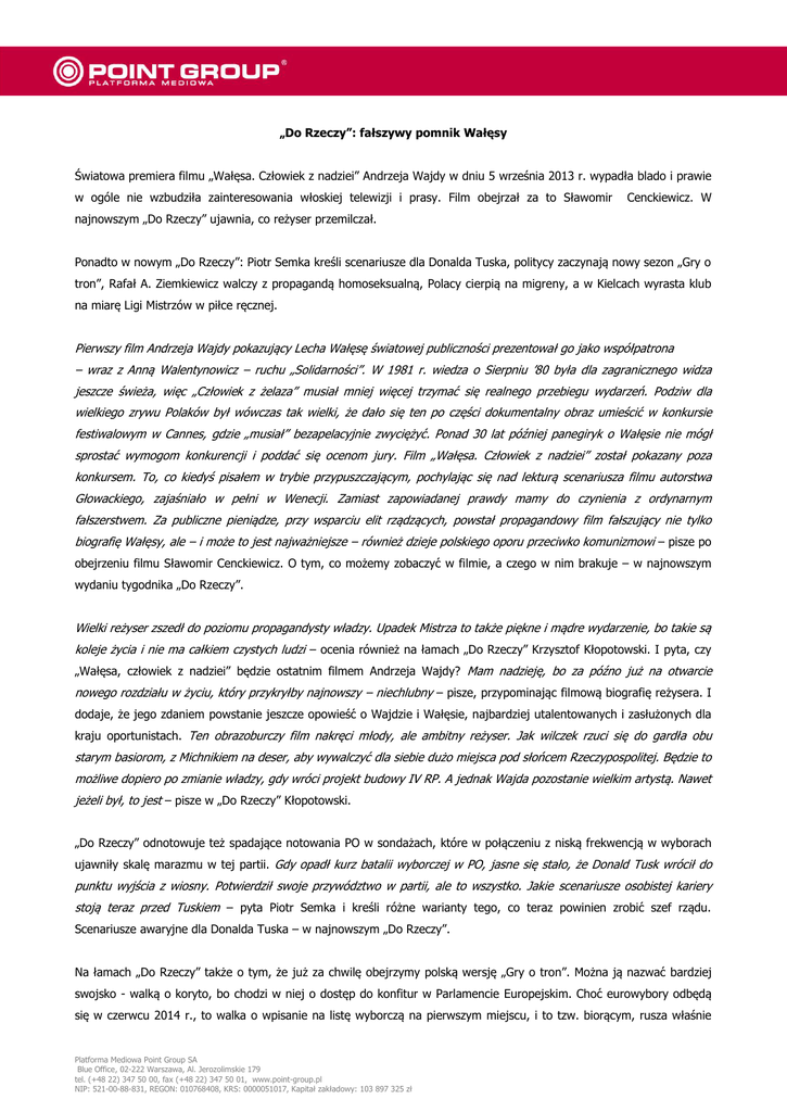 „Do Rzeczy”: fałszywy pomnik Wałęsy Światowa premiera filmu „Wałęsa. Człowiek z nadziei” Andrzeja Wajdy w dniu 5 września 2013 r. wypadła blado i prawie w ogóle nie wzbudziła zainteresowania włoskiej telewizji i prasy. Film obejrzał za to Sławomir Cenckiewicz. W najnowszym „Do Rzeczy” ujawnia, co reżyser przemilczał. Ponadto w nowym „Do Rzeczy”: Piotr Semka kreśli scenariusze dla Donalda Tuska, politycy zaczynają nowy sezon „Gry o tron”, Rafał A. Ziemkiewicz walczy z propagandą homoseksualną, Polacy cierpią na migreny, a w Kielcach wyrasta klub na miarę Ligi Mistrzów w piłce ręcznej. Pierwszy film Andrzeja Wajdy pokazujący Lecha Wałęsę światowej publiczności prezentował go jako współpatrona – wraz z Anną Walentynowicz – ruchu „Solidarności”. W 1981 r. wiedza o Sierpniu ’80 była dla zagranicznego widza jeszcze świeża, więc „Człowiek z żelaza” musiał mniej więcej trzymać się realnego przebiegu wydarzeń. Podziw dla wielkiego zrywu Polaków był wówczas tak wielki, że dało się ten po części dokumentalny obraz umieścić w konkursie festiwalowym w Cannes, gdzie „musiał” bezapelacyjnie zwyciężyć. Ponad 30 lat później panegiryk o Wałęsie nie mógł sprostać wymogom konkurencji i poddać się ocenom jury. Film „Wałęsa. Człowiek z nadziei” został pokazany poza konkursem. To, co kiedyś pisałem w trybie przypuszczającym, pochylając się nad lekturą scenariusza filmu autorstwa Głowackiego, zajaśniało w pełni w Wenecji. Zamiast zapowiadanej prawdy mamy do czynienia z ordynarnym fałszerstwem. Za publiczne pieniądze, przy wsparciu elit rządzących, powstał propagandowy film fałszujący nie tylko biografię Wałęsy, ale – i może to jest najważniejsze – również dzieje polskiego oporu przeciwko komunizmowi – pisze po obejrzeniu filmu Sławomir Cenckiewicz. O tym, co możemy zobaczyć w filmie, a czego w nim brakuje – w najnowszym wydaniu tygodnika „Do Rzeczy”. Wielki reżyser zszedł do poziomu propagandysty władzy. Upadek Mistrza to także piękne i mądre wydarzenie, bo takie są koleje życia i nie ma całkiem czystych ludzi – ocenia również na łamach „Do Rzeczy” Krzysztof Kłopotowski. I pyta, czy „Wałęsa, człowiek z nadziei” będzie ostatnim filmem Andrzeja Wajdy? Mam nadzieję, bo za późno już na otwarcie nowego rozdziału w życiu, który przykryłby najnowszy – niechlubny – pisze, przypominając filmową biografię reżysera. I dodaje, że jego zdaniem powstanie jeszcze opowieść o Wajdzie i Wałęsie, najbardziej utalentowanych i zasłużonych dla kraju oportunistach. Ten obrazoburczy film nakręci młody, ale ambitny reżyser. Jak wilczek rzuci się do gardła obu starym basiorom, z Michnikiem na deser, aby wywalczyć dla siebie dużo miejsca pod słońcem Rzeczypospolitej. Będzie to możliwe dopiero po zmianie władzy, gdy wróci projekt budowy IV RP. A jednak Wajda pozostanie wielkim artystą. Nawet jeżeli był, to jest – pisze w „Do Rzeczy” Kłopotowski. „Do Rzeczy” odnotowuje też spadające notowania PO w sondażach, które w połączeniu z niską frekwencją w wyborach ujawniły skalę marazmu w tej partii. Gdy opadł kurz batalii wyborczej w PO, jasne się stało, że Donald Tusk wrócił do punktu wyjścia z wiosny. Potwierdził swoje przywództwo w partii, ale to wszystko. Jakie scenariusze osobistej kariery stoją teraz przed Tuskiem – pyta Piotr Semka i kreśli różne warianty tego, co teraz powinien zrobić szef rządu. Scenariusze awaryjne dla Donalda Tuska – w najnowszym „Do Rzeczy”. Na łamach „Do Rzeczy” także o tym, że już za chwilę obejrzymy polską wersję „Gry o tron”. Można ją nazwać bardziej swojsko - walką o koryto, bo chodzi w niej o dostęp do konfitur w Parlamencie Europejskim. Choć eurowybory odbędą się w czerwcu 2014 r., to walka o wpisanie na listę wyborczą na pierwszym miejscu, i to tzw. biorącym, rusza właśnie Platforma Mediowa Point Group SA Blue Office, 02-222 Warszawa, Al. Jerozolimskie 179 tel. (+48 22) 347 50 00, fax (+48 22) 347 50 01, www.point-group.pl NIP: 521-00-88-831, REGON: 010768408, KRS: 0000051017, Kapitał zakładowy: 103 897 325 zł teraz. Trzeba będzie knuć i snuć intrygi przeciw konkurencji we własnej partii, bo chętnych na to samo miejsce są chmary. To ważniejsze niż późniejsza kampania wyborcza, bo większym zagrożeniem jest to, że kandydat zostanie wyprzedzony przez kogoś z własnej listy, niż rywalizacja z konkurentami z innych partii. I wreszcie najważniejsze: trzeba będzie podlizywać się „wodzom”, bo to oni decydują, kto zostanie dopuszczony do wyjątkowo obfitego korytka. Szefowie partii kupują w ten sposób posłuszeństwo albo obdarowują szansą na mandat zasłużonych towarzyszy niczym średniowieczny władca dobrami ziemskimi swoich wojów. W „Do Rzeczy” również Rafał A. Ziemkiewicz pisze o tym, jak wygrać z propagandą homoseksualną. Protesty przeciwko promowaniu homoseksualizmu, i nawet samo to określenie, są przez lewicowe salony stanowczo odrzucane, wyszydzane i obłożone anatemą. Nie należy się jednak temu poddawać. Na fali różowej rewolucji postrzeganie homoseksualizmu inaczej niż jako kanoniczną „wrodzoną odmienność” zostało co prawda całkowicie zdelegalizowane i − prawem przeskakiwania ze skrajności w skrajność – zaliczone do poglądów „faszystowskich”, ale jeszcze niedawno wcale tak nie było. A badania naukowe wcale nie są takie jednoznaczne. „Gejowskie maski” – w najnowszym wydaniu tygodnika „Do Rzeczy”. „Do Rzeczy” pisze też o problemie, który dotyka co dziesiątego z nas. W Polsce na migrenę cierpi około 10–11 proc. społeczeństwa. To więcej niż w krajach ościennych. Mamy wręcz do czynienia z epidemią bólów głowy - podkreśla prof. Adam Stępień, kierownik Kliniki Neurologii Wojskowego Instytutu Medycznego. Migrenowiec 