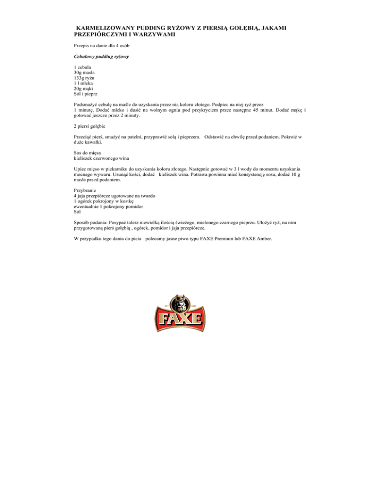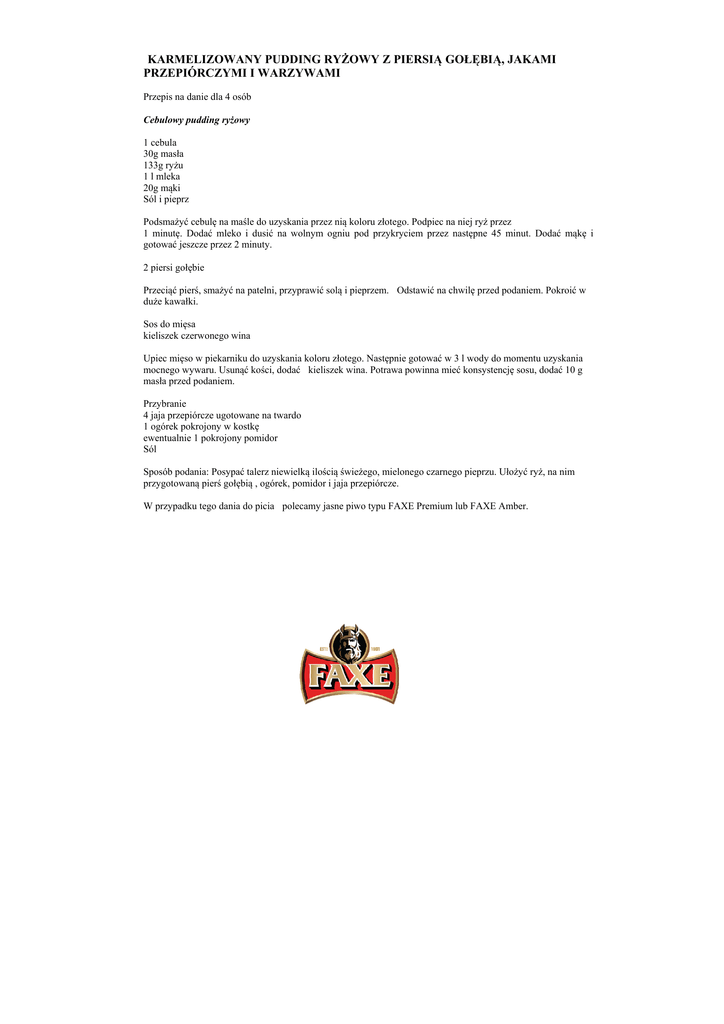 KARMELIZOWANY PUDDING RYŻOWY Z PIERSIĄ GOŁĘBIĄ, JAKAMI PRZEPIÓRCZYMI I WARZYWAMI Przepis na danie dla 4 osób Cebulowy pudding ryżowy 1 cebula 30g masła 133g ryżu 1 l mleka 20g mąki Sól i pieprz Podsmażyć cebulę na maśle do uzyskania przez nią koloru złotego. Podpiec na niej ryż przez 1 minutę. Dodać mleko i dusić na wolnym ogniu pod przykryciem przez następne 45 minut. Dodać mąkę i gotować jeszcze przez 2 minuty. 2 piersi gołębie Przeciąć pierś, smażyć na patelni, przyprawić solą i pieprzem. Odstawić na chwilę przed podaniem. Pokroić w duże kawałki. Sos do mięsa kieliszek czerwonego wina Upiec mięso w piekarniku do uzyskania koloru złotego. Następnie gotować w 3 l wody do momentu uzyskania mocnego wywaru. Usunąć kości, dodać kieliszek wina. Potrawa powinna mieć konsystencję sosu, dodać 10 g masła przed podaniem. Przybranie 4 jaja przepiórcze ugotowane na twardo 1 ogórek pokrojony w kostkę ewentualnie 1 pokrojony pomidor Sól Sposób podania: Posypać talerz niewielką ilością świeżego, mielonego czarnego pieprzu. Ułożyć ryż, na nim przygotowaną pierś gołębią , ogórek, pomidor i jaja przepiórcze. W przypadku tego dania do picia polecamy jasne piwo typu FAXE Premium lub FAXE Amber. SKONDENSOWANE MLEKO Z ORZESZKAMI, MALINY I PANNA COTTA Przepis na danie dla 4 osób Mleko karmelowe: 1 puszka mleko skondensowanego Gotować puszkę mleka skondensowanego w garnku przez ok. 4 godziny. Puszka musi być zamknięta. Potem chłodzić puszkę w dużej ilości zimnej wody. Malinowa panna cotta 4 tuby przeznaczone do żywności. Dostępne w sklepie rzemieślniczym (potrawa może być ewentualnie podana w innym naczyniu) 100g malinowego sorbetu lub 50 g soku malinowego 100 g śmietany 1 arkusz żelatyny Namoczyć żelatynę w zimnej wodzie. Podgrzać żelatynę w soku malinowym aż się rozpuści, nie gotować! Dodać śmietanę. Wlać do tuby, dokładnie zamknąć, można podawać w innym naczyniu. Schłodzić przed podaniem. Sposób podawania: przybrać słonymi orzeszkami, świeżymi malinami i szczyptą soli. W przypadku tego dania do picia polecamy ciemne, mocne piwa jak FAXE Festbock lub Faxe 10% czy Faxe Royal Strong 8%, LANGUSTY SMAŻONE W BUŁCE TARTEJ, DWA RODZAJE KALAFIORA Przepis na danie dla 4 osób Kalafior i puree tahina 1 cebula, drobno posiekana 20 g masła 300g kalafiora 50 ml śmietany 50 ml rosołu z kurczaka lub bulionu tanina (puree z ziarna sezamowego) szczypta curry Rozpuścić masło na patelni i smażyć na nim cebulę do uzyskania koloru złotego. Pokroić kalafiora, dodać do cebuli. Smażyć przez ok. 2 minuty. Dodać śmietanę, wywar z kurczaka oraz przyprawy i dusić przez kilka minut. Dokładnie wymieszać. Zdjąć patelnię z ognia, zostawić na około 2 minuty. Przyprawić solą i pieprzem. Kalafior szczypta curry szczypta papryki szczypta kminku 20g masła ¼ kalafiora podzielonego na części (różyczki) olej czosnkowy olej chili sól Najpierw na gorącą patelnię wrzucić przyprawy i smażyć przez chwilę. Dodać masło, poczekać aż zacznie skwierczeć, dodać kalafior i smażyć przez około 3 minuty. Zdjąć patelnię z ognia i dodać pozostałe składniki. Wymieszać. Langusty 4 duże langusty bułka tarta sól olej do smażenia Usunąć muszle, wypatroszyć langusty. Pokroić na niewielkie kawałki. Panierować w bułce tartej. Tak przygotowane kawałki posolić pod spodem i smażyć z obu stron do uzyskania koloru złotego. Ziarno żyta 1 mała szklanka ziarna żyta ½ l wody Namoczyć ziarno żyta na 24 godziny. Następnie gotować przez 10 minut, odcedzić, chłodzić przez około 30 minut. Smażyć przez chwilę na dużym ogniu w temp. 220 st. C. Sposób podawania: zmiksować i podawać na talerzu lub w odpowiedniej szklance. W przypadku tego dania do picia polecamy mocne piwa jak FAXE 10%, FAXE Royal Strong 8% lub Faxe Festbock. .
