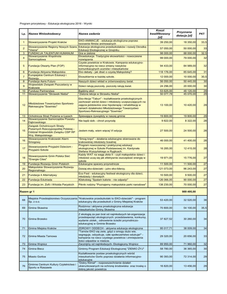 Program priorytetowy - Edukacja ekologiczna 2016 - Wyniki Lp. Nazwa Wnioskodawcy 1 2 3 4 5 6 7 8 9 10 11 12 13 14 15 16 EKO-ANIMACJE - edukacja ekologiczna poprzez tworzenie filmów animowanych Stowarzyszenie Regiony Nowych Szans Edukacja ekologiczna przedszkolaków i rozwój Ośrodka "Vesna" Edukacji Ekologicznej w Gnojniku FUNDACJA TALENTUM HUMANUM Gra w zielone Stowarzyszenie Wspólnota Ekoedukacja. Tradycyjne ekowartości - nowoczesne Samorządowa rozwiązania Czyste powietrze w Krakowie. Kampania edukacyjnoFundacja Otwarty Plan (FOP) informacyjna na rzecz zmiany nawyków komunikacyjnych uczniów i mieszkańców Fundacja Aktywna Małopolska Eko debaty - jak dbać o czystą Małopolskę? Europejskie Centrum Edukacji i Ekoszklarnia w każdej szkole. Rozwoju Fundacja Aeris Futuro Naszych dzieci wkład w zrównoważony świat. Wojewódzki Związek Pszczelarzy w Dzieci ratują pszczoły, pszczoły ratują świat. Krakowie Fundusz Partnerstwa Bądźmy eko! Stowarzyszenie "Skrawek Nieba" "Zielone lekcje w Skrawku Nieba" Stowarzyszenie Projekt Kraków Młodzieżowe Towarzystwo SportowoRekreacyjne "Sowiniec" Ochotnicza Straż Pożarna w Łazach Stowarzyszenie Samorządów Powiatu Dąbrowskiego Związek Ochotniczych Straży Pożarnych Rzeczypospolitej Polskiej Oddział Wojewódzki Związku OSP RP Woj. Małopolskiego Stowarzyszenie Krakowski Alarm Smogowy 17 Stowarzyszenie Przyjaźni Dzieciom Przyjaźni Szkole 18 Stowarzyszenie Gmin Polska Sieć "Energie Cites" 19 20 Nazwa zadania Fundacja Rozwoju Gmin Polskich Małopolskie Stowarzyszenie Rozwoju Regionalnego Koszt kwalifikowany [zł] 39 250,00 33,5 57 050,00 50 000,00 33 88 000,00 32,5 99 000,00 79 000,00 32 94 433,00 84 989,00 32 118 176,00 85 645,00 31 12 000,00 10 000,00 30,5 56 050,00 50 445,00 30 24 296,00 20 000,00 30 53 625,00 50 077,78 48 120,00 45 070,00 29 29 Eko-Akcja "Tabun" - kształtowanie proekologicznych zachowań wśród dzieci i młodzieży uczęszczających na zajęcia jeździeckie oraz hipoterapię i rehabilitację w ramach działalności Młodzieżowego Towarzystwo Sportowo-Rekreacyjnego "Sowiniec" 13 100,00 10 420,00 29 Śpiewające żywopłoty w naszej gminie 19 800,00 19 800,00 29 9 822,00 8 322,00 28 27 500,00 24 500,00 28 46 000,00 41 400,00 28 16 285,00 12 415,00 28 19 971,00 15 776,00 27 Nie bądź dzik - chroń przyrodę Jestem mały, wiem więcej VI edycja "Smog kręci" - działania edukacyjne skierowane do krakowskiej młodzieży licealnej Program nowoczesnej i praktycznej edukacji ekologicznej w Szkole Podstawowej im. Kardynała Stefana Wyszyńskiego w Ryglicach. Każdy WAT na wagę złota II - czyli małopolskie dzieci i młodzież uczą się jak efektywnie oszczędzać energię w szkole Edukacyjne spacery przyrodnicze 11 500,00 11 500,00 27 Dzisiaj eko-dzieciaki - jutro eko-liderzy. 121 073,00 96 243,00 27 10 500,00 9 500,00 27 126 066,00 90 000,00 27 138 230,00 70 000,00 27 21 Fundacja 4 Alternatywy 22 Fundacja Edutriada 23 Fundacja im. Zofii i Witolda Paryskich Piknik rodziny "Poznajemy małopolskie parki narodowe" Razem gr 1 989 495,00 68 Miejskie Przedsiębiorstwo Oczyszczania "Krakowskie przedszkolaki to EKO-dzieciaki" - program Sp. z o.o. edukacyjny dla przedszkoli z Gminy Miejskiej Kraków 69 Gmina Skawina 70 Gmina Brzesko 71 Gmina Miejska Kraków 72 Gmina Miasta Tarnowa 73 74 76 18 350,00 PKT 98 000,00 Eco Fest - edukacyjny festiwal ekologiczny dla dzieci, młodzieży i dorosłych #2ekobieg “Spalam kalorie - nie odpady!” 75 Przyznana dotacja [zł] 53 420,00 32 520,00 38 Rodzinna i aktywna proekologiczna edukacja mieszkańców Gminy Skawina 70 800,00 54 100,00 35,5 Z ekologią za pan brat od najmłodszych lat-organizacja przedsięwzięć ekologicznych: przedstawienia, konkursy, wydanie ulotek,, odnowienie ścieżki przyrodniczoedukacyjnej w Gminie Brzesko 37 827,52 30 260,00 34 95 017,71 38 009,00 34 29 320,00 20 656,00 33 Gmina Wojnicz ZDROWY ODDECH - aktywna edukacja ekologiczna "Tarnów EKO się zwie, gdyż o smogu dużo wie, segreguje, odzyskuje, całe społeczeństwo edukuje!" kampania na rzecz czystego powietrza i zmniejszenia ilości odpadów w mieście. Zacznijmy od najmłodszych- Ekologiczny Wojnicz 89 950,00 71 960,00 32 Gmina Biecz Gminny Program Edukacji Ekologicznej "ZIEMIO ŻYJ" 58 780,00 36 365,00 30 90 393,00 72 314,00 29 16 820,00 13 456,00 29 Kształtowanie postaw proekologicznych wśród mieszkańców Gorlic poprzez działania informacyjnoedukacyjne "Dobry Klimat" - rozpowszechnienie działań Gminne Centrum Kultury Czytelnictwa i ukierunkowanych na ochronę środowiska oraz troskę o Sportu w Rzezawie dobrą jakość powietrza Miasto Gorlice 77 78 79 80 81 82 83 84 85 86 87 88 Szkoła Podstawowa Nr 1 im. Adama Mickiewicza w krościenku nad Dunajcem Zespół Szkolno-Przedszkolny w Mochnaczce Wyżnej Powiat Wielicki Gmina Jordanów Publiczne Gimnazjum im.ks.Jana Patrzyka w Lipinkach Małgorzata Gostkowska-Morawiec Krakowska Żegluga Pasażerska Tarnowska Szkoła Wyższa Szkoła Podstawowa im. Marii Konopnickiej w Brzączowicach Miasto Nowy Sącz EKO NAD RZEKĄ -NADWIŚLAŃSKIE SPOTKANIA EKOLOGICZNE (edycja II) Wspólne "TAK" dla ekologii Znam, rozumiem, chronię - uczniowie szkoły dbają o środowisko Zabawa i edukacja w zdrowej atmosferze Logos Group s.c. Aldona Liburska, Marcin Liburski, Zbigniew Liburski Edukacja ekologiczna dzieci w wieku przedszkolnym, ich rodzin oraz najbliższego środowiska Gmina Myślenice Szkoła Podstawowa im. Królowej Jadwigi w Sierczy Eko - przedszkolacy - walczą ze smogiem "Ekologicznie zakręceni"- edukacja ekologiczna dzieci i dorosłych Szkolne ogródki w Gminie Krzeszowice jako miejsce edukacji ekologicznej Woda źródłem życia. Inspirujemy uczniów i społeczność lokalną do poznania i badania stanu środowiska wodnego, jego zagrożeń i możliwości ochrony Utworzenie EKOLOGICZNEGO OGRODU DYDAKTYCZNO-REKREACYJNEGO "ZIELONA KLASA" wraz z kampanią informacyjno-promocyjną 89 Gmina Krzeszowice 90 Gimnazjum w Tęgoborzy 91 Miasto Jordanów 9