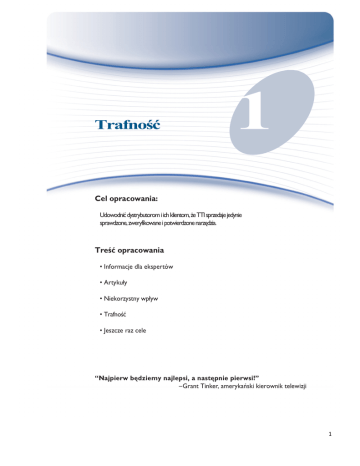 Chapter 11 – Validity Trafność 1 Cel opracowania: Udowodnić dystrybutorom i ich klientom, że TTI sprzedaje jedynie sprawdzone, zweryfikowane i potwierdzone narzędzia. Treść opracowania • Informacje dla ekspertów • Artykuły • Niekorzystny wpływ • Trafność • Jeszcze raz cele “Najpierw będziemy najlepsi, a następnie pierwsi!” –Grant Tinker, amerykański kierownik telewizji 1 Trafność Weryfikacja narzędzia Style Insights® DISC Od 1984 roku TTI zawsze korzysta z usług zewnętrznych, niezależnych statystyków w celu weryfikacji wszystkich kwestionariuszy. Ponowna weryfikacja odbywa się co kilka lat, to badanie zostało przeprowadzone w 2011 roku. Celem jest określenie wzorca dowodów, który definiuje narzędzie Style Insights jako rozsądne, rzetelne, trafne i użyteczne dla różnych celów w osobistym i organizacyjnym rozwoju oraz użyteczne dla organizacji i korporacji w różnych miejscach. Badanie i statystyki zostały przeprowadzone zgodnie z zaleceniami opublikowanymi w Standards for Educational and Psychological Testing (1999) przez Amerykańskie Towarzystwo Badań nad Edukacją, Amerykańskie Towarzystwo Psychologiczne i Krajową Radę Badań w Edukacji. Wytyczne dostarczają standardów, zgodnie z którymi projektowanych jest wiele amerykańskich i międzynarodowych narzędzi oceny. Celem jest respektowanie tych specyfikacji i zachęcenie czytelnika do zgłębienia szczegółów wspomnianych standardów. Zachęcamy również do aktywnego zadawania pytań dotyczących naszych pozostałych narzędzi na rynku i przekonania się, na ile te narzędzia podobnie jak narzędzia Style Insights są zgodne z podobnymi wytycznymi. 2 Trafność Mierzenie “stylu” – krótka historia Narzędzie Style Insights należy do kategorii nazywanej “testami osobowości”. TTI woli używać sformułowania „styl” zamiast „osobowość” z kilku powodów. Po pierwsze określenie „osobowość” jest bardzo złożonym ogólnym pojęciem wskazującym szeroki wachlarz zachowań i reakcji danej osoby. Po drugie, termin „styl”, tak jak początkowo zasugerował Fritz Perls, odnosi się raczej do tego, jak ktoś coś robi, co lepiej odpowiada celom narzędzi i raportów Style Insights. W przeszłości istniało wiele sposobów badania “osobowości” i “stylu”. Kraepelin w swoich wczesnych pracach (1892) zaprezentował test wolnych skojarzeń, w którym badanemu dostarcza się listę stymulujących słów i prosi się go o wymienienie pierwszych skojarzeń, które przychodzą mu do głowy. Metodologia wolnych skojarzeń była i jest używana do dzisiaj w różnorodnych celach badawczych. Metoda jest nadal krytykowane w kontekście wyników, rzetelności wewnętrznej oraz możliwości symulowania przez badanego. W odpowiedzi na krytykę związaną z wynikami i rzetelnością wewnętrzną pojawił się wynalazek samoopisu. Bardzo wczesna forma tej techniki została rozwinięta przez Woodwortha podczas I wojny światowej (Du-Bois, 1970, Goldberg, 1971, Symonds, 1931). Pierwotnym celem było stworzenie testu identyfikujących niezdolnych do służby wojskowej. Wojna skończyła się zanim model został wprowadzony w życie, rozwinięto jednak cywilne formy zarówno dla dorosłych, jak i dla dzieci. Woodworth Personal Data Sheet posłużył jako prototyp i wczesny model dla wielu późniejszych wynalazków. Niektóre projekty dotyczyły konkretnych obszarów, takie jak dostosowanie się w pracy, szkole, w domu itd. Inne badania skupiały się na interpersonalnych reakcjach w sytuacjach towarzyskich, jeszcze inne badania dotyczyły przede wszystkim zainteresowań i postaw. Narzędzia i raporty Style Insights opierają się właśnie na metodzie samoopisu. 3 Trafność Testy sytuacyjne to kolejne powszechnie używana metoda badań. W tym modelu badany jest proszony o wykonanie danego zadania, ocenia się go na podstawie tego, jak je wykonał. Konkretny cel niektórych testów tego rodzaju nie jest ujawniany badanym. Wczesne zastosowanie tego modelu zostało rozwinięte przez Hartshorne and May, et al., (1928, 1929, 1930) i ustandaryzowane dla dzieci w wieku szkolny. Testy sytuacyjne dla dorosłych zostały rozwinięte podczas II wojny światowej przez Assessment Program of the Office of Strategic Services. Jak na tamte czasy te testy były bardzo złożone, wymagały precyzyjnej aranżacji i umiejętnego zarządzania. Mimo to kwestie rzetelności wewnętrznej i interpretacji odpowiedzi były raczej subiektywne. Inną metodologią reprezentuje test projekcyjny. W tej metodzie badanemu przedstawia się niejednoznaczny lub otwarty problem lub opis będący bodźcem. Również w tym przypadku cele tych testów nie są znane badanemu – ma to na celu zredukowanie manipulowania lub symulowania podczas badania. Podobnie jak w przypadku wolnych skojarzeń i niektórych testów sytuacyjnych, również w przypadku testów projekcyjnych mogą zdarzyć się błędy w zakresie rzetelności wewnętrznej i różnic w wynikach spowodowane subiektywną naturą narzędzia. Narzędzie i raporty Style Insights wykorzystują metodologię samoopisu, która eliminuje wątpliwości w zakresie wewnętrznej rzetelności dzięki obiektywnemu sposobowi oceny wyników. Wykorzystując metodę samoopisu narzędzie dostarcza odpowiedzi w zakresie postrzegania samego siebie. Mimo wyeliminowania wątpliwości dotyczących wewnętrznej rzetelności, nieodłączną częścią narzędzi wykorzystujących metodę samoopisu jest precyzja odpowiedzi i koncentracja na postrzeganiu samego siebie. Dlatego też zawsze zachęca się respondenta do bycia szczerym i skupionym na danej sytuacji podczas udzielania odpowiedzi. Ta metodologia jest szeroko stosowana i adaptowana w wielu akademickich i komercyjnych obszarach. 4 Trafność Powiązania między DISC a narzędziami TTI W latach 1983-84 TTI nabyło na zasadzie umowy licencyjnej narzędzie oparte na metodzie DISC. Od tego czasu TTI zainwestowała z