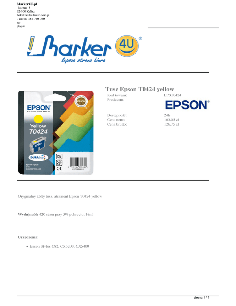 Marker4U.pl Boczna 5 62-800 Kalisz [email protected] Telefon: 884-760-760 gg: skype: Tusz Epson T0424 yellow Kod towaru: Producent: EPST0424 Dostępność: Cena netto: Cena brutto: 24h 103.05 zł 126.75 zł Oryginalny żółty tusz, atrament Epson T0424 yellow Wydajność: 420 stron przy 5% pokryciu, 16ml Urządzenia: Epson Stylus C82, CX5200, CX5400 strona 1 / 1 Powered by TCPDF (www.tcpdf.org)