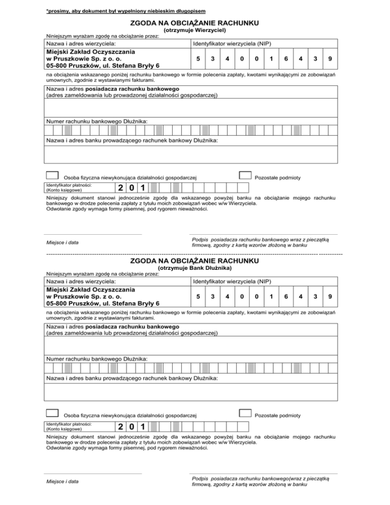 *prosimy, aby dokument był wypełniony niebieskim długopisem ZGODA NA OBCIĄŻANIE RACHUNKU (otrzymuje Wierzyciel) Niniejszym wyrażam zgodę na obciążanie przez: Nazwa i adres wierzyciela: Identyfikator wierzyciela (NIP) Miejski Zakład Oczyszczania w Pruszkowie Sp. z o. o. 05-800 Pruszków, ul. Stefana Bryły 6 5 3 4 0 0 1 6 4 3 9 na obciążenia wskazanego poniżej rachunku bankowego w formie polecenia zapłaty, kwotami wynikającymi ze zobowiązań umownych, zgodnie z wystawianymi fakturami. Nazwa i adres posiadacza rachunku bankowego (adres zameldowania lub prowadzonej działalności gospodarczej) Numer rachunku bankowego Dłużnika: _ 5 _ _ _ _ Nazwa i adres banku prowadzącego rachunek bankowy Dłużnika: Osoba fizyczna niewykonująca działalności gospodarczej Identyfikator płatności: (Konto księgowe) 2 0 1 -- Pozostałe podmioty -- Niniejszy dokument stanowi jednocześnie zgodę dla wskazanego powyżej banku na obciążanie mojego rachunku bankowego w drodze polecenia zapłaty z tytułu moich zobowiązań wobec w/w Wierzyciela. Odwołanie zgody wymaga formy pisemnej, pod rygorem nieważności. Podpis posiadacza rachunku bankowego wraz z pieczątką firmową, zgodny z kartą wzorów złożoną w banku Miejsce i data ----------------------------------------------------------------------------------------------------------------------------- ----------- ZGODA NA OBCIĄŻANIE RACHUNKU (otrzymuje Bank Dłużnika) Niniejszym wyrażam zgodę na obciążanie przez: Nazwa i adres wierzyciela: Identyfikator wierzyciela (NIP) Miejski Zakład Oczyszczania w Pruszkowie Sp. z o. o. 05-800 Pruszków, ul. Stefana Bryły 6 5 3 4 0 0 1 6 4 3 9 na obciążenia wskazanego poniżej rachunku bankowego w formie polecenia zapłaty, kwotami wynikającymi ze zobowiązań umownych, zgodnie z wystawianymi fakturami. Nazwa i adres posiadacza rachunku bankowego (adres zameldowania lub prowadzonej działalności gospodarczej) Numer rachunku bankowego Dłużnika: _ 5 _ _ _ _ Nazwa i adres banku prowadzącego rachunek bankowy Dłużnika: Osoba fizyczna niewykonująca działalności gospodarczej Identyfikator płatności: (Konto księgowe) 2 0 1 -- Pozostałe podmioty -- Niniejszy dokument stanowi jednocześnie zgodę dla wskazanego powyżej banku na obciążanie mojego rachunku bankowego w drodze polecenia zapłaty z tytułu moich zobowiązań wobec w/w Wierzyciela. Odwołanie zgody wymaga formy pisemnej, pod rygorem nieważności. Miejsce i data Podpis posiadacza rachunku bankowego(wraz z pieczątką firmową, zgodny z kartą wzorów złożoną w banku