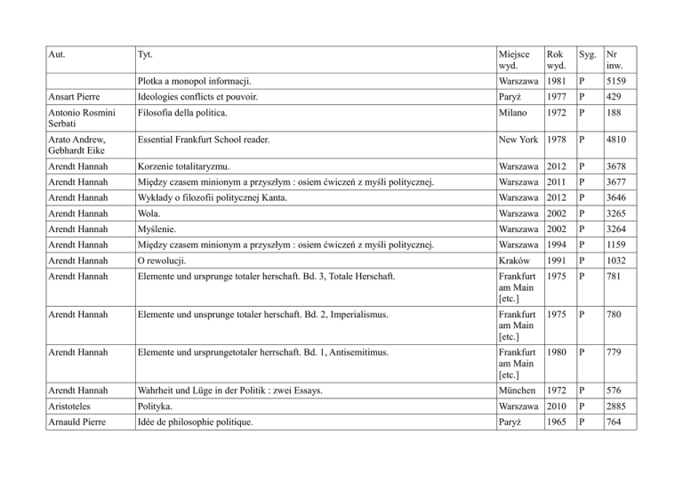 Aut. Tyt. Miejsce wyd. Plotka a monopol informacji. Ansart Pierre Rok wyd. Syg. Nr inw. Warszawa 1981 P 5159 Ideologies conflicts et pouvoir. Paryż 1977 P 429 Antonio Rosmini Serbati Filosofia della politica. Milano 1972 P 188 Arato Andrew, Gebhardt Eike Essential Frankfurt School reader. New York 1978 P 4810 Arendt Hannah Korzenie totalitaryzmu. Warszawa 2012 P 3678 Arendt Hannah Między czasem minionym a przyszłym : osiem ćwiczeń z myśli politycznej. Warszawa 2011 P 3677 Arendt Hannah Wykłady o filozofii politycznej Kanta. Warszawa 2012 P 3646 Arendt Hannah Wola. Warszawa 2002 P 3265 Arendt Hannah Myślenie. Warszawa 2002 P 3264 Arendt Hannah Między czasem minionym a przyszłym : osiem ćwiczeń z myśli politycznej. Warszawa 1994 P 1159 Arendt Hannah O rewolucji. Kraków 1991 P 1032 Arendt Hannah Elemente und ursprunge totaler herschaft. Bd. 3, Totale Herschaft. Frankfurt am Main [etc.] 1975 P 781 Arendt Hannah Elemente und unsprunge totaler herschaft. Bd. 2, Imperialismus. Frankfurt am Main [etc.] 1975 P 780 Arendt Hannah Elemente und ursprungetotaler herrschaft. Bd. 1, Antisemitimus. Frankfurt am Main [etc.] 1980 P 779 Arendt Hannah Wahrheit und Lüge in der Politik : zwei Essays. München 1972 P 576 Aristoteles Polityka. Warszawa 2010 P 2885 Arnauld Pierre Idée de philosophie politique. Paryż P 764 1965 Aron Raymond Widz i uczestnik. [Kraków] 1984 P 1041 Baczewska Monika Portrety przemocy : [filozofia - społeczeństwo - kultura]. Lublin 2008 P 2002 Baczko Bronisław Rousseau : samotność i wspólnota. Warszawa 1964 P 4301 Bakunin Mihail Aleksandrovič Pisma wybrane. T. 2. Warszawa 1965 P 2299 Bartuka Piotr Kara śmierci powracający dylemat. Kraków 2007 P 2693 Barut Arkadiusz Egotyzm, etyka, polityka : myśl konserwatywna Maurycego Barresa. Kraków 2009 P 2568 Biernacki Włodzimierz Władza, wolność, prawo : wybór tekstów z historii doktryn politycznych dla studiujących prawo, nauki polityczne i filozofię. Kraków 1994 P 1220 Blackburn Simon Platon: Państwo : biografia. Warszawa 2007 P 5543 Bocheński Józef Maria Katastrofa pacyfizmu : o patriotyzmie, założenia etyki wojskowej, teoria prawości żołnierskiej, teoria męstwa. Lublin 1989 P 5160 Bocheński Józef Maria Marksizm-leninizm: nauka czy wiara? Komorów 2006 P 3709 Bocheński Józef Maria Filozofia bolszewicka. Komorów 2008 P 3708 Bocian Andrzej F. Ekonomia, polityka, etyka : praca zbiorowa. T. 3. Białystok 2010 P 2555 Bogucka Iwona Etyka w administracji publicznej. Warszawa 2012 P 4635 Bohr Christoph, Raabe Stephan Nowy porządek wolności : etyka społeczna Jana Pawła II - wizja dla zjednoczonej Europy. Kraków ; 2007 Warszawa P 3187 Borowska Ewa Indie Chiny Rosja w badaniach Marksa: przyczynek do ontologii wspólnoty. Warszawa 1996 P 3634 Boucher David, Kelly Paul Joseph Myśliciele polityczni : od Sokratesa do współczesności. Kraków 2008 P 3758 Brunel Pierre Etat et le Souverain. Paryż 1978 P 430 Burke Edmund Rozważania o rewolucji we Francji i o debatach pewnych towarzystw londyńskich Kraków ; 1994 związanych z tym wydarzeniem, wyrażone w liście, który miał zostać wysłany do pewnego Warszawa gentlemana w Paryżu P 1377 Butryn Stanisław Główne kategorię ontologii marksistowskiej. Warszawa 1984 P 1879 Buttiglione Rocco Etyka wobec historii. Lublin 2005 P 2146 Chudy Wojciech Pedagogika godności : elementy etyki pedagogicznej. Lublin 2009 P 2130 Chyrowicz Barbara Zamiar i skutki : filozoficzna analiza zasady podwójnego skutku. Lublin 1997 P 2156 Chyrowicz Barbara Przedłużanie życia jako problem moralny. Lublin 2008 P 2134 Chyrowicz Barbara Etyka i technika w poszukiwaniu ludzkiej doskonałości. Lublin 2004 P 2133 Ciołkosz Adam Granice odwagi myślenia : marksizm w interpretacji Adama Schaffa. Londyn 1966 P 1929 Cohen Carl Communism, fascism and democracy : the theoretical foundations. New York 1972 P 4814 Copleston Frederick Historia filozofii. T. 10, Filozofia rosyjska. Warszawa 2009 P 5401 Copleston Frederick Historia filozofii. T. 9, Od Maine de Birana do Sartre'a. Warszawa 2006 P 5400 Copleston Frederick Historia filozofii. T. 8, Od Benthama do Russella. Warszawa 2006 P 5399 Copleston Frederick Historia filozofii. T. 7, Od Fichtego do Nietzschego. Warszawa 2006 P 5398 Copleston Frederick Historia filozofii. T. 6, Od Wolffa do Kanta. Warszawa 2008 P 5397 Copleston Frederick Historia filozofii. T. 5, Od Hobbesa do Hume'a. Warszawa 2009 P 5396 Copleston Frederick Historia filozofii. T. 4, Od Kartezjusza do Leibniza. Warszawa 2005 P 5395 Copleston Frederick Historia filozofii. T. 3, Od Ockhama do Suáreza. Warszawa 2004 P 5394 Copleston Frederick Historia filozofii. T. 2, Od Augustyna do Szkota. Warszawa 2004 P 5393 Copleston Frederick Historia filozofii. T. 4, Od Kartezjusza do Leibniza. Warszawa 1995 P 4178 Copleston Frederick Historia filozofii. T. 8, Od Benthama do Russella. Warszawa 1989 P 2160 Copleston Frederick Historia filozofii. T. 9, Od Maine de Birana do Sartre'a. Warszawa 1991 P 2159 Croce Benedetto Politics and Morals. Londyn 1946 P 4651 Czarnecki Paweł Etyka mediów. Warszawa 2008 P 4608 Czerniak Stanisław, Szahaj Andrzej Postmodernizm a filozofia : wybór tekstów. Warszawa 1996 P 3422 Czuba Krystyna Katolickie podstawy etyki dziennikarskiej. Toruń P 2031 2007 Delaney Tim Classical social theory: investigation and application. New Jersey 2004 P 3701 Del Vecchio Giorgio État et le droit : essais de philosophie politique. Paryż 1964 P 759 Dembiński Henryk Warszawa 1938 P 68 Dobrosielski Marian Z polityki i filozofii : szkice. Białystok 1988 P 901 Filipowicz Stanisław Historia idei politycznych. Wybór tekstów T. 1. Warszawa 2000 P 1303 Foerster Friedrich Wilhelm Etyka a polityka. Lwów 1926 P 4180 Fuller Benjamin Apthorp Gould Filozofia nowożytna. Warszawa 1967 P 1883 Fuller Benjamin Apthorp Gould Filozofia starożytna i średniowieczna. Warszawa 1966 P 1882 Fundacja na rzecz Nauki Polskiej Etyka w nauce. Warszawa 2003 P 1995 Gawor Leszek, Kosior 