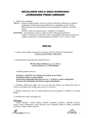 REGULAMIN AKCJI ORAZ KONKURSU „POMAGANIE PRZEZ UBRANIE” 1. Podstawowe definicje: AKCJA – oznacza zbiórkę odzieży, obuwia, toreb/ek, tekstyliów domowych i zabawek spełniających określone kryteria jakościowe z podziałem na rok szkolny. Skierowana jest do szkół podstawowych, przedszkoli i żłobków na terenie Polski. Udział w Akcji jest jednoznaczny z udziałem w Konkursie. KONKURS – jest określony czasowo i dotyczy tylko wybranych podmiotów. Udział w Konkursie jest możliwy tylko w przypadku aktywnego uczestnictwa (odbiór z pojemnika w danej lokalizacji minimum 1 raz w m-cu) w Akcji. AKCJA: 1. I edycja Akcji będzie trwała od 01 września 2016r do 30.06.2017 pod hasłem „POMAGANIE PRZEZ UBRANIE” 2. Organizatorem Akcji zbierania tekstyliów jest: 3R Recycling Solutions sp. z o.o. S.K.A. ul. Partyzancka 11, 21-020 Milejów a Beneficjentami Akcji są: Fundacja „AKOGO” Ewy Błaszczyk (region mazowiecki) Hospicjum Gajusz (region łódzki) Krakowskie Hospicjum dla Dzieci im. ks. J. Tichnera (region małopolski) Wrocławskie Hospicjum dla Dzieci (region dolnośląski) 3. Charakter zbiórki jest ciągły, tzn. trwa ona cały rok szkolny: po zakończeniu akcji w czerwcu, automatycznie rozpoczyna się ona we wrześniu. 4. Zbiórka adresowana jest do szkół podstawowych, przedszkoli i żłobków na terenie Polski. 5. Przedmiotem Akcji i Konkursu są: Zbieramy: odzież damską i męską (bluzki, spodnie, spodenki, spódnice, sukienki, koszule, swetry, bluzy, biustonosze, nową bieliznę, nowe skarpetki, płaszcze, kurtki, kompletne garnitury, czapki, szaliki, apaszki) 1 odzież dziecięcą i niemowlęcą odzież sportową torby, torebki, paski, biżuterię tekstylia domowe (pościel, kolorowe ręczniki, firany, zasłony, obrusy, szlafroki) obuwie damskie, męskie i dziecięce Nie przyjmujemy: rzeczy brudnych, mokrych, zatęchłych rzeczy odbarwionych, poplamionych i zmechaconych rzeczy podartych, dziurawych i poprutych rzeczy w sierści zwierząt i nieprzyjemnie pachnących kołder, poduszek, koców i dywanów 6. Cel główny Akcji i Konkursu: Propagowanie działań i zachowań proekologicznych i charytatywnych zarówno wśród dzieci i młodzieży, jak i osób dorosłych. Cele szczegółowe Akcji i Konkursu: — wzbudzanie prospołecznych postaw i wspieranie lokalnej instytucji charytatywnej; — finansowanie leczenia, rehabilitacji, bądź specjalistycznego sprzętu dla podopiecznych Beneficjentów w ramach pozyskanych środków. — forma integracji dla uczniów, ich rodziców, przyjaciół i nauczycieli — przełamywanie negatywnych stereotypów o ludziach dotkniętych chorobami, 2 — — — — — — — — — — niepełnosprawnością uświadomienie sobie możliwości niestandardowego podejścia do pomagania kształtowanie właściwych pro-ekologicznych odruchów i postaw u dzieci i młodzieży, a także u osób dorosłych zaangażowanych w akcję; wpływanie na świadomość ekologiczną dzieci i młodzieży oraz osób dorosłych; edukacja dzieci i młodzieży oraz osób dorosłych mających kontakt z placówkami oświatowymi w zakresie recyklingu; zachęcanie do działań na rzecz poprawy stanu środowiska naturalnego, rozpowszechnianie wiedzy na temat możliwości recyklingu tekstyliów. uzupełnienie nabytej w szkole wiedzy teoretycznej poprzez jej praktyczne zastosowanie; wzbudzenie świadomości że i ja dbam o środowisko i mam na nie wpływ; element pozytywnej rywalizacji naturalny sposób kształtowania liderów, wzmacniania więzi, zwiększania pozytywnej energii i motywacji 7. W przypadku placówek oświatowych do których zostanie skierowany list intencyjny udział w Akcji jest równoznaczny z wypełnieniem pisemnej Deklaracji uczestnika akcji przez dyrektora właściwej placówki, oraz wyznaczenia koordynatora odpowiedzialnego za kontakt z Organizatorem. 8. Organizator NIE przekazuje żadnego wynagrodzenia dla koordynatorów, a zebrane tekstylia odbiera bezpłatnie, tzn. uczestnik nie otrzymuje pieniędzy za surowiec, ani nie płaci za jego odebranie. 9. Uczestnik Akcji w swoim zakresie organizuje miejsce, gdzie będzie umieszczony pojemnik do zbiórki tekstyliów w placówce. Organizator zapewnia pojemnik do zbiórki tekstyliów. 10. Odbiór surowców odbywa się w cyklu 3 tygodniowym. Jeśli istnieje konieczność wcześniejszego opróżnienia pojemnika odbywa się on po pisemnym lub telefonicznym zgłoszeniu od koordynatora szkolnego do opiekuna akcji w danym regionie. 11. Za odbiór zebranych tekstyliów w poszczególnych regionach odpowiada sam Organizator Akcji. 12. Pojemnik do zbiórki tekstyliów jest własnością Organizatora i bez jego wiedzy nie wolno go usunąć ani zutylizować. 13. Każdy uczestnik Akcji/Konkursu otrzymuje od Organizatora: pisemną informację o celu prowadzonej zbiórki oraz niezbędne informacje o Beneficjencie, na rzecz którego gromadzony jest surowiec - informację o ilości odebranego surowca zgodnego z kryteriami - plakat Akcji - pisemne podziękowanie za uczestnictwo w zbiórce oraz dyplom dla koordynatora (wystawiane na koniec roku szkolnego). - II. KONKURS 3 1. Warunkiem uczestnictwa w Konkursie jest aktywne uczestnictwo w Akcji (odbiór m.in. raz w m-cu) oraz stosowanie jej regulaminu. 2. Konkurs trwa od 1 września do 30 czerwca każdego roku szkolnego. 3. W Konkursie rozpatrywane są tylko te ilości tekstyliów, które spłynęły do Organizatora w okresie między 1 września a 30 czerwca. 4. Organizatorem Konkursu zbierania tekstyliów jest: 3R Recycling Solutions sp. z o.o. S.K.A., który jest fundatorem nagród. 5. Konkurs jest skierowany do placówek publicznych: żłobków, przedszkoli, szkół podstawowych, z terenu Polski. 6. Każdy uczestnik Konkursu zostanie powiadomiony o terminie rozstrzygnięcia konkursu e-mailowo bądź pisemnie. Miesiącem kończącym Konkurs jest czerwiec. 7. Podczas rozstrzygnięcia konkursu (Finału) zostaną wręczone nagrody multimedialne o łącznej wartości