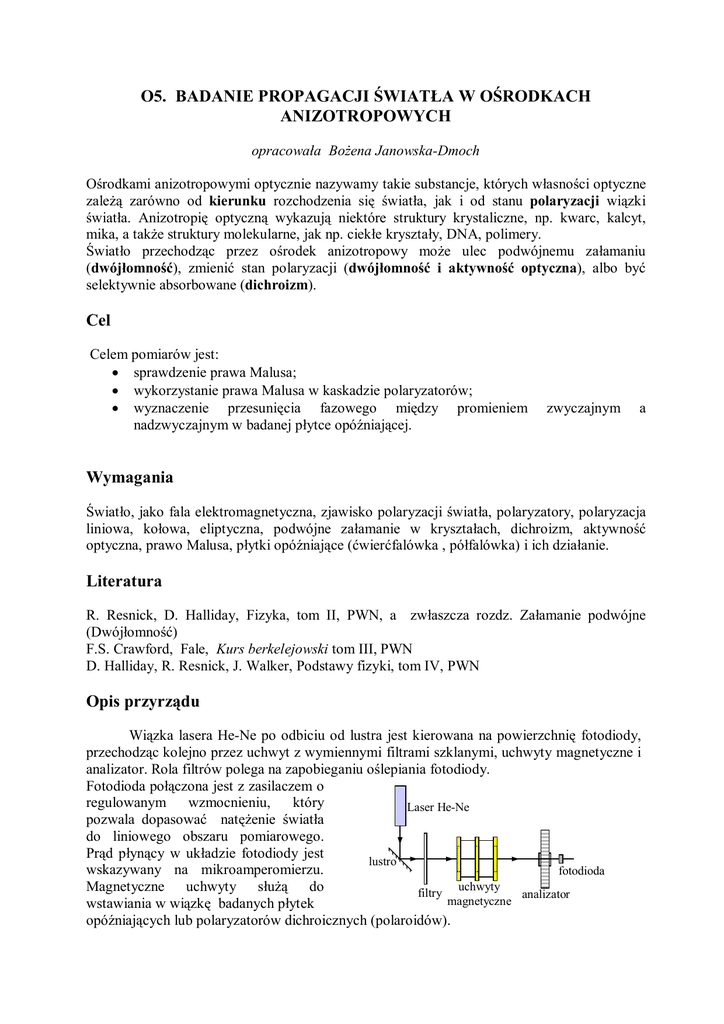 O5. BADANIE PROPAGACJI ŚWIATŁA W OŚRODKACH ANIZOTROPOWYCH opracowała Bożena Janowska-Dmoch Ośrodkami anizotropowymi optycznie nazywamy takie substancje, których własności optyczne zależą zarówno od kierunku rozchodzenia się światła, jak i od stanu polaryzacji wiązki światła. Anizotropię optyczną wykazują niektóre struktury krystaliczne, np. kwarc, kalcyt, mika, a także struktury molekularne, jak np. ciekłe kryształy, DNA, polimery. Światło przechodząc przez ośrodek anizotropowy może ulec podwójnemu załamaniu (dwójłomność), zmienić stan polaryzacji (dwójłomność i aktywność optyczna), albo być selektywnie absorbowane (dichroizm). Cel Celem pomiarów jest: sprawdzenie prawa Malusa; wykorzystanie prawa Malusa w kaskadzie polaryzatorów; wyznaczenie przesunięcia fazowego między promieniem nadzwyczajnym w badanej płytce opóźniającej. zwyczajnym a Wymagania Światło, jako fala elektromagnetyczna, zjawisko polaryzacji światła, polaryzatory, polaryzacja liniowa, kołowa, eliptyczna, podwójne załamanie w kryształach, dichroizm, aktywność optyczna, prawo Malusa, płytki opóźniające (ćwierćfalówka , półfalówka) i ich działanie. Literatura R. Resnick, D. Halliday, Fizyka, tom II, PWN, a zwłaszcza rozdz. Załamanie podwójne (Dwójłomność) F.S. Crawford, Fale, Kurs berkelejowski tom III, PWN D. Halliday, R. Resnick, J. Walker, Podstawy fizyki, tom IV, PWN Opis przyrządu Wiązka lasera He-Ne po odbiciu od lustra jest kierowana na powierzchnię fotodiody, przechodząc kolejno przez uchwyt z wymiennymi filtrami szklanymi, uchwyty magnetyczne i analizator. Rola filtrów polega na zapobieganiu oślepiania fotodiody. Fotodioda połączona jest z zasilaczem o regulowanym wzmocnieniu, który Laser He-Ne pozwala dopasować natężenie światła do liniowego obszaru pomiarowego. Prąd płynący w układzie fotodiody jest lustro wskazywany na mikroamperomierzu. fotodioda uchwyty Magnetyczne uchwyty służą do filtry analizator magnetyczne wstawiania w wiązkę badanych płytek opóźniających lub polaryzatorów dichroicznych (polaroidów). 2 Analizator, polaryzatory i płytki opóźniające zaopatrzone są w podziałki kątowe. Polaryzator dichroiczny jest to substancja anizotropowa, przez którą jedna składowa pola elektrycznego przechodzi praktycznie bez strat, podczas gdy druga składowa (prostopadła do pierwszej) jest silnie pochłaniana. Światło po przejściu przez polaryzator dichroiczny jest spolaryzowane liniowo. W ćwiczeniu stosowane są polaryzatory foliowe, tzw. polaroidy, należące do polaryzatorów dichroicznych. Polaroidy otrzymuje się ogrzewając i szybko rozciągając przezroczystą folię z alkoholu poliwinylowego. Alkohol poliwinylowy jest polimerem, którego długie łańcuchy węglowodorowe są początkowo ułożone chaotycznie. Podczas rozciągania cząsteczki układają się niemal równolegle do kierunku rozciągania. Po zanurzeniu folii w roztworze zawierającym jod cząsteczki stają się przewodzące, ponieważ elektrony walencyjne uzyskują swobodę ruchu, ale tylko wzdłuż łańcuchów. W rezultacie cząsteczki absorbują światło, którego pole elektryczne jest równoległe do ich długości, a światło, którego pole elektryczne jest prostopadłe do ich długości jest transmitowane bez strat. Oś transmisji polaryzatora jest prostopadła do łańcuchów molekularnych. Płytką opóźniającą nazywamy płasko równoległą płytkę wyciętą z materiału anizotropowego tak, że oś optyczna jest równoległa do jej powierzchni. Gdy na płytkę pada, prostopadle do jej powierzchni, wiązka światła monochromatycznego, spolaryzowanego liniowo, równolegle do osi optycznej, to w płytce rozchodzi się tylko fala nadzwyczajna. Gdy padające światło jest spolaryzowane prostopadle do osi optycznej, to w płytce rozchodzi się tylko fala zwyczajna. Przy dowolnej orientacji wektora pola elektrycznego fali padającej względem osi optycznej w płytce propagują się obie fale, zwyczajna i nadzwyczajna, z różnymi prędkościami fazowymi. Płytki opóźniające, zwane również płytkami fazowymi, służą do zmiany stanu polaryzacji światła. Wyprowadzenie wzorów Sprawdzanie prawa Malusa Niech wiązka liniowo spolaryzowanego światła, o amplitudzie E 0 , pada na polaryzator, którego oś transmisji tworzy kąt z kierunkiem drgań wektora pola elektrycznego fali świetlnej. Wtedy na wyjściu z polaryzatora amplituda fali jest równa E0 cos , a natężenie światła za E0 cos polaryzatorem zapiszemy I I 0 cos 2 , E0 kierunek transmisji polaryzatora gdzie amplituda natężenia I 0 ~ E 02 . Równanie powyższe jest prawem Malusa stwierdzającym, że natężenie światła za polaryzatorem, którego oś transmisji tworzy kąt z kierunkiem drgań wektora pola elektrycznego liniowo spolaryzowanej fali padającej, jest wprost proporcjonalne do kwadratu kosinusa kąta . Kaskada polaryzatorów Wiązka liniowo spolaryzowanego światła, o amplitudzie E 0 , pada na układ złożony z N polaryzatorów. Oś transmisji pierwszego polaryzatora tworzy kąt 900 z kierunkiem N 3 drgań wektora pola elektrycznego fali świetlnej. Każdy następny polaryzator ma oś transmisji obróconą o kąt względem poprzedniego. Ostatni, N-ty polaryzator ma oś transmisji prostopadłą do kierunku drgań wektora pola elektrycznego fali padającej. Korzystając z prawa Malusa, natężenie światła na wyjściu z N-tego polaryzatora zapiszemy I N I 0 N 1 cos 2 I 0 N 2 cos 4 I 0 1 cos2 ( N 1) I 0 cos 2 N . Gdy N = 2, to natężenie I 2 0, 25I 0 , czyli natężenie światła na wyjściu, o polaryzacji prostopadłej do wejściowej, stanowi 25% natężenia wejściowego, podczas gdy dla N = 10 natężenie I 10 0,78I 0 , czyli natężenie światła na wyjściu, o polaryzacji prostopadłej do wejściowej, stanowi aż 78% natężenia wejściowego. Badanie płytki opóźniającej Jeśli wektor natężenia pola elektrycznego E światła liniow