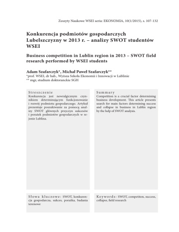 Zeszyty Naukowe WSEI seria: EKONOMIA, 10(1/2015), s. 107-132 Konkurencja podmiotów gospodarczych Lubelszczyzny w 2013 r. – analizy SWOT studentów WSEI Business competition in Lublin region in 2013 – SWOT field research performed by WSEI students Adam Szafarczyk*, Michał Paweł Szafarczyk** *prof. WSEI, dr hab., Wyższa Szkoła Ekonomii i Innowacji w Lublinie ** mgr, studium doktoranckie SGH Streszczenie Summar y S ł o w a k l u c z o w e : SWOT, konkurencja gospodarcza, sukces, porażka, badania terenowe K e y w o r d s : SWOT, competiton, success, Konkurencja jest newralgicznym czynnikiem determinującym funkcjonowanie i rozwój podmiotu gospodarczego. Artykuł prezentuje poszukiwanie za pomocą analizy SWOT głównych przyczyn sukcesów i porażek podmiotów gospodarczych w rejonie Lublina. Competition is a crucial factor determining business development. This article presents search for main factors determining success and collapse in business in Lublin region by the help of SWOT analysis. collapse, field research Zeszyty Naukowe WSEI seria: EKONOMIA, 10(1/2015) 108 WSEI Scientific Journal series: ECONOMICS, 10(1/2015) 1 . Wprowa d z en i e Prezentowane wyniki badań studentów WSEI wykorzystujących w tym celu analizy SWOT są już kolejnymi z serii.1Analizy przeprowadzone w poprzedniej edycji tego badania wskazały na konkurencję jako newralgiczny czynnik determinujący funkcjonowanie i rozwój podmiotu gospodarczego. Stąd też w przypadku obecnego podejścia skoncentrowano się na konkurencji podmiotów gospodarczych, a zwłaszcza jak sugerowano studentom chodziło o czynniki uzyskiwanych sukcesów i porażek w tym zakresie. Problematyka ta nawiązuje do Części V koncepcji sformułowanej przez Profesora A. Kuklińskiego2, przy czym ewidentnie dotyczy to kwestii sukcesu i porażki firmy, mniej natomiast transformacji jako czynnika sprawczego. Analiza SWOT niezależnie od swoich mankamentów umożliwia relatywnie szybką identyfikację kluczowych problemów analizowanych zagadnień, co jest między innymi podstawą podejścia określanego jako metoda węzłów gordyjskich lub też metoda aleksandryjska. Podobnie jak poprzednio dokonano próby identyfikacji węzłów gordyjskich, traktując je dwojako, zarówno jako kluczowy czynnik obciążający jak i też decydujący o „wielkim pchnięciu rozwojowym”. 2 . An a l i za S WOT – b a d an i a teren owe stu d entów Badania studentów WSEI przeprowadzono w dwóch turach (przez dwie niezależne względem siebie grupy studentów) w maju i w grudniu 2013 r. (poprzednie badanie to listopad – grudzień 2011 r.) – w obu wykorzystując do tego celu zmodyfikowaną wersją klasycznego podejścia SWOT tj. silnych i słabych stron oraz szans i zagrożeń. Modyfikacja dotyczyła ograniczenia ilości enumerowanych czynników do trzech a przynajmniej zaznaczenia na pełnym zestawie trzech traktowanych jako kluczowe dla danego podmiotu gospodarczego. Ponadto wszystkie wymieniane składniki powinny być ocenione w skali od zera do dziesięciu. Na podstawie uzyskanych informacji indywidualnych opracowano syntetyczne podejście dotyczące silnych i słabych stron oraz szans i zagrożeń prezentowane w poniższej tablicy. Dobór podmiotu pozostawiono studentów. Powinien on im być dobrze znany, a przynajmniej powinni tam pracować. Do zestawienia syntetycznego wykorzystano analizy odnoszące się do 175 podmiotów gospodarczych, a zatem o 73 więcej niż poprzednio. 1 2 Patrz szerzej: Adam Szafarczyk Michał P. Szafarczyk, Czynniki rozwoju lubelskiej regionalnej niszy rynkowej – analizy SWOT studentów WSEI, [w:] Strategiczna problematyka rozwoju Polski Wschodniej, WSEI Lublin 2010, D. J. Błaszczuk i M. Stefański (red.). Adam Szafarczyk, Michał Paweł Szafarczyk, Podmioty gospodarcze Lubelszczyzny – analizy SWOT studentów WSEI, [w:] Węzły gordyjskie rozwoju Polski Wschodniej, Zeszyty Naukowe WSEI Seria Ekonomia 3(1/2011). Antoni Kukliński, Problemowa Monografia Regionu Lubelskiego. Maszynopis powielony, Warszawa 31 sierpnia 2011. Adam Szafarczyk, Michał Paweł Szafarczyk Konkurencja podmiotów gospodarczych Lubelszczyzny w 2013 r. – analizy SWOT... 109 Wszystkie poszczególne składniki ujęto w następujące główne ich grupy, identyczne dla czterech segmentów SWOT: mocne strony, słabe strony, szanse, zagrożenia. Natomiast dalsza dezagregacja przy dążeniu do utrzymaniu stabilności kategorii uwzględniała specyfikę sytuacji. 3. Mo c ne st rony Dane dotyczące mocnych stron konkurencji podmiotów gospodarczych w Lubelskiej Niszy Rynkowej (LNR) zostaną przedstawione w tablicy nr 1. Tablica 1. Analiza SWOT konkurencji podmiotów gospodarczych Lubelskiej Niszy Rynkowej 2011 i 2013 r. Mocne strony. MOCNE STRONY Umiejętności wysokie kwalifikacje i umiejętności zawodowe pracowników kompetentna kadra kierownicza miła i fachowa obsługa profesjonalizm i doświadczenie efektywne zarządzanie Jakość szeroki asortyment produkowanych wyrobów wysoka jakość wykonywanych produktów i usług wdrożony system jakości indywidualne podejście do klienta ułatwienia dla klientów Ceny konkurencyjne ceny usług akceptowane przez nabywców Pozycja znana marka firmy dobra opinia klientów znacząca pozycja firmy na rynku Infrastruktura dobra lokalizacja firmy wyposażenie sieć Kontakty stali klienci współpraca z kontrahentami współpraca z konkurencją rozwijanie kontaktów za granicą konkurencja Inne marketing i reklama strategia pozostałe 2011 2013 Łączna Średnia warŁączna Średnia warLiczba ocen Liczba ocen kwota ocen tość ocen kwota ocen tość ocen 663 88 7,53 1004 117 8,58 251 32 7,84 334,5 41 8,16 44 101 168 99 883,5 6 14 22 14 129 7,33 7,21 7,64 7,07 6,85 72 105 387 105,5 1283 8 12 44 12 156 9,00 8,75 8,80 8,79 8,22 246,5 34 7,25 263,5 34 7,75 267 37 7,22 772,5 92 8,40 48 7 6,86 101 12 8,42 194 31 6,26 47 6 7,83 128 256 20 38 6,40 6,74 99 338 12 42 8,25 8,05 256 38 6,74 338 42 8,05 598 160 236 82 22 3