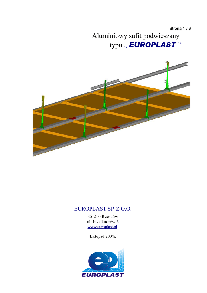 Strona 1 / 6 Aluminiowy sufit podwieszany typu „ EUROPLAST ” EUROPLAST SP. Z O.O. 35-210 Rzeszów ul. Instalatorów 3 www.europlast.pl Listopad 2004r. Strona 2 / 6 Sufit kasetonowy z elementów aluminiowych. 1. Budowa sufitu. Sufity składają się z aluminiowych kasetonów i listwy obrzeżającej, tworzących płaszczyznę sufitu oraz ze stalowych elementów konstrukcji podwieszenia. Zdj. Zabudowa korytarza 2. Zastosowanie. Prezentowany sufit podwieszany przeznaczony jest do stosowania jako wewnętrzna konstrukcja podstropowa o charakterze: dekoracyjnym – maskująca wszelkie instalacje zlokalizowane pod stropem, izolacji dźwiękochłonnej – po dodatkowym wypełnieniu aluminiowych elementów (kasetonów) wkładem tłumiącym, szczelnej membramy – po zaspoinowaniu styków kasetonów masą uszczelniającą (silikonem). Sufit podwieszany typu „EUROPLAST” jest szczególnie polecany do zastosowania w przemyśle farmaceutycznym oraz spożywczym. Ważnymi zaletami sufitu jest gładkość i jednolitość powierzchni, umożliwiająca łatwe utrzymanie czystości a także szczelność, pozwalająca na zmniejszenie kubatury pomieszczenia klimatyzowanego. Strona 3 / 6 3. Materiały i cechy konstrukcyjne. Kasetony – o wymiarach modularnych 600 x 600 mm, płaskie, wykonane z taśmy gładkiej lub perforowanej ze stopu aluminium AL. 99,5 H24 0,7 x 654 mm, pokrytej ze strony zewnętrznej lakierem poliestrowym, ze strony wewnętrznej lakierem ochronnym zgodnie z normami: - materiał i wykonanie wg UNI 3567/APO/H50, - odchyłki wymiarowe PN/M-02139 Dźwigary nośne – wykonane z taśmy stalowej OC/II St2S wg BN/0642-33 ocynkowanej Łącznik dźwigara – wykonany z taśmy stalowej OC/II St2S wg BN/0642-33 ocynkowanej Złącze dźwigara – wykonane z taśmy stalowej OC/II St2S wg BN/0642-33 ocynkowanej Noniusz – wykonany zgodnie z AT –06-0008/2003, Listwa noniusza – wykonana zgodnie z AT –06-0008/2003, Wieszak noniusza – wykonany zgodnie z AT –06-0008/2003, Wieszak górny noniusza – wykonany zgodnie z AT –06-0008/2003, Przetyczka – wykonana zgodnie z AT –06-0008/2003, Listwa przyścienna – wykonana z blachy aluminiowej wg BN/0642-33 Zatrzask boczny - wykonany z blachy aluminiowej wg BN/0642-33 Zdj. Zabudowa pomieszczeń Strona 4 / 6 4. Wytyczne montażu. określić poziom dolny stropu kasetonowego na podstawie wymiarów pomieszczenia dobrać optymalne rozłożenie kasetonów i dźwigarów określić długość wieszaka i przyciąć odpowiednio listwę noniusza (Typ I, Typ II) zamontować do stropu wieszak górny noniusza za pomocą kołków rozporowych – wieszaki mocowane zgodnie z kierunkiem składania dźwigarów (Lmax dźwigara=3000mm) według siatki wymiarowej 600 x 2400mm (Rys. 04-001-00) – na połączenia między dźwigarami stosować łącznik dźwigara nasunąć noniusz dolny na dźwigara za pomocą przetyczki połączyć wieszak z zamontowanym na dźwigarze noniuszem, równocześnie zwracając uwagę na prawidłowe ustawienie poziomu dolnego sufitu na ścianach zamocować listwy boczne po wykonaniu powyższych czynności kolejno zatrzaskuje się kasetony sufitowe w listwach bocznych, przycięte na wymiar kasetony, dodatkowo zacisnąć zatrzaskiem Przy zastosowaniu wieszaka noniusza (rys. 03), wysokość zabudowy H wynosi 200 – 900 mm, natomiast dla wieszaka noniusza górnego H=290 – 3190 mm. Rys.Wieszaki Strona 5 / 6 Wieszak górny noniusza Listwa noniusza H=290-3190mm P rzetyczka Noniusz Złącze dźwigara Dźwigar nośny Kaseton Rys. Sposób podwieszenie z wykorzystaniem wieszaka górnego noniusza. Łącznik dźwigara H=200-900mm Wieszak noniusza Rys. Podwieszenie z wieszakiem noniusza. Dźwigar Rys. Połączenie dźwigarów nośnych. 4.1. Wkład tłumiący. Dodatkowym wyposażeniem powodującym pochłanianie dźwięku jest wkład tłumiący. Wkład tłumiący stanowi wełna mineralna półtwarda. Wkład jest zabezpieczony folią ochronną. Strona 6 / 6 4.2. Szczelność. Silikonowanie. Szczelność sufitu uzyskuje się poprzez zaspoinowanie styków kasetonów masą uszczelniającą (silikonem). Do uszczelnienia sufitu stosuje się: Silikonowy neutralny preparat uszczelniający”Silirub 2” PZH AH 3/B-1426/96 „Silikone U”- silikonowy preparat uszczelniający PZH AH 3/B-1426/96 4.3. Osprzęt dodatkowy. System jest dostosowany do osprzętu oświetleniowego i wentylacyjnego kasetonowego o wymiarach 600x600, 600x1200mm. 5. Demontaż z ponownym montażem kasetonu rewizyjnego. Przeciąć masę uszczelniającą łączącą kaseton rewizyjny z pozostałymi kasetonami. Krok 1. Przymocować do kasetonu rewizyjnego weribor (urządzenie do przenoszenia szkła) trzyramienny lub dwa dwuramienne. Krok 2. Przez mocne pociągnięcie weribora pionowo w dół odtrzasnąć kaseton rewizyjny. Krok 3. Usunąć masę uszczelniającą z kasetonu rewizyjnego oraz kasetonów sąsiednich. Powierzchnie zmyć benzyną ekstrakcyjną. Krok 4. Ponownie zamontować kaseton rewizyjny i odmontować weribory. Krok 5. Szczelinę pomiędzy kasetonem rewizyjnym, a kasetonami sąsiednimi dokładnie wypełnić masą uszczelniającą (silikon). Usunąć nadmiar masy uszczelniającej. 6. Mycie i konserwacja sufitu kasetonowego. Powierzchnię sufitu podwieszanego stanowią kasetony 600x600 wykonane ze stopu aluminium AL.99,5H24 0,7x654 zabezpieczone antykorozyjnie poprzez lakierowanie proszkowe. Lakier proszkowy jest odporny na działanie substancji oleistych, kwasów tłuszczowych, smarów, alkoholi. Do czyszczenia zabrudzeń można stosować terpentynę, alkohole i benzynę. Do standardowego utrzymania czystości nadają się wyśmienicie neutralne i alkaliczne środki czyszczące, w których aktywną substancją czyszczącą są fosforany, mydła i środki zmiękczające (np. Ludwik). Nie należy stosować środków czyszczących do szorowania, gdyż powodują zmatowienie powierzchni.