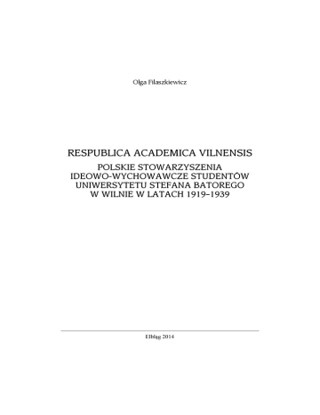 Olga Filaszkiewicz RESPUBLICA ACADEMICA VILNENSIS POLSKIE STOWARZYSZENIA IDEOWO-WYCHOWAWCZE STUDENTÓW UNIWERSYTETU STEFANA BATOREGO W WILNIE W LATACH 1919–1939 Elbląg 2014 Przewodniczący Komitetu Redakcyjnego Wydawnictwa PWSZ w Elblągu dr hab. inż. Jerzy Łabanowski Recenzent dr hab. Marzena Dyjakowska, prof. KUL Redakcja, korekta, skład, projekt okładki Wydawnictwo Techniczno-Naukowe JAS e-mail: [email protected] Jadwiga Szczerkowska Jerzy Paczyński Zdjęcie na okładce Uniwersytet Wileński. Baszta astronomiczna i obserwatorium (1935 r.) Ze zbiorów Narodowego Archiwum Cyfrowego Panu Dyrektorowi i pracownikom NAC, za życzliwość i udostępnienie fotografii składamy serdeczne podziękowania ΞŽƉLJƌŝŐŚƚďLJWt^ǁůďůČŐƵ ISBN 978-83-62336-39-5 Wydawnictwo Państwowej Wyższej Szkoły Zawodowej w Elblągu 82-300 Elbląg, ul. Wojska Polskiego 1, tel. 55 629 05 55 Wydanie I, nakład 120 egz., format B-5 Książkę dedykuję moim Rodzicom Irenie i Lucjanowi SPIS TREŚCI WSTĘP............................................................................................................................ 7 Część I UNIWERSYTET STEFANA BATOREGO W WILNIE – GENEZA I FUNKCJONOWANIE.................................................................................................. 17 Rozdział 1 Uniwersytet Stefana Batorego w Wilnie ......................................................................... 19 1.1. Zarys dziejów Uniwersytetu Wileńskiego .......................................................... 1.2. Reaktywacja Uniwersytetu Stefana Batorego ..................................................... 1.3. Funkcjonowanie Uniwersytetu Stefana Batorego ............................................... 19 29 39 Rozdział 2 Formalnoprawny status szkół wyższych i stowarzyszeń studenckich w Polsce w latach międzywojennych ............................................................................................. 51 2.1. Podstawy prawne funkcjonowania szkolnictwa wyższego w Polsce w latach 1918–1933 ............................................................................................ 2.2. Stan prawny po reformie szkolnictwa wyższego w 1933 roku ........................... 2.3. Sytuacja prawna stowarzyszeń studenckich ........................................................ 2.4. Przepisy wewnętrzne Uniwersytetu Stefana Batorego ........................................ 51 57 63 68 Część II STOWARZYSZENIA IDEOWO-WYCHOWAWCZE POLSKIEJ MŁODZIEŻY AKADEMICKIEJ USB W WILNIE – STRUKTURY, DZIAŁALNOŚĆ, MYŚL POLITYCZNA .................................................................................................... 75 Rozdział 3 Stowarzyszenie Katolickiej Młodzieży Akademickiej „Odrodzenie” oraz młodzież narodowa .................................................................................................. 77 3.1. Stowarzyszenie Katolickiej Młodzieży Akademickiej „Odrodzenie”................. 3.2. Organizacje młodzieży narodowej ...................................................................... 77 94 Rozdział 4 Lewica i ludowcy w środowisku młodzieży uniwersyteckiej Wilna ............................... 113 4.1. Związek Niezależnej Młodzieży Socjalistycznej ................................................ 113 4.2. „Grupa Dembińskiego” ....................................................................................... 125 4.3. Młodzież ludowa ................................................................................................. 162 5 Rozdział 5 Stowarzyszenia „Młodzieży Państwowej” ...................................................................... 169 5.1. Związek Polskiej Młodzieży Demokratycznej .................................................... 169 5.2. Legion Młodych – Akademicki Związek Pracy dla Państwa .............................. 177 5.3. Związek Młodzieży Akademickiej – Myśl Mocarstwowa .................................. 190 Część III PŁASZCZYZNY SPORÓW WSPÓLNE STUDENTOM UNIWERSYTETU STEFANA BATOREGO ................................................................................................ 197 Rozdział 6 Kwestia żydowska ........................................................................................................... 199 6.1. Sprawa Wacławskiego ........................................................................................ 199 6.2. Kolejna fala zamieszek (1936/1937)................................................................... 212 6.3. Stosunek stowarzyszeń ideowo-wychowawczych do sprawy żydowskiej.......... 222 Rozdział 7 W obronie autonomii uczelni i wolności studiowania ..................................................... 227 7.1. W obronie autonomii uczelni .............................................................................. 227 7.2. Akcja antyopłatowa ............................................................................................ 232 ZAKOŃCZENIE ............................................................................................................. BIBLIOGRAFIA ............................................................................................................. ANEKSY......................................................................................................................... 1. Listy członków polskich studenckich stowarzyszeń ideowo-wychowawczych Uniwersytetu Stefana Batorego w Wilnie w latach 1919–1939.............................. 2. Kuratorzy polskich stowarzyszeń ideowo-wychowawczych na Uniwersytecie Stefana Batorego w Wilnie ..................................................................................... 6 236 244 267 269 282