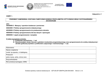 Katolicki Uniwersytet Lubelski Jana Pawła II Dział Zamówień i Zaopatrzenia 20-950 Lublin, Aleje Racławickie 14 tel. (0-81) 445-41-60, fax (0-81) 445-41-61 e-mail: [email protected] Europejski Fundusz Rozwoju Regionalnego Załącznik nr 1 CZĘŚĆ 1. PRZEDMIOT ZAMÓWIENIA: DOSTAWA FABRYCZNIE NOWEGO PROFILOMETRU OPTYCZNEGO WRAZ Z WYPOSAśENIEM I AKCESORIAMI CPV: 38540000-2 - Maszyny i aparatura badawcza i pomiarowa 48463000-1 Pakiety oprogramowania statystycznego 48328000-3 Pakiety oprogramowania do przetwarzania obrazów 48600000-4 Pakiety oprogramowania dla baz danych i operacyjne 48980000-1 Języki programowania i narzędzia W skład wyposaŜenia wchodzą: 1) Profilometr mechaniczny – 1 szt. 2) Wysokowydajna stacja robocza z pakietem środowiska programistycznego oraz oprogramowania do analizy statystycznej i obróbki graficznej wyników z profilometru optycznego i mechanicznego – 1 szt. Wykonawca: Nazwa urządzenia: model, typ aparatu, nr katalogowy Producent: pełna nazwa, adres, strona www Kraj pochodzenia: Rok produkcji (wymagany: 2009) Dostawa aparatury naukowo-badawczej (II) - AZP-250-ZP-ICBN/PN-p206-06/II/2009 Strona 1 z 14 Katolicki Uniwersytet Lubelski Jana Pawła II Dział Zamówień i Zaopatrzenia 20-950 Lublin, Aleje Racławickie 14 tel. (0-81) 445-41-60, fax (0-81) 445-41-61 e-mail: [email protected] Europejski Fundusz Rozwoju Regionalnego A. PARAMETRY TECHNICZNE I EKSPLOATACYJNE PROFILOMETRU OPTYCZNEGO Lp Parametr [jednostka] UKLAD PODSTAWOWY Tryb pionowej interferometrii skanującej 01 02 03 Tryb interferometrii przesunięcia fazowego Tryb łączący obydwie powyŜsze techniki Parametr wymagany Tak Tak 04 Tak 05 Dedykowany element piezoelektryczny dla szybkiej interferometrii przesunięcia fazowego Tak Kalibracja układu pomiarowego w oparciu o wzorce kalibracyjne Ocena punktowa i kryterium oceny parametrów ocenianych Tak Pionowy zakres skanowania co najmniej 10 milimetrów ze sprzęŜeniem zwrotnym w zamkniętej pętli dla całego zakresu skanowania 06 Parametr oferowany Tak Dostawa aparatury naukowo-badawczej (II) - AZP-250-ZP-ICBN/PN-p206-06/II/2009 Pionowy zakres skanowania 20 mm – 10 pkt. Funkcja wewnętrznej kalibracji układu pomiarowego w oparciu o interferometr laserowy – 10 pkt. Strona 2 z 14 Katolicki Uniwersytet Lubelski Jana Pawła II Dział Zamówień i Zaopatrzenia 20-950 Lublin, Aleje Racławickie 14 tel. (0-81) 445-41-60, fax (0-81) 445-41-61 e-mail: [email protected] 07 08 09 Kamera o matrycy co najmniej 640 x 480 pikseli o szybkości 60 klatek na sekundę Rewolwer na 4 obiektywy sterowany z poziomu oprogramowania, pozwalający na zmianę obiektywu bez jego dotykania MoŜliwość stosowania dodatkowych soczewek zmieniających pole obserwacji umoŜliwiające łatwiejszy dobór powiększenia. Wymagane soczewki o powiększeniach 0,5x, 1x oraz 2x Europejski Fundusz Rozwoju Regionalnego Tak Tak Tak Rewolwer sterowany z poziomu oprogramowania na 3 soczewki zmieniające pole obserwacji 10 11 12 Zmotoryzowany stolik próbki XY, o zakresach przesuwu 200mm x 200mm, sterowany dedykowanym oprogramowaniem do sklejania mniejszych obrazów w większe. Mechanizm regulacji pochyłu zmotoryzowany bądź mechaniczny Wymagana odległość pomiędzy obiektywem oraz stolikiem próbki o wartości 100mm w najdalszym połoŜeniu. Zmotoryzowana regulacja wysokości stolika w osi Z Tak Tak Regulacja pochyłu realizowana poprzez pochył głowicy pomiarowej – 10 pkt. Tak Dostawa aparatury naukowo-badawczej (II) - AZP-250-ZP-ICBN/PN-p206-06/II/2009 Strona 3 z 14 Katolicki Uniwersytet Lubelski Jana Pawła II Dział Zamówień i Zaopatrzenia 20-950 Lublin, Aleje Racławickie 14 tel. (0-81) 445-41-60, fax (0-81) 445-41-61 e-mail: [email protected] 13 Układ oświetlania próbki powinien jako źródło światła wykorzystywać diody LED Tak 14 System izolacji antywibracyjnej Tak 15 Komputer z oprogramowaniem sterującym klasy PC z dwoma monitorami 19” LCD oraz systemem operacyjnym Windows XP Tak 16 17 18 Obiektyw interferencyjny 5x Obiektyw interferencyjny 10x Obiektyw interferencyjny 20x Europejski Fundusz Rozwoju Regionalnego System wykorzystujący jako źródło światła dwie diody LED - białą oraz zieloną – 10 pkt. Tak Tak Tak Obiektyw interferencyjny 50x 19 Tak Przystosowanie do napięcia 220V Tak 20 21 22 Oprogramowanie pomiarowe przystosowane do pracy w środowisku Windows XP, do zbierania oraz analizowania danych Kamera o matrycy co najmniej 640 x 480 pikseli o szybkości 60 klatek na sekundę Tak Tak Dostawa aparatury naukowo-badawczej (II) - AZP-250-ZP-ICBN/PN-p206-06/II/2009 Strona 4 z 14 Katolicki Uniwersytet Lubelski Jana Pawła II Dział Zamówień i Zaopatrzenia 20-950 Lublin, Aleje Racławickie 14 tel. (0-81) 445-41-60, fax (0-81) 445-41-61 e-mail: [email protected] Europejski Fundusz Rozwoju Regionalnego Parametry pomiarów 23 Rozdzielczość pionowa < 0,1 nm Tak 24 Powtarzalność pomiaru wysokości stopnia 1 sigma < 0,1% niezaleŜnie od wysokości stopnia w całym zakresie pomiarowym Tak Dokładność pomiaru wysokości stopnia 0,7% - 5 pkt 25 26 27 28 29 Dokładność pomiaru wysokości stopnia 0,8% Szybkość skanowania w pionie do 80 µm/s Oprogramowanie Kompletny pakiet do akwizycji oraz analizy danych UŜytkownik powinien mieć moŜliwość zainstalowania oprogramowania na innych komputerach w swoim laboratorium. Rozwiązanie takie powinno być uwzględnione w cenie systemu MoŜliwość zapisywania danych pomiarowych we własnym formacie pliku, jak równieŜ w formacie ASCII, Tak Tak Dokładność pomiaru wysokości stopnia 0,6% 10 pkt Szybkość skanowania w pionie co najmniej 100 µm/s – 10 pkt. Tak Tak Tak Dostawa aparatury naukowo-badawczej (II) - AZP-250-ZP-ICBN/PN-p206-06/II/2009 Strona 5 z 14 Katolicki Uniwersytet Lubelski Jana Pawła II Dział Zamówień i Zaopatrzenia 20-950 Lublin, Aleje Racławickie 14 tel. (0-81) 445-41-60, fax (0-81) 445-41-61 e-mail: [email protected] 30 31 32 33 Opcjonalnie oprogramowanie powinno umoŜliwia