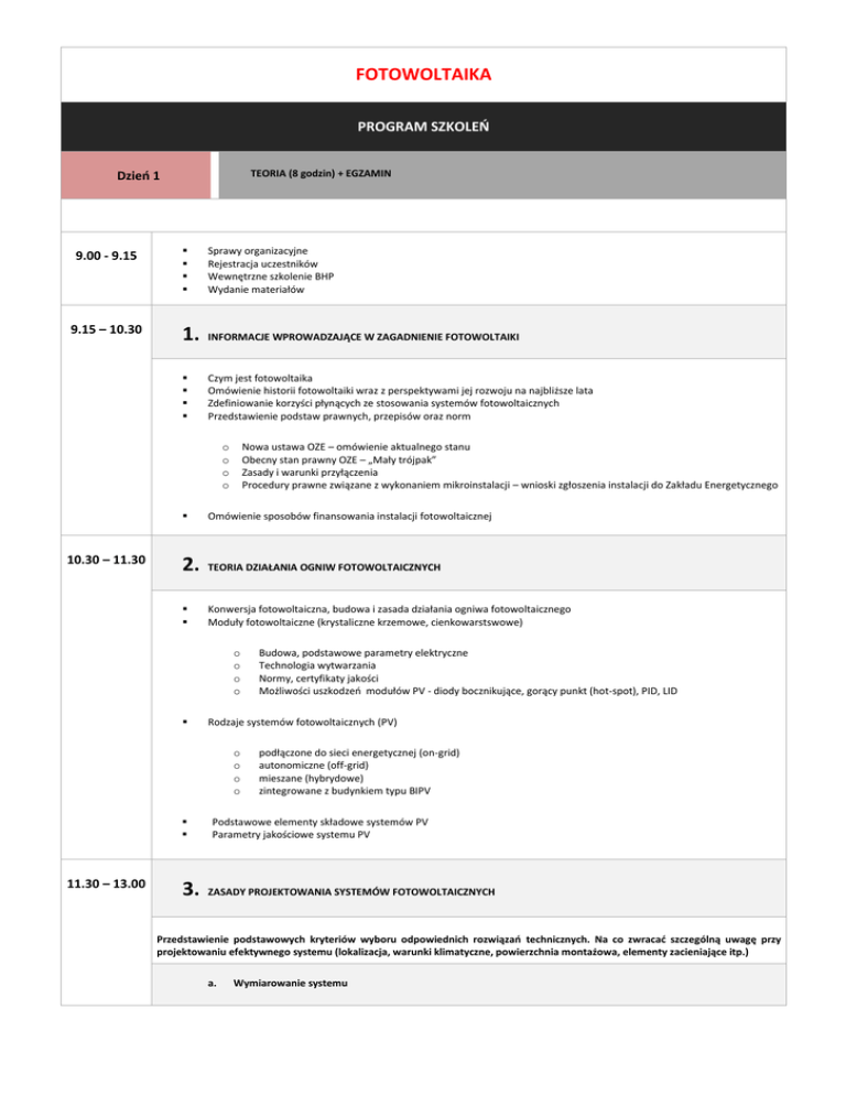 FOTOWOLTAIKA PROGRAM SZKOLEŃ TEORIA (8 godzin) + EGZAMIN Dzień 1 9.00 - 9.15 9.15 – 10.30 Sprawy organizacyjne Rejestracja uczestników Wewnętrzne szkolenie BHP Wydanie materiałów 1. INFORMACJE WPROWADZAJĄCE W ZAGADNIENIE FOTOWOLTAIKI Czym jest fotowoltaika Omówienie historii fotowoltaiki wraz z perspektywami jej rozwoju na najbliższe lata Zdefiniowanie korzyści płynących ze stosowania systemów fotowoltaicznych Przedstawienie podstaw prawnych, przepisów oraz norm o o o o 10.30 – 11.30 Nowa ustawa OZE – omówienie aktualnego stanu Obecny stan prawny OZE – „Mały trójpak” Zasady i warunki przyłączenia Procedury prawne związane z wykonaniem mikroinstalacji – wnioski zgłoszenia instalacji do Zakładu Energetycznego Omówienie sposobów finansowania instalacji fotowoltaicznej 2. TEORIA DZIAŁANIA OGNIW FOTOWOLTAICZNYCH Konwersja fotowoltaiczna, budowa i zasada działania ogniwa fotowoltaicznego Moduły fotowoltaiczne (krystaliczne krzemowe, cienkowarstswowe) o o o o Rodzaje systemów fotowoltaicznych (PV) o o o o 11.30 – 13.00 3. Budowa, podstawowe parametry elektryczne Technologia wytwarzania Normy, certyfikaty jakości Możliwości uszkodzeń modułów PV - diody bocznikujące, gorący punkt (hot-spot), PID, LID podłączone do sieci energetycznej (on-grid) autonomiczne (off-grid) mieszane (hybrydowe) zintegrowane z budynkiem typu BIPV Podstawowe elementy składowe systemów PV Parametry jakościowe systemu PV ZASADY PROJEKTOWANIA SYSTEMÓW FOTOWOLTAICZNYCH Przedstawienie podstawowych kryteriów wyboru odpowiednich rozwiązań technicznych. Na co zwracać szczególną uwagę przy projektowaniu efektywnego systemu (lokalizacja, warunki klimatyczne, powierzchnia montażowa, elementy zacieniające itp.) a. Wymiarowanie systemu Dobór liczby modułów PV i baterii akumulatorów w odniesieniu do poziomu zapotrzebowania na energie elektryczną Dobór okablowania Obliczenia liczby modułów i dobór falownika dla określonej powierzchni i orientacji dachu Obliczenia mocy systemu PV, oszacowania ilości energii jaką można uzyskać z systemu PV b. Podłączenie systemu do sieci PRZERWA NA LUNCH (CATERING) 13.00 – 13.20 13.20 – 15.30 15.30 – 16.00 16.00 – 16.30 4. INSTALOWANIE SYSTEMU Omówienie podstaw BHP jakie należy zachować przy wykonywaniu instalacji Ustalenie harmonogramu prac Wyszczególnienie narzędzi potrzebnych instalatorowi przy montażu Omówienie prawidłowego rozmieszczenia i montażu systemów mocowania Omówienie prawidłowego rozplanowania i wykonania okablowania Omówienie prawidłowego montażu modułów Omówienie prawidłowego montażu zabezpieczeń 5. URUCHAMIANIE SYSTEMU Inspekcja instalacji. Na co zwracać uwagę dokonując inspekcji Testy instalacji. Jak je wykonywać. Na co zwracać uwagę Analiza typowych błędów montażowych Warunki odbioru i dokumentacja techniczna 6. KONSERWACJA I SERWISOWANIE Omówienie czynności wykonywanych podczas przeglądu technicznego Diagnozowanie u usuwanie usterek w systemie. Jakich usterek możemy się spodziewać. 16.30 – 17.00 17.00 – 17.10 EGZAMIN TEORETYCZNY 7. Dzień 2 9.00 – 9.15 9.15 – 10.30 PYTANIA I ODPOWIEDZI PRAKTYKA (8 godzin) + Egzamin Sprawy organizacyjne Rejestracja uczestników Zapoznanie się makietami na których odbędą się zajęcia 1. PODSTAWY PROJEKTOWANIA SYSTEMÓW PV Prezentacja elementów składowych instalacji Prezentacja rodzajów podłączeń systemów fotowoltaicznych Prezentacja sposobów montażu modułów PV i inwerterów Charakterystyka dostępnych systemów montażowych Rozróżnienie systemów dachowych na przykładzie makiet wybudowanych w centrum szkoleniowym Rozróżnienie systemów naziemnych Omówienie kryteriów doboru komponentów Prezentacja sposobu zabezpieczenia instalacji fotowoltaicznej Wpływ lokalizacji (z omówieniem nasłonecznienia), na produkcję energii Pozyskiwanie i przetwarzanie danych pogodowych w praktyce Najwięksi producenci podzespołów PV Profile energetyczne odbiorników 10.30 – 11.00 2. PREZENTACJA INSTALACJI FOTOWOLTAICZNEJ PRACUJĄCEJ NA TERENIE OŚRODKA SZKOLEŃ 11.00 – 13.30 Omówienie praktycznej strony eksploatacji instalacji PV Przedstawienie zakresu przeglądu i konserwacji pracującej instalacji fotowoltaicznej na przykładzie ośrodka 3. TECHNIKI MONTAŻU W PRAKTYCE Przygotowanie planu instalacji Bezpieczeństwo i higiena pracy przy wykonywaniu instalacji Narzędzia i wyposażenie do montażu Techniki montażu konstrukcji wsporczej na dachu skośnym krytym różnymi rodzajami pokrycia Techniki montażu konstrukcji wsporczych na dachu płaskim i gruncie Techniki wykonywania okablowania Techniki montażu modułów fotowoltaicznych - wykonywanie połączeń szeregowych Montaż falownika i układu zabezpieczeń (ochrona przepięciowa, nadprądowa) Wykonywanie połączeń wyrównawczych Przygotowanie miejsca na układ rozliczeniowo pomiarowy Podłączanie systemu fotowoltaicznego do sieci energetycznej - procedura załączania Techniki montażu systemu autonomicznego Techniki montażu modułów fotowoltaicznych - wykonywanie połączeń równoległych Montaż akumulatorów i przetwornicy DC/AC Uruchomienie systemu autonomicznego Analiza typowych błędów montażowych instalacji PRZERWA NA LUNCH (CATERING) 13.30 – 13.50 13.50 – 16.30 4. POMIARY I KONFIGURACJA Konfiguracja systemu Synchronizacja z siecią Monitoring systemu w praktyce o Pomiar parametrów elektrycznych modułu fotowoltaicznego w warunkach rzeczywistych - wpływ natężenia promieniowania i temperatury na parametry elektryczne instalacji PV o Pomiar krzywych U-I łańcuchów modułów fotowoltaicznych oraz analiza wyników o Badanie kamerą termowizyjną o Ocena poprawności i wydajności działania instalacji PV o Monitorowanie pracy elektrowni PV o Prace konserwacyjne i przeglądy Warunki odbioru i dokumentacja techniczna instalacji Analiza błędów 16.30 – 17.00 EGZAMIN PRAKTYCZNY 17.00 – 17.10 PYTANIA I ODPOWIEDZI