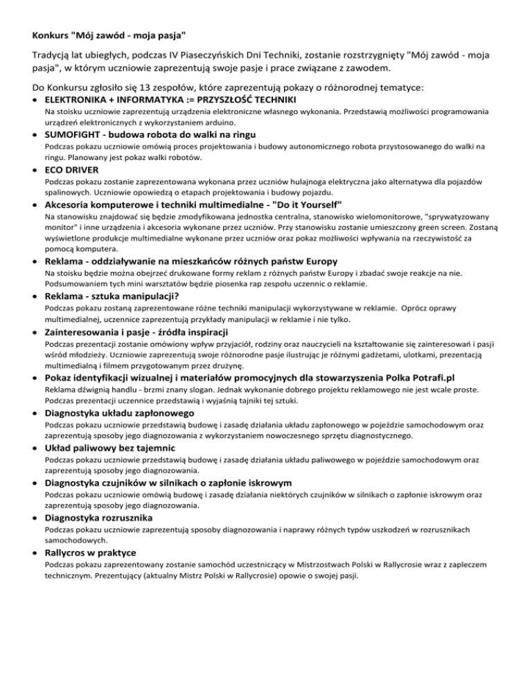 Konkurs "Mój zawód - moja pasja" Tradycją lat ubiegłych, podczas IV Piaseczyńskich Dni Techniki, zostanie rozstrzygnięty "Mój zawód - moja pasja", w którym uczniowie zaprezentują swoje pasje i prace związane z zawodem. Do Konkursu zgłosiło się 13 zespołów, które zaprezentują pokazy o różnorodnej tematyce: ELEKTRONIKA + INFORMATYKA := PRZYSZŁOŚĆ TECHNIKI Na stoisku uczniowie zaprezentują urządzenia elektroniczne własnego wykonania. Przedstawią możliwości programowania urządzeń elektronicznych z wykorzystaniem arduino. SUMOFIGHT - budowa robota do walki na ringu Podczas pokazu uczniowie omówią proces projektowania i budowy autonomicznego robota przystosowanego do walki na ringu. Planowany jest pokaz walki robotów. ECO DRIVER Podczas pokazu zostanie zaprezentowana wykonana przez uczniów hulajnoga elektryczna jako alternatywa dla pojazdów spalinowych. Uczniowie opowiedzą o etapach projektowania i budowy pojazdu. Akcesoria komputerowe i techniki multimedialne - "Do it Yourself" Na stanowisku znajdować się będzie zmodyfikowana jednostka centralna, stanowisko wielomonitorowe, "sprywatyzowany monitor" i inne urządzenia i akcesoria wykonane przez uczniów. Przy stanowisku zostanie umieszczony green screen. Zostaną wyświetlone produkcje multimedialne wykonane przez uczniów oraz pokaz możliwości wpływania na rzeczywistość za pomocą komputera. Reklama - oddziaływanie na mieszkańców różnych państw Europy Na stoisku będzie można obejrzeć drukowane formy reklam z różnych państw Europy i zbadać swoje reakcje na nie. Podsumowaniem tych mini warsztatów będzie piosenka rap zespołu uczennic o reklamie. Reklama - sztuka manipulacji? Podczas pokazu zostaną zaprezentowane różne techniki manipulacji wykorzystywane w reklamie. Oprócz oprawy multimedialnej, uczennice zaprezentują przykłady manipulacji w reklamie i nie tylko. Zainteresowania i pasje - źródła inspiracji Podczas prezentacji zostanie omówiony wpływ przyjaciół, rodziny oraz nauczycieli na kształtowanie się zainteresowań i pasji wśród młodzieży. Uczniowie zaprezentują swoje różnorodne pasje ilustrując je różnymi gadżetami, ulotkami, prezentacją multimedialną i filmem przygotowanym przez drużynę. Pokaz identyfikacji wizualnej i materiałów promocyjnych dla stowarzyszenia Polka Potrafi.pl Reklama dźwignią handlu - brzmi znany slogan. Jednak wykonanie dobrego projektu reklamowego nie jest wcale proste. Podczas prezentacji uczennice przedstawią i wyjaśnią tajniki tej sztuki. Diagnostyka układu zapłonowego Podczas pokazu uczniowie przedstawią budowę i zasadę działania układu zapłonowego w pojeździe samochodowym oraz zaprezentują sposoby jego diagnozowania z wykorzystaniem nowoczesnego sprzętu diagnostycznego. Układ paliwowy bez tajemnic Podczas pokazu uczniowie przedstawią budowę i zasadę działania układu paliwowego w pojeździe samochodowym oraz zaprezentują sposoby jego diagnozowania. Diagnostyka czujników w silnikach o zapłonie iskrowym Podczas pokazu uczniowie omówią budowę i zasadę działania niektórych czujników w silnikach o zapłonie iskrowym oraz zaprezentują sposoby jego diagnozowania. Diagnostyka rozrusznika Podczas pokazu uczniowie zaprezentują sposoby diagnozowania i naprawy różnych typów uszkodzeń w rozrusznikach samochodowych. Rallycros w praktyce Podczas pokazu zaprezentowany zostanie samochód uczestniczący w Mistrzostwach Polski w Rallycrosie wraz z zapleczem technicznym. Prezentujący (aktualny Mistrz Polski w Rallycrosie) opowie o swojej pasji. Uczniowie biorący udział w Konkursie otrzymają nagrody ufundowane przez: Cyfrowe Centrum Serwisowe za zajęcie pierwszego miejsca - telefon Idol 3 (6039Y) + zegarek SM02 x 2 za zajęcie drugiego miejsca - Telefon Idol 3 (6039Y) x 2 za zajęcie trzeciego miejsca - Zegarek SM02 x 2 Inter Cars - nagroda główna w kategorii motoryzacji Pokazy odbędą się na I piętrze oraz w pracowniach samochodowych. Serdecznie zapraszamy!