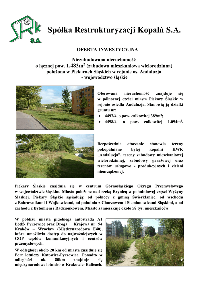 Spółka Restrukturyzacji Kopalń S.A. OFERTA INWESTYCYJNA Niezabudowana nieruchomość o łącznej pow. 1.483m2 (zabudowa mieszkaniowa wielorodzinna) położona w Piekarach Śląskich w rejonie os. Andaluzja - województwo śląskie Oferowana nieruchomość znajduje się w północnej części miasta Piekary Śląskie w rejonie osiedla Andaluzja. Stanowią ją działki gruntu nr: 4497/4, o pow. całkowitej 389m2; 4498/4, o pow. całkowitej 1.094m2. Bezpośrednie otoczenie stanowią tereny pokopalniane byłej kopalni KWK „Andaluzja”, tereny zabudowy mieszkaniowej wielorodzinnej, zabudowy garażowej oraz terenów usługowo - produkcyjnych i zieleni nieurządzonej. Piekary Śląskie znajdują się w centrum Górnośląskiego Okręgu Przemysłowego w województwie śląskim. Miasto położone nad rzeką Brynicą w południowej części Wyżyny Śląskiej. Piekary Śląskie sąsiadują: od północy z gminą Świerklaniec, od wschodu z Bobrownikami i Wojkowicami, od południa z Chorzowem i Siemianowicami Śląskimi, a od zachodu z Bytomiem i Radzionkowem. Miasto zamieszkuje około 58 tys. mieszkańców. W pobliżu miasta przebiega autostrada A1 Łódź- Pyrzowice oraz Droga Krajowa nr 94 Kraków – Wrocław (Międzynarodowa E40), która umożliwia dostęp do najważniejszych w GOP węzłów komunikacyjnych i centrów przemysłowych. W odległości około 20 km od miasta znajduje się Port lotniczy Katowice-Pyrzowice. Ponadto w odległości ok. 80km znajduje się międzynarodowe lotnisko w Krakowie- Balicach. Dane o terenie: Właściciel Skarb Państwa Użytkownik wieczysty Spółka Restrukturyzacji Kopalń S.A. Dane adresowe użytkownika wieczystego ul. Strzelców Bytomskich 207 41-914 Bytom Fax: +48 (prefix) 32/35-13-309; 35-13-310 www.srk.com.pl Powierzchnia całkowita Działki gruntu nr: 4497/4, o pow. 389m2; 4498/4, o pow. 1.094m2. Przeznaczenie według planu zagospodarowania przestrzennego Tereny zabudowy mieszkaniowej wielorodzinnej. Obecny sposób zagospodarowania Nieruchomość o kształcie nieregularnym. Tereny porośnięte zielenią nieurządzoną i pojedynczymi drzewami. Na granicy działki nr 4498/4 przebiega skarpa. Kompleks zlokalizowany wzdłuż rzeki Brynica. Informacje o terenach przyległych Otoczenie stanowi zabudowa mieszkaniowa wielorodzinna, zabudowa garażowa, tereny usługowo- produkcyjne oraz zieleni nieurządzonej. Istniejące uzbrojenie W najbliższym otoczeniu przebiega sieć W, K, E. Dostępność komunikacyjna Dojazd do nieruchomości przez drogi wewnętrzne os. Andaluzja, bezpośrednie połączenie z ul. Oświęcimską, jedna z głównych dróg publicznych. Sugerowana forma zbycia Sprzedaż prawa wieczystego użytkowania na lata do 2089r., w drodze przetargu publicznego. Preferowana sprzedaż całego kompleksu. Osoba do kontaktu Dział Zagospodarowania Majątku, Maciej Szymczak tel.: +48 (prefix) 32/35-13-362; e-mail.: [email protected] Sporządził: Zarządca dnia 2015.12.11.