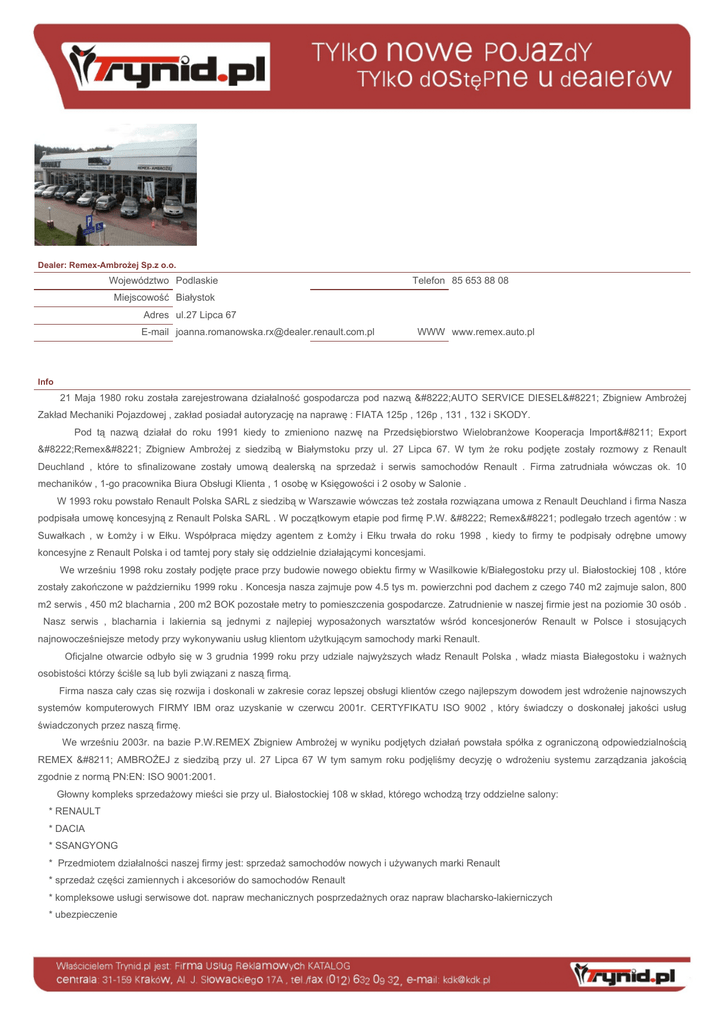 Dealer: Remex-Ambrożej Sp.z o.o. Województwo Podlaskie Telefon 85 653 88 08 Miejscowość Białystok Adres ul.27 Lipca 67 E-mail [email protected] WWW www.remex.auto.pl Info 21 Maja 1980 roku została zarejestrowana działalność gospodarcza pod nazwą „AUTO SERVICE DIESEL” Zbigniew Ambrożej Zakład Mechaniki Pojazdowej , zakład posiadał autoryzację na naprawę : FIATA 125p , 126p , 131 , 132 i SKODY. Pod tą nazwą działał do roku 1991 kiedy to zmieniono nazwę na Przedsiębiorstwo Wielobranżowe Kooperacja Import– Export „Remex” Zbigniew Ambrożej z siedzibą w Białymstoku przy ul. 27 Lipca 67. W tym że roku podjęte zostały rozmowy z Renault Deuchland , które to sfinalizowane zostały umową dealerską na sprzedaż i serwis samochodów Renault . Firma zatrudniała wówczas ok. 10 mechaników , 1-go pracownika Biura Obsługi Klienta , 1 osobę w Księgowości i 2 osoby w Salonie . W 1993 roku powstało Renault Polska SARL z siedzibą w Warszawie wówczas też została rozwiązana umowa z Renault Deuchland i firma Nasza podpisała umowę koncesyjną z Renault Polska SARL . W początkowym etapie pod firmę P.W. „ Remex” podlegało trzech agentów : w Suwałkach , w Łomży i w Ełku. Współpraca między agentem z Łomży i Ełku trwała do roku 1998 , kiedy to firmy te podpisały odrębne umowy koncesyjne z Renault Polska i od tamtej pory stały się oddzielnie działającymi koncesjami. We wrześniu 1998 roku zostały podjęte prace przy budowie nowego obiektu firmy w Wasilkowie k/Białegostoku przy ul. Białostockiej 108 , które zostały zakończone w październiku 1999 roku . Koncesja nasza zajmuje pow 4.5 tys m. powierzchni pod dachem z czego 740 m2 zajmuje salon, 800 m2 serwis , 450 m2 blacharnia , 200 m2 BOK pozostałe metry to pomieszczenia gospodarcze. Zatrudnienie w naszej firmie jest na poziomie 30 osób . Nasz serwis , blacharnia i lakiernia są jednymi z najlepiej wyposażonych warsztatów wśród koncesjonerów Renault w Polsce i stosujących najnowocześniejsze metody przy wykonywaniu usług klientom użytkującym samochody marki Renault. Oficjalne otwarcie odbyło się w 3 grudnia 1999 roku przy udziale najwyższych władz Renault Polska , władz miasta Białegostoku i ważnych osobistości którzy ściśle są lub byli związani z naszą firmą. Firma nasza cały czas się rozwija i doskonali w zakresie coraz lepszej obsługi klientów czego najlepszym dowodem jest wdrożenie najnowszych systemów komputerowych FIRMY IBM oraz uzyskanie w czerwcu 2001r. CERTYFIKATU ISO 9002 , który świadczy o doskonałej jakości usług świadczonych przez naszą firmę. We wrześniu 2003r. na bazie P.W.REMEX Zbigniew Ambrożej w wyniku podjętych działań powstała spółka z ograniczoną odpowiedzialnością REMEX – AMBROŻEJ z siedzibą przy ul. 27 Lipca 67 W tym samym roku podjęliśmy decyzję o wdrożeniu systemu zarządzania jakością zgodnie z normą PN:EN: ISO 9001:2001. Głowny kompleks sprzedażowy mieści sie przy ul. Białostockiej 108 w skład, którego wchodzą trzy oddzielne salony: * RENAULT * DACIA * SSANGYONG * Przedmiotem działalności naszej firmy jest: sprzedaż samochodów nowych i używanych marki Renault * sprzedaż części zamiennych i akcesoriów do samochodów Renault * kompleksowe usługi serwisowe dot. napraw mechanicznych posprzedażnych oraz napraw blacharsko-lakierniczych * ubezpieczenie * leasingi * kredyty Renault Renault Renault SPRAWDŹ NAS ! Pojazdy dostępne u dealera 1 Renault Clio Grandtour (2005- ) Alize 1,2 16V 75 KM MT Szary platynowy Od reki 2 Renault Kangoo (2003-11) Helios 1.5 dCi 85KM MT Granatowy Od reki 3 Renault Megane III Grandtour (2008-11) Dynamique 1.4 16V TCE 130 KM MT Beż popielaty Od reki