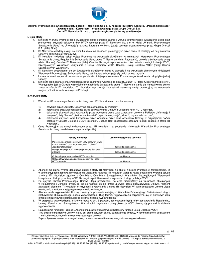 Warunki Promocyjnego świadczenia usług przez ITI Neovision Sp z o. o. na rzecz laureatów Konkursu „Poradnik Miesiąca” (zwanego dalej “Konkursem”) organizowanego przez Grupa Onet.pl S.A. Oferta ITI Neovision Sp. z o.o. operatora cyfrowej platformy satelitarnej n I. Opis oferty 1. Niniejsze Warunki Promocyjnego świadczenia usług określają zakres i warunki promocyjnego świadczenia usług oraz promocyjnej aktywacji dekodera nbox HTDV recorder przez ITI Neovision Sp. z o. o. (dalej: „Warunki Promocyjnego Świadczenia Usług” lub „Promocja”) na rzecz Laureata Konkursu (dalej: Laureat) organizowanego przez Grupa Onet.pl S.A. (dalej: Onet). 2. ITI Neovision świadczy usługi, na rzecz Laureata, na zasadach promocyjnych przez okres 12 miesięcy od daty zawarcia Umowy ( dalej: Okres Promocyjny). 3. ITI Neovision świadczy usługi objęte Promocją na warunkach określonych w niniejszych Warunkach Promocyjnego Świadczenia Usług, Regulaminie Świadczenia Usług przez ITI Neovision (dalej: Regulamin), Umowie o świadczenie usług (dalej: Umowa), Cenniku ITI Neovision (dalej: Cennik), Szczegółowych Warunkach korzystania z usługi „kolekcje VOD”, Szczegółowych Warunkach korzystania z Usługi „premiery VOD”, Cenniku Usługi „kolekcje VOD” (dalej: Cennik Szczegółowych Warunków). 4. ITI Neovision zobowiązuje się do świadczenia określonych usług w zakresie i na warunkach określonych niniejszymi Warunkami Promocyjnego Świadczenia Usług, zaś Laureat zobowiązuje się do ich przestrzegania. 5. Laureat uprawniony jest do zawarcia na podstawie niniejszych Warunków Promocyjnego świadczenia usług tylko jednej Umowy. 6. Niniejsza promocyjna oferta świadczenia usług zachowuje ważność do dnia 31.03.2011 r. (dalej: Okres ważności oferty). W przypadku, jeśli w Okresie ważności oferty spełnienie świadczenia przez ITI Neovision stanie się niemożliwe na skutek zmian w ofercie ITI Neovision, ITI Neovision zaproponuje Laureatowi zamienną ofertę promocyjną na warunkach niegorszych niż zawarte w niniejszej Promocji. II. Warunki oferty 1. Warunkami Promocyjnego Świadczenia Usług przez ITI Neovision na rzecz Laureata są: 1) 2) 3) 2. zawarcie przez Laureata, Umowy na czas oznaczony 12 miesięcy, korzystanie przez Abonenta przez okres obowiązywania Umowy z Dekodera nbox HDTV recorder, dokonanie aktywacji oraz korzystanie przez Abonenta przez czas oznaczony Umowy z Pakietów „informacja i rozrywka”, „hity filmowe”, „kultura nauka świat”, „sport i motoryzacja”, „dzieci”, „style moda muzyka”, 4) dokonanie aktywacji oraz korzystanie przez Abonenta przez czas oznaczony Umowy, z przynajmniej dwóch kolekcji w Usłudze „kolekcje VOD”: „nSeriale”, „Picture Box” (dostępność czasowa kolekcji zgodnie z ofertą ITI Neovision). Ceny Promocyjne za usługi świadczone przez ITI Neovision na podstawie niniejszych Warunków Promocyjnego Świadczenia Usług przedstawione są w tabeli poniżej. Pakiety lub usługi Ceny Promocyjne dla Laureata Pakiety: „informacja i rozrywka”, „hity filmowe”, „style, moda, muzyka”, „kultura, nauka, świat”, „dzieci”, „sport i motoryzacja” Usługa „kolekcje VOD” – kolekcja Picture Box oraz nSeriale 0 zł brutto miesięcznie Opłata aktywacyjna za nbox HDTV recorder Opłata aktywacyjna za zestaw antenowy do nbox HDTV recorder 3. 4. 5. 6. 7. 0 zł brutto miesięcznie 0 zł brutto 0 zł brutto Abonent ma prawo wybrać dodatkowe usługi z oferty ITI Neovision nie objęte niniejszą Promocją z zastrzeżeniem, iż w takim przypadku zobowiązany będzie do uiszczania na rzecz ITI Neovision Opłat za każdą dodatkowo wybraną usługę z oferty ITI Neovision zgodnie z Cennikiem, Cennikiem Szczegółowych Warunków, Szczegółowymi Warunkami korzystania z Usługi „premiery VOD”, Szczegółowymi Warunkami korzystania z Usługi „kolekcje VOD”. Po upływie Okresu Promocyjnego, Umowa ulega przedłużeniu na czas nieokreślony na warunkach określonych w Regulaminie i Cenniku, chyba, że, na co najmniej 30 dni przed upływem czasu obowiązywania Umowy, Abonent zawiadomi pisemnie ITI Neovision o rezygnacji z korzystania z usług ITI Neovision. W takim przypadku Umowa ulega rozwiązaniu z końcem następnego okresu rozliczeniowego. Abonent może wypowiedzieć Umowę zawartą na podstawie niniejszych Warunków Promocyjnego Świadczenia Usług z zachowaniem 3-miesięcznego okresu wypowiedzenia. Bieg terminu wypowiedzenia rozpoczyna się w pierwszym dniu okresu rozliczeniowego następującego po dniu złożeniu wypowiedzenia. W przypadku wypowiedzenia, o którym mowa w ust. 5 powyżej, zastosowanie będą miały postanowienia Regulaminu, Umowy, Cennika oraz Szczegółowych Warunkach korzystania z Usługi „kolekcje VOD” obowiązujących w dniu złożenia wypowiedzenia. Na podstawie niniejszej Promocji, Abonent ma prawo zrezygnować z Kolekcji w ramach Usługi „kolekcje VOD”: 1) w okresie oznaczonym Umowy, na 30 dni przed upływem okresu oznaczonego Umowy, w formie pisemnej ze skutkiem na koniec ostatniego dnia okresu oznaczonego Umowy, 2) po upływie okresu oznaczonego Umowy, z zachowaniem 3-miesięcznego okresu wypowiedzenia. str. 1/2 ITI Neovision Sp. z o.o., ul. Powsińska 4, 02-920 Warszawa, NIP 521-00-82-774, REGON: 010175861, wpisana do Rejestru Przedsiębiorców, prowadzonego przez Sąd Rejonowy dla m.st. Warszawy, XIII Wydział gospodarczy pod nr KRS 0000191377, kapitał zakładowy 40.000.000 zł Biuro Obsługi Klienta: 0 801 0 55555, z telefonów komórkowych (48 12) 291 55 55, fax: (48 12) 291 55 50 (opłaty według cenników operatorów), skype: nkontakt, www.n.pl III. Postanowienia ogólne 1. 2. 3. 4. 5. ITI Neovision świadczy usługi zgodnie z Regulaminem Świadczenia Usług przez ITI Neovision, Umową o Świadczenie Usług, niniejszymi Warunkami Promocyjnego Świadczenia Usług, Cennikiem ITI Neovision, Szczegółowymi Warunkami korzystania z Usługi „kol