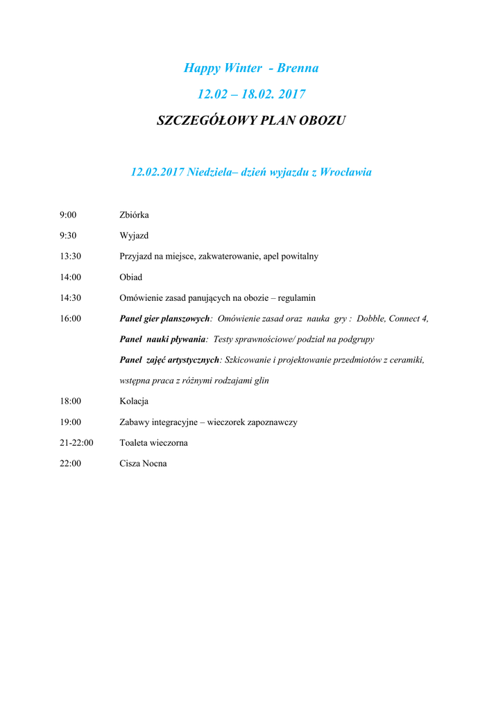Happy Winter - Brenna 12.02 – 18.02. 2017 SZCZEGÓŁOWY PLAN OBOZU 12.02.2017 Niedziela– dzień wyjazdu z Wrocławia 9:00 Zbiórka 9:30 Wyjazd 13:30 Przyjazd na miejsce, zakwaterowanie, apel powitalny 14:00 Obiad 14:30 Omówienie zasad panujących na obozie – regulamin 16:00 Panel gier planszowych: Omówienie zasad oraz nauka gry : Dobble, Connect 4, Panel nauki pływania: Testy sprawnościowe/ podział na podgrupy Panel zajęć artystycznych: Szkicowanie i projektowanie przedmiotów z ceramiki, wstępna praca z różnymi rodzajami glin 18:00 Kolacja 19:00 Zabawy integracyjne – wieczorek zapoznawczy 21-22:00 Toaleta wieczorna 22:00 Cisza Nocna 13.02.2017 Poniedziałek 8:30 Śniadanie 9:30 Wyjazd na stok 10.00-13:00 Szkolenia narciarskie i snowboardowe Testy kwalifikacyjne – podział na grupy, ćwiczenia wprowadzające – zasady zachowania na stoku, zapoznanie ze sprzętem 14:00 Obiad 14:30-15:30 Przerwa poobiednia 16:00 Panel gier planszowych: Omówienie zasad oraz nauka gry w: Times UP,Carrcasone Panel nauki pływania: Nauka i doskonalenie pływania style grzbietowym/dowolnym Panel zajęć artystycznych: "Akwarium" na przygotowanych wcześniej bezbarwnych szybkach, dzieci za pomocą kolażu tworzą akwarium posługując się wyciętymi z papieru kolorowymi rybkami oraz farbami w morskiej tonacji ( niebieski, zielony, turkus, biały). Powstały obrazek jest "zamykany" drugą szybką, dzięki czemu staje się trwały i odporny na zarysowania 18:30 Kolacja 19:30 Wieczór gier niestandardowych 21-22:00 Toaleta wieczorna 22:00 Cisza nocna 14.02.2017 Wtorek 8:30 Śniadanie 9:30 Wyjazd na stok 10.00-13:00 Szkolenia narciarskie i snowboardowe Narty: pozycja płużna, zjazd z pozycji płużnej, nauka bezpiecznego hamowania Snowboard: nauka stania na desce, nauka wpięcia deski, ześlizg prosty, ześlizg skośny 14:00 Obiad 14:30-15:00 Przerwa poobiednia 16:00-18:00 Panel gier planszowych: Omówienie zasad oraz nauka gry w: Uga Buga, Przebiegłe Wielbłądy Panel nauki pływania: Nauka i doskonalenie pływania style grzbietowym/dowolnym Panel zajęć artystycznych: Praca w glinie. Wstępna realizacja projektów, przygotowanie do suszenia, nauka decoupagu 18:30 Kolacja 19:00 Wieczór artystyczny 21-22:00 Toaleta wieczorna 22:00 Cisza nocna 15.02.2017 Środa 8:30 Śniadanie 9:30 Wyjazd na stok 10.00-13:00 Narty: wprowadzenie do skrętu płużnego, nauka skrętu w prawo, nauka skrętu w lewo Snowboard: nauka skrętu ślizgowego, doskonalenie skrętów prostych, ślizgowych, rotacyjnych 14:00 Obiad 15:00-18:00 Wycieczka fakultatywna 18:30 Kolacja 19:30 Wieczór filmowy 21-22:00 Toaleta wieczorna 22:00 Cisza nocna 16.02.2017 Czwartek 8:30 Śniadanie 9:30 Wyjazd na stok 10.00-13:00 Szkolenia narciarskie i snowboardowe Narty: wprowadzenie do skrętu w pozycji równoległej ( spaghetti, frytki, ), nauka skrętu w pozycji równoległej , stabilizacja tułowia podczas jazdy, próba wejścia na krawędzie nart Snowboard : nauka skrętu NW, nauka jazdy na krawędzi 14:00 Obiad 14:30-15:00 Przerwa poobiednia 16:00-18:00 Panel Gier Planszowych: Omówienie zasad oraz nauka gry w : Dixit, Timelinei Panel nauki pływania: Nauka i doskonalenie pływania stylem klasycznym elementy pływania stylem motylkowym Panel zajęć artystycznych: Wypał wstępny w piecu ceramicznym. Malowanie na szkle- projekt zima na wesoło 18:30 Kolacja 19:00 Dyskoteka 21-22:00 Toaleta wieczorna 22:00 Cisza nocna 17.02.2017 Piątek 8:30 Śniadanie 9:30 Wyjazd na stok 10.00-13:00 Szkolenia narciarskie i snowboardowe Narty: Jazda równoległa, skręt równoległy, zawody narciarskie Snowboard: doskonalenie jazdy w skrętach NW, ciętym , ślizgowym, zawody snowboardowe 14:00 Obiad 14:30-15:00 Przerwa poobiednia 16:00-18:00 Panel gier planszowych: Omówienie zasad oraz nauka gry w: Jungle Speed, Jaki jest?, 5 sekund Panel nauki pływania: Nauka i doskonalenie pływania stylem grzbietowym, dowolnym, klasycznym. Zawody pływackie Panel zajęć artystycznych: „Świat owadów" - za pomocą kolorowych bibuł wykonamy z dziećmi motyle, pszczoły, ważki i inne owady, które na końcu zamocujemy na niewidocznej, cienkiej żyłce dzięki czemu będą sprawiać wrażenie unoszących się w powietrzu. Tym sposobem powstanie ciekawy element np. do pokoju dziecięcego. Przygotowanie do Wernisażu 18:30 Kolacja` 19:00 Oglądanie nagrań ze stoku, podsumowanie osiągnięć ze szkolenia narciarskiego/snowboardowego 20:00 Wernisaż artystyczny 21-22:00 Toaleta wieczorna 22:00 Cisza nocna 18.02.2017 Sobota – dzień wyjazdu z Brenna 8:00 Śniadanie 9:00 Apel pożegnalny, wyjazd w kierunku Wrocławia Plan obozu zimowego zawiera : - Nauka jazdy narty snowboard: przewidziana liczba godzin: 15 - Nauka i doskonalenie pływania: przewidziana liczba godzin: 10 - Gry planszowe: przewidziana liczba godzin : 10-12 - Zajęcia artystyczne: przewidziana liczba godzin: 10-12 Atrakcje w trakcie trwania obozu: - Zawody narciarsko- snowboardowe Happy Winter 2017 - Zawody pływackie o puchar Happy Time 2017 - Wernisaż artystyczny - Wycieczka fakultatywna - Pamiątkowe zdjęcia dla każdego uczestnika ZABIERZ SIĘ NA HAPPY WINTER