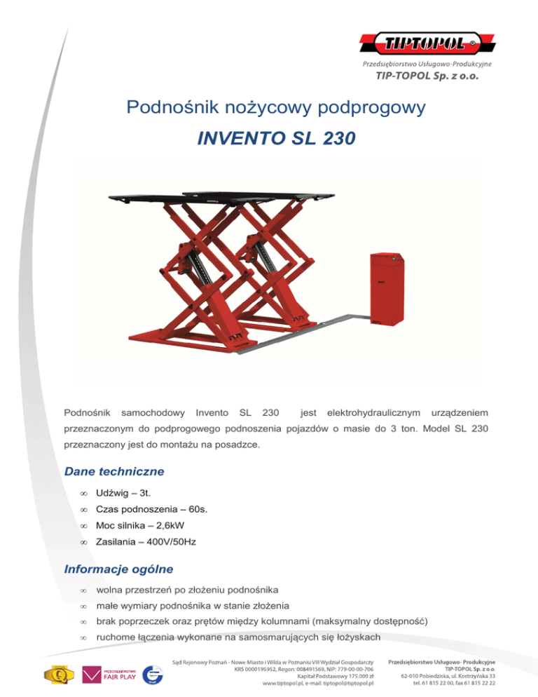 Podnośnik nożycowy podprogowy INVENTO SL 230 Podnośnik samochodowy Invento SL 230 jest elektrohydraulicznym urządzeniem przeznaczonym do podprogowego podnoszenia pojazdów o masie do 3 ton. Model SL 230 przeznaczony jest do montażu na posadzce. Dane techniczne • Udźwig – 3t. • Czas podnoszenia – 60s. • Moc silnika – 2,6kW • Zasilania – 400V/50Hz Informacje ogólne • wolna przestrzeń po złożeniu podnośnika • małe wymiary podnośnika w stanie złożenia • brak poprzeczek oraz prętów między kolumnami (maksymalny dostępność) • ruchome łączenia wykonane na samosmarujących się łożyskach • platformy o stałej długości • mechaniczna blokada zabezpieczająca z automatycznym odblokowywaniem Wymiary Strona 2/3 Wymagania montażowe Wariant nr1 • Podnośnik musi zostać umieszczony na posadzce betonowej B25 o grubości co najmniej 15 cm, która jest zgodna z lokalnymi przepisami. Wariant nr2 • Jeśli pokrycie podłogi o powyższej charakterystyce nie jest dostępne, konieczne jest użycie płyty fundamentowej (lub należy zastosować co najmniej kilka punktów mocowania w każdym obszarze mocowania) posiadającej odpowiednie rozmiary i grubość (wykonanej z betonu o tej samej jakości, co określono powyżej). Strona 3/3