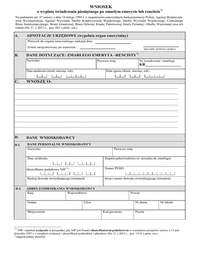 WNIOSEK o wypłatę świadczenia pieniężnego po zmarłym emerycie lub renciście*) Na podstawie art. 47 ustawy z dnia 18 lutego 1994 r. o zaopatrzeniu emerytalnym funkcjonariuszy Policji, Agencji Bezpieczeństwa Wewnętrznego, Agencji Wywiadu, Służby Kontrwywiadu Wojskowego, Służby Wywiadu Wojskowego, Centralnego Biura Antykorupcyjnego, Straży Granicznej, Biura Ochrony Rządu, Państwowej Straży Pożarnej i Służby Więziennej oraz ich rodzin (Dz. U. z 2013 r., poz. 667 z późn. zm.). A. ADNOTACJE URZĘDOWE (wypełnia organ emerytalny) Wniosek do organu emerytalnego wpłynął dnia Został zarejestrowany po numerem B. (pieczątka służbowa i podpis) DANE DOTYCZĄCE: ZMARŁEGO EMERYTA –RENCISTY*) Pierwsze imię Nazwisko Nr świadczenia zmarłego KR__________________ Data urodzenia (dzień, miesiąc, rok) C. Data zgonu (dzień, miesiąc, rok) WNOSZĘ O: ________________________________________________________________________________________________ ________________________________________________________________________________________________ ________________________________________________________________________________________________ ________________________________________________________________________________________________ ________________________________________________________________________________________________ ________________________________________________________________________________________________ ________________________________________________________________________________________________ ________________________________________________________________________________________________ D. DANE WNIOSKODAWCY D.1. DANE PERSONALNE WNIOSKODAWCY Pierwsze imię Nazwisko D.2. Data urodzenia Stopień pokrewieństwa (w stosunku do zmarłego) Identyfikator podatkowy NIP **) Numer PESEL Rodzaj dowodu stwierdzającego tożsamość Seria i numer dowodu stwierdzającego tożsamość ADRES ZAMIESZKANIA WNIOSKODAWCY Kraj Województwo Gmina Miejscowość Powiat Ulica Nr domu Kod pocztowy Nr lokalu Poczta NIP- wypełnić wyłącznie w przypadku, gdy NIP jest Pana(i) identyfikatorem podatkowym w rozumieniu przepisów ustawy z 13 października 1995 r. o zasadach ewidencji i identyfikacji podatników i płatników (Dz. U. z 2012 r., poz. 1314, z późn. zm.) **) *) niepotrzebne skreślić OŚWIADCZENIE WNIOSKODAWCY UBIEGAJĄCEGO SIĘ O WYPŁATĘ ŚWIADCZENIA PIENIĘŻNEGO PO ZMARŁYM EMERYCIE*) - RENCIŚCIE*) UPRZEDZONEGO O ODPOWIEDZIALNOŚCI KARNEJ ZA SKŁADANIE FAŁSZYWYCH ZEZNAŃ – ART. 233 KODEKSU KARNEGO E. E.1 Czy małżonek *)- dziecko*) ubiegające się o świadczenie pieniężne po zmarłym emerycie*) - renciście*) zamieszkiwał(o) z nim w dniu jego śmierci. E.2. Czy małżonek*) – dziecko*) – nie zamieszkujące z emerytem lub rencistą w dniu jego śmierci – wnuczek(ka)*) - rodzic*), dziadek*) – babcia*) - rodzeństwo*), pozostawali na utrzymaniu zmarłego emeryta*) - rencisty*). E.3. Czy zmarły emeryt*) - rencista*) pozostawał na utrzymaniu wnioskodawcy z pkt. E.2. TAK –NIE*) TAK – NIE*) TAK – NIE*) DYSPOZYCJA WNIOSKODAWCY DOTYCZĄCA PRZEKAZANIA ŚWIADCZENIA Na osobisty rachunek bankowy TAK –NIE*) F. - pełna nazwa banku (oddziału) - pełny numer rachunku bankowego w standardzie IBAN Za pośrednictwem urzędu pocztowego pod wskazanym adresem: Ulica TAK-NIE*) Nr domu Miejscowość Kod pocztowy Nr lokalu Poczta POUCZENIE 1. W celu potwierdzenia danych zawartych we wniosku zainteresowany powinien: a) okazać dowód osobisty lub inny dokument stwierdzający tożsamość, b) przedłożyć odpis aktu zgonu, wyciąg z aktu małżeństwa oraz inne wymagane dokumenty i oświadczenia. 2. Punktów E.2 i E.3 nie wypełniają małżonek oraz dzieci, które zamieszkiwały wspólnie z emerytem lub rencistą w dniu jego śmierci. 3. Prawo do złożenia wniosku o wypłatę świadczenia pieniężnego po zmarłym emerycie lub renciście ustaje w ciągu 12 miesięcy od dnia śmierci osoby, której świadczenia te przysługiwały, chyba że osoba uprawniona wystąpi z wnioskiem o dalsze prowadzenie postępowania mające na celu ustalenie prawa do emerytury lub renty policyjnej osoby zmarłej. 4. Dane osobowe Pana(i) podlegają ochronie zgodnie z ustawą z dnia 29 sierpnia 1997 r. o ochronie danych osobowych (Dz. U. z 2002 Nr 101, poz. 926 z późn. zm.). 5. Kodeks karny: Art. 233. § 1. Kto, składając zeznanie mające służyć za dowód w postępowaniu sądowym lub w innym postępowaniu prowadzonym na podstawie ustawy, zeznaje nieprawdę lub zataja prawdę, podlega karze pozbawienia wolności do lat 3. § 2. Warunkiem odpowiedzialności jest, aby przyjmujący zeznanie, działając w zakresie swoich uprawnień, uprzedził zeznającego o odpowiedzialności karnej za fałszywe zeznanie lub odebrał od niego przyrzeczenie. § 3. Nie podlega karze, kto, nie wiedząc o prawie odmowy zeznania lub odpowiedzi na pytania, składa fałszywe zeznanie z obawy przed odpowiedzialnością karną grożącą jemu samemu lub jego najbliższym. § 4. Kto, jako biegły, rzeczoznawca lub tłumacz, przedstawia fałszywą opinię lub tłumaczenie mające służyć za dowód w postępowaniu określonym w § 1, podlega karze pozbawienia wolności do lat 3. § 5. Sąd może zastosować nadzwyczajne złagodzenie kary, a nawet odstąpić od jej wymierzenia, jeżeli: 1) fałszywe zeznanie, opinia lub tłumaczenie dotyczy okoliczności nie mogących mieć wpływu na rozstrzygnięcie sprawy, 2) sprawca dobrowolnie sprostuje fałszywe zeznanie, opinię lub tłumaczenie, zanim nastąpi, chociażby nieprawomocne, rozstrzygnięcie sprawy. § 6. Przepisy § 1-3 oraz 5 stosuje się odpowiednio do osoby, która składa fałszywe oświadczenie, jeżeli przepis ustawy przewiduje możliwość odebrania oświadczenia pod rygorem odpowiedzialności karnej. ...................................................................................................... (miejscowość, data) niepotrzebne skre