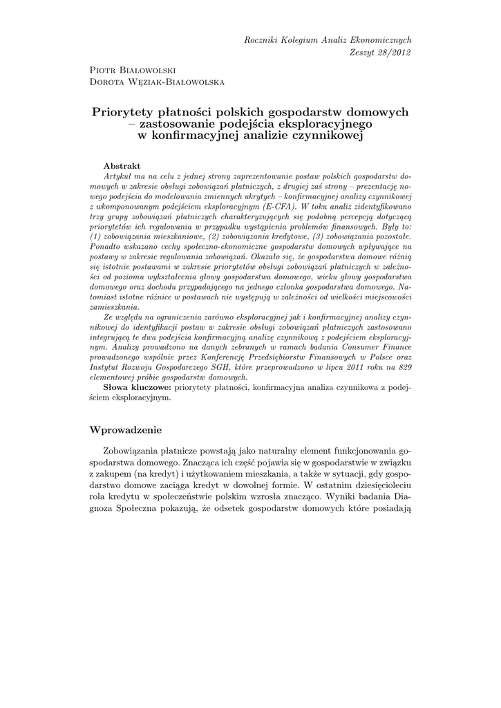Roczniki Kolegium Analiz Ekonomicznych Zeszyt 28/2012 Piotr Białowolski Dorota Węziak-Białowolska Priorytety płatności polskich gospodarstw domowych – zastosowanie podejścia eksploracyjnego w konfirmacyjnej analizie czynnikowej Abstrakt Artykuł ma na celu z jednej strony zaprezentowanie postaw polskich gospodarstw domowych w zakresie obsługi zobowiązań płatniczych, z drugiej zaś strony – prezentację nowego podejścia do modelowania zmiennych ukrytych – konfirmacyjnej analizy czynnikowej z wkomponowanym podejściem eksploracyjnym (E-CFA). W toku analiz zidentyfikowano trzy grupy zobowiązań płatniczych charakteryzujących się podobną percepcją dotyczącą priorytetów ich regulowania w przypadku wystąpienia problemów finansowych. Były to: (1) zobowiązania mieszkaniowe, (2) zobowiązania kredytowe, (3) zobowiązania pozostałe. Ponadto wskazano cechy społeczno-ekonomiczne gospodarstw domowych wpływające na postawy w zakresie regulowania zobowiązań. Okazało się, że gospodarstwa domowe różnią się istotnie postawami w zakresie priorytetów obsługi zobowiązań płatniczych w zależności od poziomu wykształcenia głowy gospodarstwa domowego, wieku głowy gospodarstwa domowego oraz dochodu przypadającego na jednego członka gospodarstwa domowego. Natomiast istotne różnice w postawach nie występują w zależności od wielkości miejscowości zamieszkania. Ze względu na ograniczenia zarówno eksploracyjnej jak i konfirmacyjnej analizy czynnikowej do identyfikacji postaw w zakresie obsługi zobowiązań płatniczych zastosowano integrującą te dwa podejścia konfirmacyjną analizę czynnikową z podejściem eksploracyjnym. Analizy prowadzono na danych zebranych w ramach badania Consumer Finance prowadzonego wspólnie przez Konferencję Przedsiębiorstw Finansowych w Polsce oraz Instytut Rozwoju Gospodarczego SGH, które przeprowadzono w lipcu 2011 roku na 829 elementowej próbie gospodarstw domowych. Słowa kluczowe: priorytety płatności, konfirmacyjna analiza czynnikowa z podejściem eksploracyjnym. Wprowadzenie Zobowiązania płatnicze powstają jako naturalny element funkcjonowania gospodarstwa domowego. Znacząca ich część pojawia się w gospodarstwie w związku z zakupem (na kredyt) i użytkowaniem mieszkania, a także w sytuacji, gdy gospodarstwo domowe zaciąga kredyt w dowolnej formie. W ostatnim dziesięcioleciu rola kredytu w społeczeństwie polskim wzrosła znacząco. Wyniki badania Diagnoza Społeczna pokazują, że odsetek gospodarstw domowych które posiadają 180 Piotr Białowolski, Dorota Węziak-Białowolska zobowiązanie kredytowe, pozostaje na poziomie około 40%, ale przeciętna wielkość tego zobowiązania znacząco wzrasta (Białowolski i Kotowska 2011). Fakt korzystania przez polskie gospodarstwa domowe z odroczonych płatności i kredytów wiąże się ze zwiększoną ekspozycją na ryzyko braku spłaty instytucji udzielających pożyczek i kredytów (także kredytu kupieckiego). W takiej sytuacji zasadnym wydaje się zbadanie priorytetów płatności gospodarstw domowych w Polsce w obszarze podstawowych grup zobowiązań, które pozwoli lepiej scharakteryzować postawy gospodarstw domowych związane z moralnością płatniczą. W Polsce podejmowane były już próby oceny moralności płatniczej gospodarstw domowych w różnego zależności od typu zobowiązań (por. Białowolski i Lewicka-Strzałecka 2007). Wyniki tamtych badań wskazują na istnienie dość silnych postaw moralnych w obszarze (1) regulowania zobowiązań mieszkaniowych i (2) wobec znajomych oraz bardzo słabo rozwiniętych postaw moralnych w obszarze regulowania należności wobec państwa, a także zatajania istotnych informacji przy zaciąganiu kredytu. W dzisiejszych czasach etyka regulowania zobowiązań jest w coraz mniejszym stopniu postrzegana jako czynnik sam w sobie skłaniający do wywiązania się ze zobowiązania (Kołakowski 2003). Natomiast coraz ważniejszą rolę zaczyna odgrywać windykacja, która okazuje się skuteczna nawet w przypadku zobowiązań tradycyjnie związanych z niską moralnością płatniczą. Połączenie tych dwóch obszarów – etyki i skuteczności egzekwowania zobowiązań – przekłada się na priorytety płatności gospodarstw domowych. Biorąc powyższe pod uwagę, w artykule przedstawiono wyniki badania, którego celem było: (1) zidentyfikowanie typów zobowiązań, które przez gospodarstwa domowe postrzegane są jako charakteryzujące się podobnymi poziomami moralności płatniczej, (2) określenie, czy czynniki społeczno-ekonomiczne, takie jak wiek głowy gospodarstwa domowego, wykształcenie głowy gospodarstwa domowego i dochody gospodarstwa domowego przypadające na jednego członka determinują postawy gospodarstw domowych w obszarze regulowania zobowiązań. Dane Dane do analiz zebrane zostały w okresie 01.07.2011 – 31.07.2011 w ramach badania Consumer Finance prowadzonego wspólnie przez Konferencję Przedsiębiorstw Finansowych w Polsce oraz Instytut Rozwoju Gospodarczego SGH. Badanie przeprowadzono na 829 elementowej próbie gospodarstw domowych. Gospodarstwa te do badania wylosowano dwustopniowo. W pierwszym kroku powarstwowano populację według województw, a następnie w województwach losowano respondentów z uwzględnieniem grup wieku. Losowanie przeprowadzono Priorytety płatności polskich gospodarstw domowych... 181 z wykorzystaniem bazy danych PESEL. Kwestionariusz ankietowy kierowano do konkretnej osoby z gospodarstwa domowego1 , jednakże zakres tematyczny pytań odnosił się do sytuacji całego gospodarstwa domowego.2 Gospodarstwa domowe pytano o priorytety płatności w przypadku wystąpienia w gospodarstwie domowym problemów finansowych. Analizę prowadzono w wybranych obszarach, stanowiących na ogół najbardziej znaczące pozycje w ich budżetach. Zobowiązania płatnicze obejmowały: (1) czynsz za mieszkanie, (2) opłaty za prąd, gaz, wodę, (3) rachunek za telefon, 