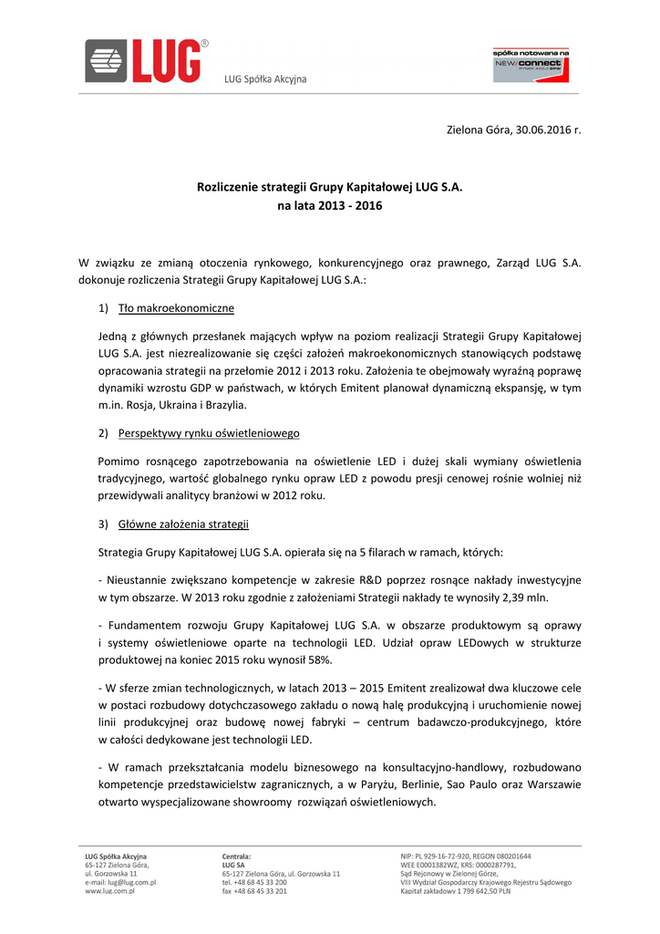 Zielona Góra, 30.06.2016 r. Rozliczenie strategii Grupy Kapitałowej LUG S.A. na lata 2013 - 2016 W związku ze zmianą otoczenia rynkowego, konkurencyjnego oraz prawnego, Zarząd LUG S.A. dokonuje rozliczenia Strategii Grupy Kapitałowej LUG S.A.: 1) Tło makroekonomiczne Jedną z głównych przesłanek mających wpływ na poziom realizacji Strategii Grupy Kapitałowej LUG S.A. jest niezrealizowanie się części założeń makroekonomicznych stanowiących podstawę opracowania strategii na przełomie 2012 i 2013 roku. Założenia te obejmowały wyraźną poprawę dynamiki wzrostu GDP w państwach, w których Emitent planował dynamiczną ekspansję, w tym m.in. Rosja, Ukraina i Brazylia. 2) Perspektywy rynku oświetleniowego Pomimo rosnącego zapotrzebowania na oświetlenie LED i dużej skali wymiany oświetlenia tradycyjnego, wartość globalnego rynku opraw LED z powodu presji cenowej rośnie wolniej niż przewidywali analitycy branżowi w 2012 roku. 3) Główne założenia strategii Strategia Grupy Kapitałowej LUG S.A. opierała się na 5 filarach w ramach, których: - Nieustannie zwiększano kompetencje w zakresie R&D poprzez rosnące nakłady inwestycyjne w tym obszarze. W 2013 roku zgodnie z założeniami Strategii nakłady te wynosiły 2,39 mln. - Fundamentem rozwoju Grupy Kapitałowej LUG S.A. w obszarze produktowym są oprawy i systemy oświetleniowe oparte na technologii LED. Udział opraw LEDowych w strukturze produktowej na koniec 2015 roku wynosił 58%. - W sferze zmian technologicznych, w latach 2013 – 2015 Emitent zrealizował dwa kluczowe cele w postaci rozbudowy dotychczasowego zakładu o nową halę produkcyjną i uruchomienie nowej linii produkcyjnej oraz budowę nowej fabryki – centrum badawczo-produkcyjnego, które w całości dedykowane jest technologii LED. - W ramach przekształcania modelu biznesowego na konsultacyjno-handlowy, rozbudowano kompetencje przedstawicielstw zagranicznych, a w Paryżu, Berlinie, Sao Paulo oraz Warszawie otwarto wyspecjalizowane showroomy rozwiązań oświetleniowych. - Grupa Kapitałowa nie zrealizowała w pełni założeń strategii w obszarze umacniania swojej pozycji na rynkach zagranicznych. W wyniku kryzysu rosyjsko – ukraińskiego udział Emitenta w tych rynkach drastycznie obniżył się. Przychody z rynku rosyjskiego i ukraińskiego spadły w 2015 roku o ponad 65% r/r. Działalność spółki LUG T.O.W. Ukraina pozostawała zawieszona. Ta sytuacja wpłynęła na poziom realizacji celów w obszarze przychodów ze sprzedaży krajowej i eksportowej. Przychody w kraju w roku 2015 w stosunku do wyjściowego roku 2012 spadły o 0,65%, natomiast przychody z eksportu w 2015 roku w stosunku do 2012 roku wzrosły o 20%. Całkowite przychody Grupy Kapitałowej LUG S.A. w 2015 roku w stosunku do przychodów w 2012 roku wzrosły o 9%. - Założenia makroekonomiczne wobec gospodarki Brazylii zawiodły. PKB Brazylii z poziomu 7,5% w 2010 roku spadło do poziomu -4,35% w 2015 roku, co negatywnie wpłynęło na realizację założeń strategicznych Grupy Kapitałowej LUG S.A. Brazylijska spółka zależna LUG do Brazil Ltda. nie osiągnęła zamierzonego progu rentowności, mimo pozytywnego przyjęcia przez rynek brazylijski produktów LUG i zdobycia kontraktu na oświetlenie metra w Sao Paulo. - Zmiany, które zaszły w otoczenie ekonomicznym wpłynęły na kondycję branży oraz preferencje zakupowe klientów Grupy Kapitałowej LUG S.A. Efektem tego był mniej dynamiczny od zakładanego wzrost udziałów marki Flash DQ w strukturze sprzedażowej Emitenta. Dostosowując się do specyfiki branży, Zarząd LUG S.A. w 2014 roku podjął decyzję o utworzeniu marki LUG BOX, która nie była ujęta w strategii. Marka ta jest połączeniem bardzo dobrych parametrów technicznych, bezkonkurencyjnej ceny oraz dużej dostępności. Udział LUG BOX w 2015 roku w sprzedaży LUG wynosił około 17%. - W związku z trwającym w latach 2013 – 2015 intensywnym procesem inwestycyjnym Emitent, na mocy uchwały Walnego Zgromadzenia, nie wypłacał w analizowanym okresie dywidendy, przeznaczając zyski w całości na kapitał zakładowy LUG S.A. Wskazane powyżej przesłanki wpłynęły na opóźnienie realizacji niektórych celów strategicznych, w związku z czym Zarząd Emitenta podjął decyzję o odwołaniu Strategii Grupy Kapitałowej LUG S.A. na lata 2013 – 2016.