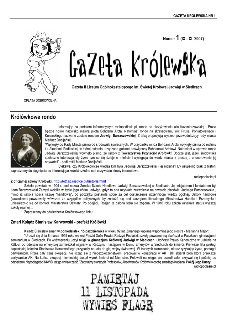 GAZETA KRÓLEWSKA NR 1 Numer 1 (IX - XI 2007) Gazeta II Liceum Ogólnokształcącego im. Świętej Królowej Jadwigi w Siedlcach OPŁATA DOBROWOLNA Królówkowe rondo Informując za portalem informacyjnym radiopodlasie.pl, rondo na skrzyŜowaniu ulic Kazimierzowskiej i Prusa będzie nosiło nazwisko majora pilota Bohdana Arcta. Natomiast rondo na skrzyŜowaniu ulic Prusa, Poniatowskiego i Konarskiego nazwane zostało rondem Jadwigi Barszczewskiej. Z taką propozycją wyszedł przewodniczący rady miasta Mariusz Dobijański. "Wpłynęły do Rady Miasta pisma od środowisk społecznych. W przypadku ronda Bohdana Arcta wpłynęły pisma od rodziny i z Akademii Podlaskiej, w której ostatnio urządzono gabinet poświęcony Bohdanowi Artctowi. Natomiast w sprawie ronda Jadwigi Barszczewskiej wpłynęło pismo, ze szkoły z Towarzystwa Przyjaciół Królówki. Dobrze jest, jeŜeli środowiska społeczne interesują się Ŝywo tym co się dzieje w mieście i występują do władz miasta z prośbą o uhonorowanie jej obywateli” - podkreślił Mariusz Dobijański. Ciekawe, czy Królówkowicze wiedzą kim była Jadwiga Barszczewska i jej rodzina? By uzupełnić braki z historii zapraszamy do sięgnięcia po interesujące kroniki szkolne no i oczywiście strony internetowe. radiopodlasie.pl Z oficjalnej strony Królówki: http://lo2.ap.siedlce.pl/historia.html Szkoła powstała w 1904 r. pod nazwą śeńska Szkoła Handlowa Jadwigi Barszczewskiej w Siedlcach. Jej inicjatorem i fundatorem był Leon Barszczewski Zamysł wcieliła w Ŝycie jego córka Jadwiga, gdyŜ to ona uzyskała zezwolenie na otwarcie placówki. Jadwiga Barszczewska , mimo iŜ szkoła nosiła nazwę "handlowej", od początku postawiła sobie za cel dostarczenie uczennicom wiedzy ogólnej. Szkoły handlowe (zawodowe) powstawały wówczas ze względów politycznych, by znaleźć się pod zarządem liberalnego Ministerstwa Handlu i Przemysłu i uniezaleŜnić się od kontroli Ministerstwa Oświaty. Po odejściu Rosjan ta osłona stała się zbędna. W 1916 roku szkoła uzyskała status wyŜszej szkoły realnej… Zapraszamy do odwiedzenia Królówkowego linku. Zmarł Ksiądz Stanisław Karwowski - prefekt Królówki Ksiądz Stanisław zmarł w poniedziałek, 15 października w wieku 92 lat. Zmarłego kapłana wspomina jego siostra - Marianna Major: "Urodził się dnia 8 marca 1915 roku we wsi Paszki DuŜe Powiat Radzyń Podlaski, szkołę powszechną skończył w Paszkach, gimnazjum i seminarium w Siedlcach. Po wyświęceniu uczył religii w gimnazjum Królowej Jadwigi w Siedlcach, ukończył Prawo Kanoniczne w Lublinie na KUL-u, po odejściu na emeryturę zamieszkał najpierw w Radzyniu, następnie w Domu Emerytów w Siedlcach do śmierci. Pierwsze lata posługi kapłańskiej księdza Stanisława Karwowskiego przypadły na lata drugiej wojny światowej. W trudnych warunkach, nieraz ryzykując Ŝycie, pomagał partyzantom. Przez cały czas okupacji, nie licząc się z niebezpieczeństwem, pracował w konspiracji w AK i BH zbierał broń którą przekazał partyzantce AK. Na końcu okupacji niemieckiej dostał wyrok śmierci od Niemców. Polowali na niego, ale uszedł cało, ukrywał się i później po odzyskaniu niepodległości NKWD teŜ go chciało zabić.” Zapytajmy starszych Profesorów, Absolwentów Królówki o osobę zmarłego Kapłana. Pokój Jego Duszy. radiopodlasie.pl GAZETA KRÓLEWSKA NR 1 Niezwykły dzień Niezwykłej Osoby. Chyba kaŜdy z nas wie, kim był Jan Paweł II, ale niestety nie kaŜdy pamięta o tym, co nam po sobie pozostawił. Doskonałą okazją do odświeŜenia oraz uzupełnienia swojej wiedzy o dorobku PapieŜa Polaka były organizowane juŜ po raz siódmy Dni Papieskie. W naszej szkole we wtorek, 16 października odbył się apel, przygotowany przez klasę IId pod kierownictwem KsięŜy: Jarosława Wasilewskiego i Waldemara Kułaka, a takŜe Pani Anny Pawlik. śyciorys Karola Wojtyły przedstawili: Aleksandra Węglewicz, Maciej Drzewiczak i Marta Pasterska. MoŜna było dowiedzieć się wielu zadziwiających ciekawostek z Ŝycia Wielkiego Rodaka, takich jak np. fakt, Ŝe PapieŜ nie lubił papamobile. Trafiające do serc przemówienie wygłosiła Dyrektor Jolanta Bieniek, przypominając nam to, co czuliśmy 2 kwietnia dwa lata temu. Z tymi przemyśleniami korespondował odczytany fragment "Tryptyku Rzymskiego”. Ponadto podczas tego dnia, poprzez sprzedaŜ ciast upieczonych przez kaŜda klasę, zbierano fundusze na Fundację Dzieło Nowego Tysiąclecia, która sponsoruje stypendia dla zdolnych, młodych ludzi z ubogich rodzin. Podobna akcja odbyła się takŜe w Prusie. Warto wspomnieć, Ŝe kaŜda ze szkół zebrała około tysiąca złotych. Królówkowicze! Niech kaŜdy z Was zada sobie w tym miejscu pytanie: czy pamiętam choć jedną myśl, choć jedno zdanie z pontyfikatu Jana Pawła II i czy to zdanie z pełną świadomością staram się wcielać w Ŝycie? Nie pozostańmy tylko na pewnym sentymentalizmie, ale starajmy się "wypłynąć na głębię” jako pokolenie JPII. Katarzyna Ołdakowska, Artur Grabowski Id Dzieło JP II potrzebuje kontynuatorów W poniedziałek, 8 października Siedlczanie rozpoczęli obchody VII Dni Papieskich, których, centralne uroczystości odbyły się 16 października, w rocznicę wyboru kardynała Karola Wojtyły na papieŜa. W ramach tego wydarzenia mogliśmy uczestniczyć w licznych wykładach, konkursach, koncertach, wystawach oraz spektaklach opartych na poezji i prozie Jana Pawła II. Dni Papieskie były teŜ waŜnym wydarzeniem dla melomanów. We wtorek w siedleckiej katedrze odbył się koncert Magnificat Anima Mea Dominum z udziałem Chóru Miasta Siedlce oraz jednej z najlepszych orkiestr w Polsce Concerto Avenna. Była to okazja do usłyszenia solistów, jakich dotąd nie gościliśmy w naszym mieście, a Magnificat Bacha naleŜy do najtrudniejszych i najbardziej poruszających dzieł muzycznych na świecie. Sympatycy piłki noŜnej takŜe mogli zna