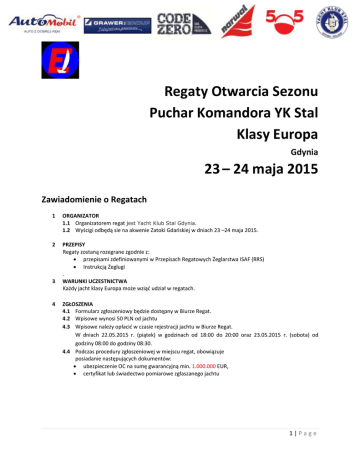 Regaty Otwarcia Sezonu Puchar Komandora YK Stal Klasy Europa Gdynia 23 – 24 maja 2015 Zawiadomienie o Regatach 1 ORGANIZATOR 1.1 Organizatorem regat jest Yacht Klub Stal Gdynia. 1.2 Wyścigi odbędą sie na akwenie Zatoki Gdańskiej w dniach 23 –24 maja 2015. 2 PRZEPISY Regaty zostaną rozegrane zgodnie z: przepisami zdefiniowanymi w Przepisach Regatowych Żeglarstwa ISAF (RRS) Instrukcją Żeglugi . WARUNKI UCZESTNICTWA Każdy jacht klasy Europa może wziąć udział w regatach. 3 4 ZGŁOSZENIA 4.1 Formularz zgłoszeniowy będzie dostępny w Biurze Regat. 4.2 Wpisowe wynosi 50 PLN od jachtu 4.3 Wpisowe należy opłacić w czasie rejestracji jachtu w Biurze Regat. W dniach 22.05.2015 r. (piątek) w godzinach od 18:00 do 20:00 oraz 23.05.2015 r. (sobota) od godziny 08:00 do godziny 08:30. 4.4 Podczas procedury zgłoszeniowej w miejscu regat, obowiązuje posiadanie następujących dokumentów: ubezpieczenie OC na sumę gwarancyjną min. 1.000.000 EUR, certyfikat lub świadectwo pomiarowe zgłaszanego jachtu 1|Page 5 PROGRAM REGAT 5.1 Planowany program regat: Dzień Data Piątek 22.05.2015r. Sobota 23.05.2015r. Niedziela 24.05.2015r. Godzina 16:00-18:00 18:00-20:00 20:00-23:00 08:00-08:30 11:00 18:00 - 23:00 10:00 po wyścigach Wydarzenie Oficjalny trening Zgłoszenia do regat Odprawa po treningu Zgłoszenia do regat Rozpoczęcie wyścigów (4 wyścigi) Podsumowanie wyscigów Rozpoczęcie wyścigów (3 wyścigi) Zakończenie regat 5.2 Planowane jest rozegranie 7 wyścigów. 5.3 W dniu 24.05.2015 r. (niedziela) sygnał „ostrzeżenie” nie może być podany później niż o godz. 13:00. 6 INSTRUKCJA ŻEGLUGI Instrukcja Żeglugi będzie dostępna po zakończeniu procedury zgłoszeniowej w biurze regat. 7 BEZPIECZEŃSTWO 7.1 Załogi są zobowiązane do żeglowania w kamizelkach asekuracyjnych przez cały czas trwania regat. Jeśli członek załogi, w trakcie trwania wyścigu, nie będzie ubrany w kamizelkę asekuracyjną, załoga zostanie zdyskwalifikowana z wyścigu (DSQ). 7.2 Każdy jacht musi być wyposażona w linę pływająca o długości min. 14 metrów i średnicy min. 6 mm. 8 POMIARY Pomiary kontrolne sprzętu określonego przepisami regatowymi i klasowymi mogą zostać dokonane w dowolnym momencie w trakcie trwania regat. 9 PUNKTACJA 9.1 Regaty zostaną uznane za ważne w przypadku rozegrania minimum 3 wyścigów. 9.2 W przypadku rozegrania mniej niż 4 wyścigów, wszystkie wyniki jachtu w serii wyścigów liczone są do jego punktacji końcowej. W przypadku rozegrania 4 i więcej wyścigów, jeden najgorszy rezultat jachtu będzie odrzucony. 10 PRAWA DO WIZERUNKU Zgłaszając się do regat zawodnik wyraża zgodę na bezpłatne wykorzystanie swego wizerunku przez Organizatorów i Sponsorów podczas zdjęć, filmów i innych produkcji przygotowanych w czasie trwania regat oraz we wszystkich materiałach i publikacjach dotyczących regat 11 REKLAMOWANIE Zawodnicy są zobowiązani do umieszczania na łodzi reklamy sponsorów regat. W regatach ma zastosowanie dokument: „ISAF Advertising Code”. 12 ŁODZIE TOWARZYSZĄCE Łodzie towarzyszące powinny zostać zgłoszone w biurze regat. Łodzie towarzyszące nie mogą przeszkadzać jachtom biorącym udział w wyścigu. 13 RADIO I TELEFON 2|Page W trakcie trwania wyścigów załogi jachtów nie mogą korzystać z urządzeń radiowych lub telefonów komórkowych. Zakaz ten nie obejmuje sytuacji bezpośredniego zagrożenia bezpieczeństwa załogi. 14 NAGRODY Dla zawodników zajmujących w końcowej klasyfikacji generalnej miejsca 1-3 przewidziano nagrody. 15 ZASTRZEŻENIE ODPOWIEDZIALNOŚCI Wszyscy uczestnicy biorą udział w regatach na własną odpowiedzialność. Żadna z czynności wykonana lub niewykonana przez organizatorów nie zwalnia uczestników regat od ponoszenia odpowiedzialności za jakąkolwiek szkodę spowodowaną lub poniesioną przez zawodników lub ich jacht. 16 KONTAKT: W przypadku jakichkolwiek pytań prosimy o kontakt. Yacht Klub Stal email. [email protected] Kom. +48 601 672 262 - Kajetan Kilanowski 3|Page INFORMACJE DODATKOWE (nie będące częścią Zawiadomienia): Jachty: Parking dla jachtów zlokalizowany będzie przed budynkiem YK Stal Gdynia. Przyczepy podłodziowe: Miejsce na przyczepy podłodziowe zostanie wyznaczone w okolicach Klubu. Samochody: Nie ma możliwości pozostawienia samochodów na parkingu w Marinie Gdynia. NOCLEGI: Akademia Morska Studencki Dom Marynarza nr 2 ul. Franciszka Sędzickiego 19 tel.. +48 58 620 27 01 http://www.poland-tourism.pl/pl/domy-studenckie/studencki-dom-marynarza-nr-2/ Hotel Orbis Gdynia ul. Armii Krajowej 22 tel.: +48 (0) 58 666 30 40 http://www.accorhotels.com/pl/hotel-3417-hotel-orbis-gdynia/index.shtml "Monika" Pokoje Gościnne ul. Wincentego Pola 12 tel. +48 (0) 58 622 82 40 http://www.pokojemonika.home.pl/ HOSTEL M@RINA Al. Jana Pawła II 9 (Skwer Kościuszki) 8-345 Gdynia tel. +48 (0) 58 739 205 580. 4|Page