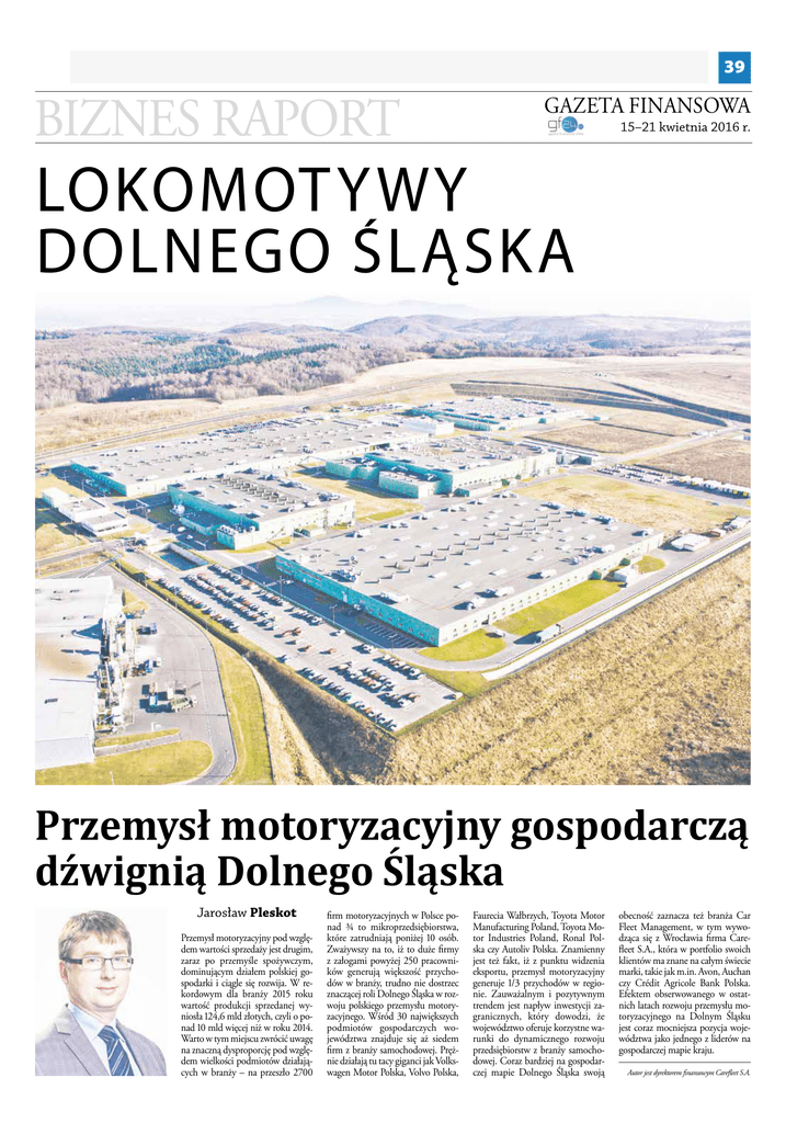39 BIZNES RAPORT GAZETA FINANSOWA 15–21 kwietnia 2016 r. LOKOMOTYWY DOLNEGO ŚLĄSKA Przemysł motoryzacyjny gospodarczą dźwignią Dolnego Śląska Jarosław Pleskot Przemysł motoryzacyjny pod względem wartości sprzedaży jest drugim, zaraz po przemyśle spożywczym, dominującym działem polskiej gospodarki i ciągle się rozwija. W rekordowym dla branży 2015 roku wartość produkcji sprzedanej wyniosła 124,6 mld złotych, czyli o ponad 10 mld więcej niż w roku 2014. Warto w tym miejscu zwrócić uwagę na znaczną dysproporcję pod względem wielkości podmiotów działających w branży – na przeszło 2700 firm motoryzacyjnych w Polsce ponad ¾ to mikroprzedsiębiorstwa, które zatrudniają poniżej 10 osób. Zważywszy na to, iż to duże firmy z załogami powyżej 250 pracowników generują większość przychodów w branży, trudno nie dostrzec znaczącej roli Dolnego Śląska w rozwoju polskiego przemysłu motoryzacyjnego. Wśród 30 największych podmiotów gospodarczych województwa znajduje się aż siedem firm z branży samochodowej. Prężnie działają tu tacy giganci jak Volkswagen Motor Polska, Volvo Polska, Faurecia Wałbrzych, Toyota Motor Manufacturing Poland, Toyota Motor Industries Poland, Ronal Polska czy Autoliv Polska. Znamienny jest też fakt, iż z punktu widzenia eksportu, przemysł motoryzacyjny generuje 1/3 przychodów w regionie. Zauważalnym i pozytywnym trendem jest napływ inwestycji zagranicznych, który dowodzi, że województwo oferuje korzystne warunki do dynamicznego rozwoju przedsiębiorstw z branży samochodowej. Coraz bardziej na gospodarczej mapie Dolnego Śląska swoją obecność zaznacza też branża Car Fleet Management, w tym wywodząca się z Wrocławia firma Carefleet S.A., która w portfolio swoich klientów ma znane na całym świecie marki, takie jak m.in. Avon, Auchan czy Crédit Agricole Bank Polska. Efektem obserwowanego w ostatnich latach rozwoju przemysłu motoryzacyjnego na Dolnym Śląsku jest coraz mocniejsza pozycja województwa jako jednego z liderów na gospodarczej mapie kraju. Autor jest dyrektorem finansowym Carefleet S.A. LOKOMOTYWY DOLNEGO ŚLĄSKA 40 BIZNES RAPORT GAZETA FINANSOWA 15–21 kwietnia 2016 r. Jakość życia w regionie dolnośląskim. Niwelowanie dysproporcji. Na jakość życia społeczeństwa wpływa wiele czynników. Choć Polsce nadal brakuje wielu punktów do „najszczęśliwszych” krajów na świecie, to Dolny Śląsk jest jednym z najatrakcyjniejszych miejsc w kraju. Jakie są mocne strony regionu, a czego wciąż do szczęścia brakuje mieszkańcom? długookresowe dążenie do poprawy warunków ludzkiego życia. prof. dr hab. Krzysztof Safin Określenie koncepcji rozwoju społecznego i gospodarczego – niezależnie od tego czy dotyczy szczebla centralnego czy regionalnego – wymaga definiowania jej celów i środków realizacji. Zwykle zakłada się, że jednymi z najbardziej miarodajnych są cele formułowane w kategoriach jakości życia. Przyjmuje się bowiem, że nie ma innych powodów dla mobilizowania wysiłków społeczeństwa, eksploatowania zasobów i naruszania równowagi środowiska naturalnego, tworzenia barier i ograniczeń prawnych swobód obywatelskich itp. jak Jakość życia jako miara atrakcyjności regionu Pojęcie jakości życia nie jest rozumiane jednoznacznie. Dla jednych oznacza ono stopień zadowolenia z własnej egzystencji, dla innych – obiektywne warunki życia istotne dla potrzeb człowieka. Dążeniem kreatorów polityki społecznej i gospodarczej jest więc stworzenie takich ogólnych warunków życia, na które składają się czynniki obiektywne (np. przeciętne trwanie życia) jak i subiektywne (np. poziom szczęścia), przy których „można będzie mówić o dobrym i pięknym życiu”. Jakość życia może być traktowana jako miara atrakcyjności określonego kraju (regionu) dla jego obecnych i przyszłych mieszkańców (ze względu na jakość życia ludzie osiedlają się w jednym miejscu chętniej niż w innym). Z tych powodów wiedza o jakości życia na poziomie kraju nie wystarcza. Chociaż życie toczy się w ramach ogólnych warunków makroekonomicznych, politycznych i prawnych, to jednak także w określonych lokalnych uwarunkowaniach przyrodniczych, infrastrukturalnych, przy określonej wrogości bądź życzliwości najbliższych sąsiadów. Jakość życia w Polsce i na Dolnym Śląsku Poziom jakości życia określany dla krajów OECD wykazuje, że w większości obszarów (mierniki obiektywne) Polskę dzieli duży dystans do krajów o najwyższej punktacji. Znajduje się ona mniej więcej w połowie rankingu. Jednakże dla mieszkańców ważniejszy będzie poziom i zróżnico- Liderzy Dolnego Śląska Nazwa spółki Osoba zarządzająca Przychody netto w tys zł w 2015 r. Przychody netto w tys zł w 2014 r. 1 KGHM Polska Miedź Krzysztof Skóra 20 008 000,00 20 492 000,00 2 GK AB Andrzej Przybyło 7 080 008,00 6 438 133,00 3 CCC Dariusz Miłek 2 307 738,00 2 009 059,00 4 Workservice Maciej Witucki 2 136 717,00 1 739 756,00 5 Getin Holding Piotr Kaczmarek 2 053 999,00 2 193 734,00 6 Getin Noble Bank Krzysztof Sławomir Rosiński 1522559,00 1867587,00 7 Osadkowski Wojciech Osadkowski 1 448 732,00 1 156 283,00 8 PCC ROKITA Wiesław Klimkowski 1 048 749,00 1 092 943,00 9 SELENA FM Jarosław Michniuk 997 867,00 1 103 387,00 10 KGHM ZANAM Leszek Stojke 920 691,00 719 440,00 11 TunŻ Europa Marat Nevretdinov 885 327,00 914 517,00 12 KRUK Piotr Krupa 611 235,00 487 920,00 13 ROHLIG SUUS Logistics Tadeusz Chmielewski 601 000,00 574 000,00 14 Max Computers Daniel Drzewiński 588 788,00 428 666,00 15 Towarzystwo Ubezpieczeń Europa Marat Nevretdinov 560 194,00 582 051,00 16 Tarczyński Jacek Tarczyński 541 951,00 494 401,00 17 Energetyka Roman Walkowiak 399 078,00 299 321,00 18 Europejski Fundusz Leasingowy Radosław Kuczyński 396 154,58 397 814,28 19 Carefleet Frédéric Lustig 201 855,70 191 396,33 20 D.S.Germaz ANDRZEJ MAZUR 158 801,
