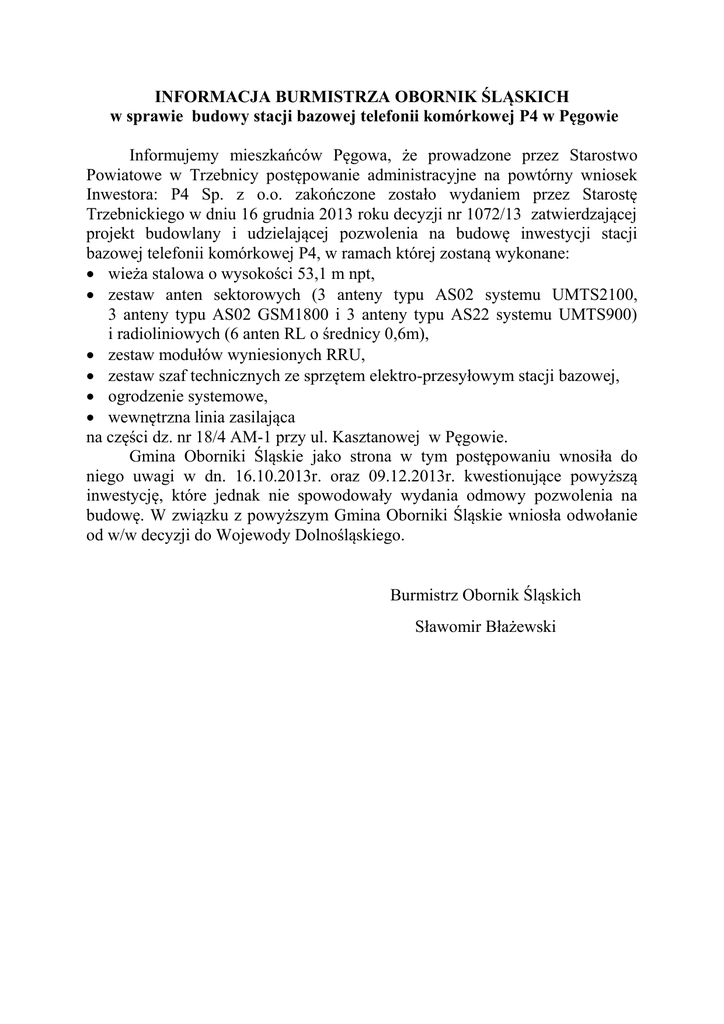 INFORMACJA BURMISTRZA OBORNIK ŚLĄSKICH w sprawie budowy stacji bazowej telefonii komórkowej P4 w Pęgowie Informujemy mieszkańców Pęgowa, że prowadzone przez Starostwo Powiatowe w Trzebnicy postępowanie administracyjne na powtórny wniosek Inwestora: P4 Sp. z o.o. zakończone zostało wydaniem przez Starostę Trzebnickiego w dniu 16 grudnia 2013 roku decyzji nr 1072/13 zatwierdzającej projekt budowlany i udzielającej pozwolenia na budowę inwestycji stacji bazowej telefonii komórkowej P4, w ramach której zostaną wykonane: wieża stalowa o wysokości 53,1 m npt, zestaw anten sektorowych (3 anteny typu AS02 systemu UMTS2100, 3 anteny typu AS02 GSM1800 i 3 anteny typu AS22 systemu UMTS900) i radioliniowych (6 anten RL o średnicy 0,6m), zestaw modułów wyniesionych RRU, zestaw szaf technicznych ze sprzętem elektro-przesyłowym stacji bazowej, ogrodzenie systemowe, wewnętrzna linia zasilająca na części dz. nr 18/4 AM-1 przy ul. Kasztanowej w Pęgowie. Gmina Oborniki Śląskie jako strona w tym postępowaniu wnosiła do niego uwagi w dn. 16.10.2013r. oraz 09.12.2013r. kwestionujące powyższą inwestycję, które jednak nie spowodowały wydania odmowy pozwolenia na budowę. W związku z powyższym Gmina Oborniki Śląskie wniosła odwołanie od w/w decyzji do Wojewody Dolnośląskiego. Burmistrz Obornik Śląskich Sławomir Błażewski