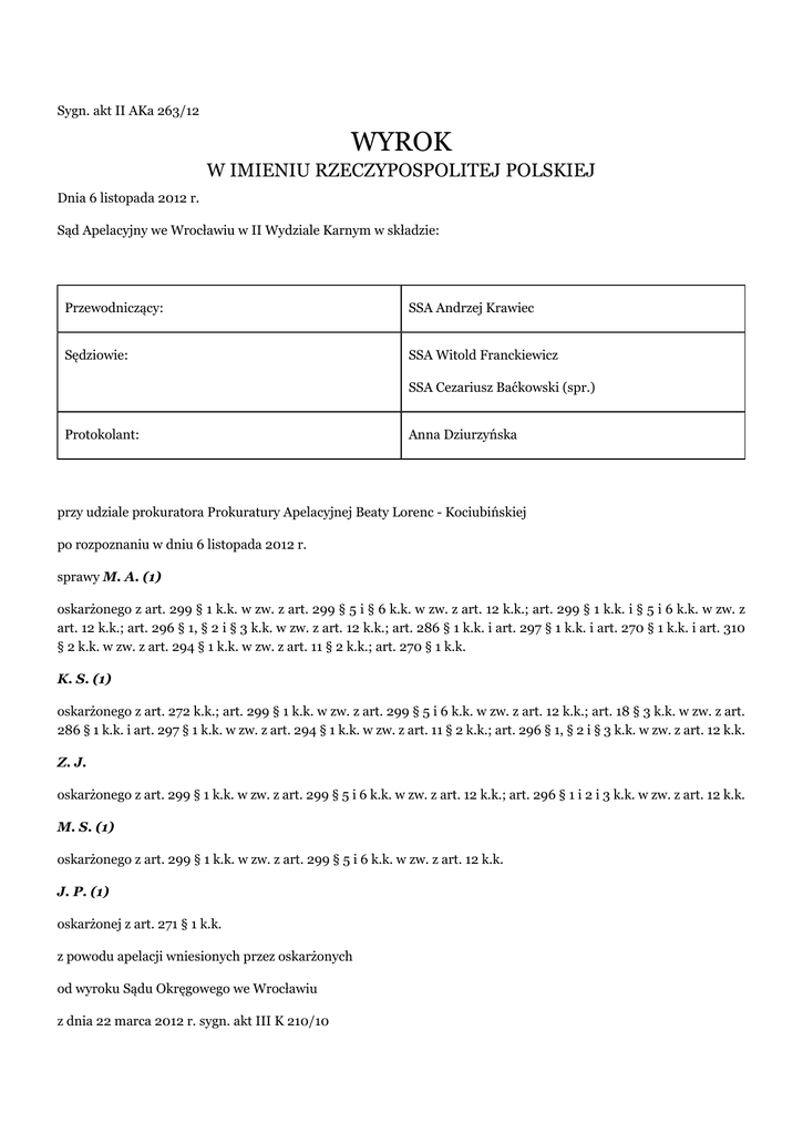 Sygn. akt II AKa 263/12 WYROK W IMIENIU RZECZYPOSPOLITEJ POLSKIEJ Dnia 6 listopada 2012 r. Sąd Apelacyjny we Wrocławiu w II Wydziale Karnym w składzie: Przewodniczący: SSA Andrzej Krawiec Sędziowie: SSA Witold Franckiewicz SSA Cezariusz Baćkowski (spr.) Protokolant: Anna Dziurzyńska przy udziale prokuratora Prokuratury Apelacyjnej Beaty Lorenc - Kociubińskiej po rozpoznaniu w dniu 6 listopada 2012 r. sprawy M. A. (1) oskarżonego z art. 299 § 1 k.k. w zw. z art. 299 § 5 i § 6 k.k. w zw. z art. 12 k.k.; art. 299 § 1 k.k. i § 5 i 6 k.k. w zw. z art. 12 k.k.; art. 296 § 1, § 2 i § 3 k.k. w zw. z art. 12 k.k.; art. 286 § 1 k.k. i art. 297 § 1 k.k. i art. 270 § 1 k.k. i art. 310 § 2 k.k. w zw. z art. 294 § 1 k.k. w zw. z art. 11 § 2 k.k.; art. 270 § 1 k.k. K. S. (1) oskarżonego z art. 272 k.k.; art. 299 § 1 k.k. w zw. z art. 299 § 5 i 6 k.k. w zw. z art. 12 k.k.; art. 18 § 3 k.k. w zw. z art. 286 § 1 k.k. i art. 297 § 1 k.k. w zw. z art. 294 § 1 k.k. w zw. z art. 11 § 2 k.k.; art. 296 § 1, § 2 i § 3 k.k. w zw. z art. 12 k.k. Z. J. oskarżonego z art. 299 § 1 k.k. w zw. z art. 299 § 5 i 6 k.k. w zw. z art. 12 k.k.; art. 296 § 1 i 2 i 3 k.k. w zw. z art. 12 k.k. M. S. (1) oskarżonego z art. 299 § 1 k.k. w zw. z art. 299 § 5 i 6 k.k. w zw. z art. 12 k.k. J. P. (1) oskarżonej z art. 271 § 1 k.k. z powodu apelacji wniesionych przez oskarżonych od wyroku Sądu Okręgowego we Wrocławiu z dnia 22 marca 2012 r. sygn. akt III K 210/10 I. uchyla zaskarżony wyrok w stosunku do oskarżonych M. A. (1), Z. J., K. S. (1) i M. S. (1) w pkt I i II części rozstrzygającej i przyjmując, że przypisany tam czyn skutkujący łącznym uszczupleniem 1 043 081 zł podatku dochodowego od osób prawnych wypełnia znamiona art. 56 § 1 k.k.s. w zw. z art. 6 § 2 k.k.s. i w zw. z art. 38 § 2 pkt 1 k.k.s. w brzmieniu obowiązującym do dnia 30.04.2004 roku (art. 2 § 2 k.k.s.) na podstawie art. 17 § 1 pkt 6 k.p.k. w zw. z art. 113 § 1 k.k.s. i art. 44 § 1 pkt 1 i § 3 k.k.s. postępowanie w tej części umarza stwierdzając, że kary łączne orzeczone wobec oskarżonych M. A. (2) i K. S. (1) w pkt XII części rozstrzygającej utraciły moc; II. zmienia zaskarżony wyrok w stosunku do oskarżonego M. A. (1) w pkt III części rozstrzygającej w ten sposób, że z opisu czynu tam przypisanego eliminuje zwrot: „przedkładane, stwierdzające nieprawdę faktury nie mają odzwierciedlenia w rzeczywistym obrocie gospodarczym, a transakcja zakupu linii technologicznej jest fikcyjna, zaś” i za podstawę skazania za ten czyn przyjmuje art. 297 § 1 k.k. i art. 294 § 1 k.k. w zw. z art. 286 § 1 k.k. w zw. z art. 11 § 2 k.k., a za podstawę wymiaru kary art. 294 § 1 k.k. w zw. z art. 11 § 3 k.k. i obniża do roku i 6 miesięcy orzeczoną za ten czyn karę pozbawienia wolności; III. zmienia zaskarżony wyrok wobec oskarżonego K. S. (1) w pkt VIII części rozstrzygającej w ten sposób, że uniewinnia go od popełniania czynu z art. 18 § 3 k.k. w zw. z art. 286 § 1 k.k. i art. 297 § 1 k.k. w zw. z art. 294 § 1 k.k. w zw. z art. 11 § 2 k.k.; IV. zmienia zaskarżony wyrok wobec oskarżonej J. P. (1) w ten sposób, że uniewinnia ją od popełniania czynu z art. 271 § 1 k.k. opisanego w pkt XIII części wstępnej zaskarżonego wyroku; V. w pozostałej części utrzymuje w moc zaskarżony wyrok w stosunku do oskarżonego M. A. (1); VI. na podstawie art. 85 k.k., art. 86 § 1 k.k. orzeka wobec oskarżonego M. A. (1) karę łączną roku i 6 miesięcy pozbawienia wolności i na podstawie art. 63 § 1 k.k. zalicza na poczet tej kary okres rzeczywistego pozbawienia wolności od 02.06.2004 roku do 30.11.2004 roku; VII. stwierdza, że Skarb Państwa ponosi koszty sądowe za obie instancje w częściach związanych z postępowaniem wobec oskarżonych J. P. (1), Z. J., K. S. (1) i M. S. (1) oraz w stosunku do M. A. (1) w zakresie czynu o jakim mowa w pkt I niniejszego wyroku; VIII. zasądza od oskarżonego M. A. (1) na rzecz Skarbu Państwa 4305 zł kosztów sądowych za postępowanie odwoławcze, w tym 4300 zł opłaty za obie instancje. UZASADNIENIE M. A. (1), K. S. (1), Z. J. (1) i M. S. (1) zostali oskarżeni o to, że: II. II. w okresie od dnia 29 stycznia 2001 roku do 21 listopada 2002 roku we W. w woj. (...), działając w krótkich odstępach czasu, w wykonaniu z góry powziętego zamiaru, wspólnie i w porozumieniu, wykorzystując działalność prowadzoną w ramach firmy Stowarzyszenia (...) z siedzibą we W. oraz działalność gospodarczą prowadzoną w ramach firm: (...) Spółka z ograniczoną odpowiedzialnością, (...) Spółka z ograniczoną odpowiedzialnością, (...) Spółka z ograniczoną odpowiedzialnością, (...) Spółka z ograniczoną odpowiedzialnością, T.. (...) Spółka z ograniczoną odpowiedzialnością, (...) Spółka z ograniczoną odpowiedzialnością, podjęli czynności związane z udaremnieniem bądź znacznym utrudnieniem stwierdzenia przestępnego pochodzenia pieniędzy w ten sposób, że M. A. (1) i K. S. (1), działający jako członkowie Zarządu Stowarzyszenia (...), założyli w dniu 29 stycznia 2001 roku rachunek bankowy w Banku (...) S.A. I Oddział we W. o numerze (...), na który przyjęli w formie wpłat i przelewów, pieniądze pochodzące z nie opodatkowanej działalności innych podmiotów gospodarczych w łącznej kwocie 2 036 000 złotych, a następnie pieniądze przyjęte na konto zostały wypłacone na podstawie czeków gotówkowych M. A. (1), M. S. (1), K. S. (1), Z. J. (1), a także przelane na konta innych podmiotów, osiągając znaczną korzyść majątkową, w łącznej kwocie 2 036 000 złotych, a w szczególności: - w dniu 14 lutego 2001 roku K. S. (1) wypłacił gotówkę w kwocie 10.000 zł, - w dniu 15 lutego 2001 roku M. A. (1) wypłacił gotówkę w kwocie 10.000 zł, - w dniu 06 marca 2001 roku M. A. (1) dokonał wypłaty gotówkowej na podstawie czeku nr (...) na kwotę 13.400 zł, - w dniu 4 kwietnia 