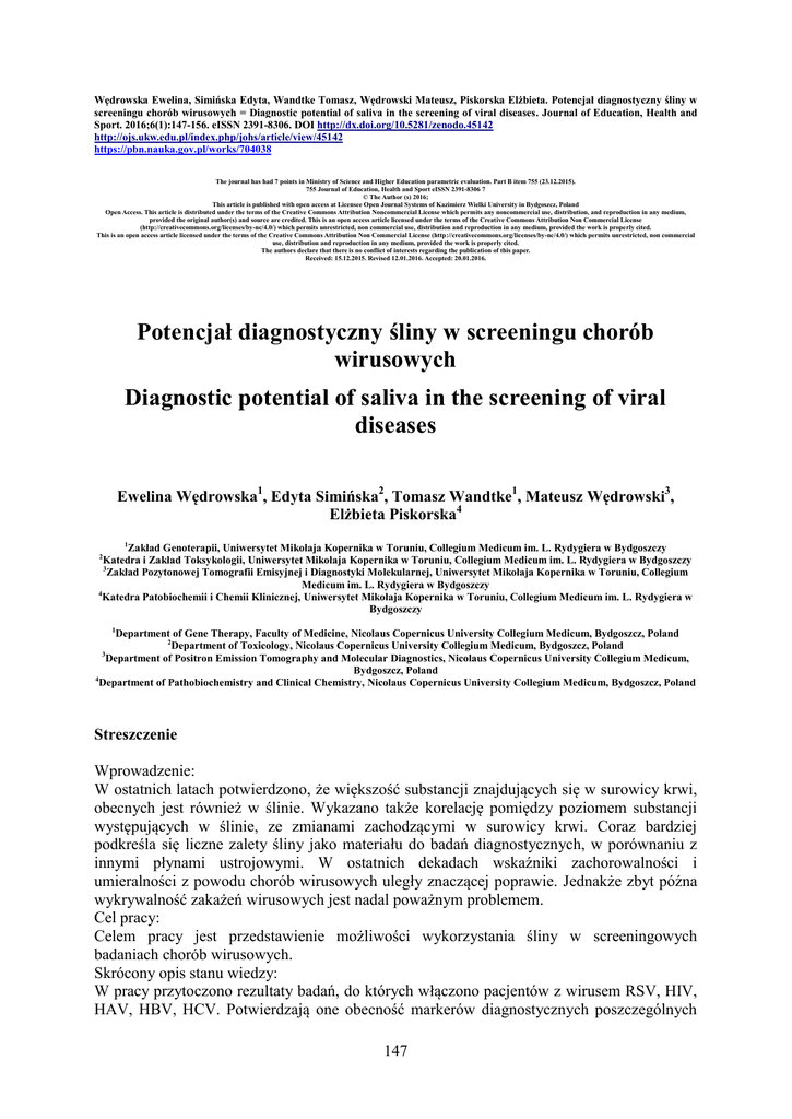 Wędrowska Ewelina, Simińska Edyta, Wandtke Tomasz, Wędrowski Mateusz, Piskorska Elżbieta. Potencjał diagnostyczny śliny w screeningu chorób wirusowych = Diagnostic potential of saliva in the screening of viral diseases. Journal of Education, Health and Sport. 2016;6(1):147-156. eISSN 2391-8306. DOI http://dx.doi.org/10.5281/zenodo.45142 http://ojs.ukw.edu.pl/index.php/johs/article/view/45142 https://pbn.nauka.gov.pl/works/704038 The journal has had 7 points in Ministry of Science and Higher Education parametric evaluation. Part B item 755 (23.12.2015). 755 Journal of Education, Health and Sport eISSN 2391-8306 7 © The Author (s) 2016; This article is published with open access at Licensee Open Journal Systems of Kazimierz Wielki University in Bydgoszcz, Poland Open Access. This article is distributed under the terms of the Creative Commons Attribution Noncommercial License which permits any noncommercial use, distribution, and reproduction in any medium, provided the original author(s) and source are credited. This is an open access article licensed under the terms of the Creative Commons Attribution Non Commercial License (http://creativecommons.org/licenses/by-nc/4.0/) which permits unrestricted, non commercial use, distribution and reproduction in any medium, provided the work is properly cited. This is an open access article licensed under the terms of the Creative Commons Attribution Non Commercial License (http://creativecommons.org/licenses/by-nc/4.0/) which permits unrestricted, non commercial use, distribution and reproduction in any medium, provided the work is properly cited. The authors declare that there is no conflict of interests regarding the publication of this paper. Received: 15.12.2015. Revised 12.01.2016. Accepted: 20.01.2016. Potencjał diagnostyczny śliny w screeningu chorób wirusowych Diagnostic potential of saliva in the screening of viral diseases Ewelina Wędrowska1, Edyta Simińska2, Tomasz Wandtke1, Mateusz Wędrowski3, Elżbieta Piskorska4 Zakład Genoterapii, Uniwersytet Mikołaja Kopernika w Toruniu, Collegium Medicum im. L. Rydygiera w Bydgoszczy Katedra i Zakład Toksykologii, Uniwersytet Mikołaja Kopernika w Toruniu, Collegium Medicum im. L. Rydygiera w Bydgoszczy 3 Zakład Pozytonowej Tomografii Emisyjnej i Diagnostyki Molekularnej, Uniwersytet Mikołaja Kopernika w Toruniu, Collegium Medicum im. L. Rydygiera w Bydgoszczy 4 Katedra Patobiochemii i Chemii Klinicznej, Uniwersytet Mikołaja Kopernika w Toruniu, Collegium Medicum im. L. Rydygiera w Bydgoszczy 1 2 1 Department of Gene Therapy, Faculty of Medicine, Nicolaus Copernicus University Collegium Medicum, Bydgoszcz, Poland 2 Department of Toxicology, Nicolaus Copernicus University Collegium Medicum, Bydgoszcz, Poland 3 Department of Positron Emission Tomography and Molecular Diagnostics, Nicolaus Copernicus University Collegium Medicum, Bydgoszcz, Poland 4 Department of Pathobiochemistry and Clinical Chemistry, Nicolaus Copernicus University Collegium Medicum, Bydgoszcz, Poland Streszczenie Wprowadzenie: W ostatnich latach potwierdzono, że większość substancji znajdujących się w surowicy krwi, obecnych jest również w ślinie. Wykazano także korelację pomiędzy poziomem substancji występujących w ślinie, ze zmianami zachodzącymi w surowicy krwi. Coraz bardziej podkreśla się liczne zalety śliny jako materiału do badań diagnostycznych, w porównaniu z innymi płynami ustrojowymi. W ostatnich dekadach wskaźniki zachorowalności i umieralności z powodu chorób wirusowych uległy znaczącej poprawie. Jednakże zbyt późna wykrywalność zakażeń wirusowych jest nadal poważnym problemem. Cel pracy: Celem pracy jest przedstawienie możliwości wykorzystania śliny w screeningowych badaniach chorób wirusowych. Skrócony opis stanu wiedzy: W pracy przytoczono rezultaty badań, do których włączono pacjentów z wirusem RSV, HIV, HAV, HBV, HCV. Potwierdzają one obecność markerów diagnostycznych poszczególnych 147 zakażeń w ślinie, wskazując tym samym na możliwość wykorzystania śliny w diagnostyce chorób wirusowych. Podsumowanie: Wysoka czułość, dokładność, silna korelacja ze stopniem zaawansowania choroby, to bez wątpienia cechy, jakie wykazują badania wykonywane w surowicy krwi. Wymagają one jednak zaawansowanej aparatury, są kosztowne, dość inwazyjne, trudne w przechowywaniu. Ważne jest zatem, aby poszukiwać nowych metod, możliwych do wykorzystania w badaniach screeningowych. Badania takie powinny łączyć technologie szybkiego wykrywania z zastosowaniem łatwego do pobrania materiału. Coraz częściej podkreśla się potencjał śliny, jako materiału diagnostycznego do tego rodzaju badań. Słowa kluczowe: ślina, wirusy, diagnostyka, infekcje. Summary Introduction: Results in recent years have confirmed that most of substances contained in the blood serum also exist in the saliva. Significant correlations were found between salivary and serum levels. Saliva as a diagnostic test material in compare to other body fluids has many advantages and its importance is growing. During the last decades viral diseases morbidity and mortality rates improved. However late detection of viral infections is still the most Aim of the study: The aim of the study is to present the possibilities of using saliva in the screening of viral diseases. Short description of state of knowledge: The study presents results of studies which included patients with RSV, HIV, HAV, HBV, HCV. These confirms the presence of the diagnostic markers in saliva, indicating the possibility of using saliva in the diagnosis of viral diseases. Summation: Analysis made in the blood serum display characteristics such as high sensitivity, precision and a strong correlation with stadium of disease. However, they require the advanced apparatus, are expensive, very invasive, difficult to store. It is important to looking for a new methods that can be used in screening test which should conn