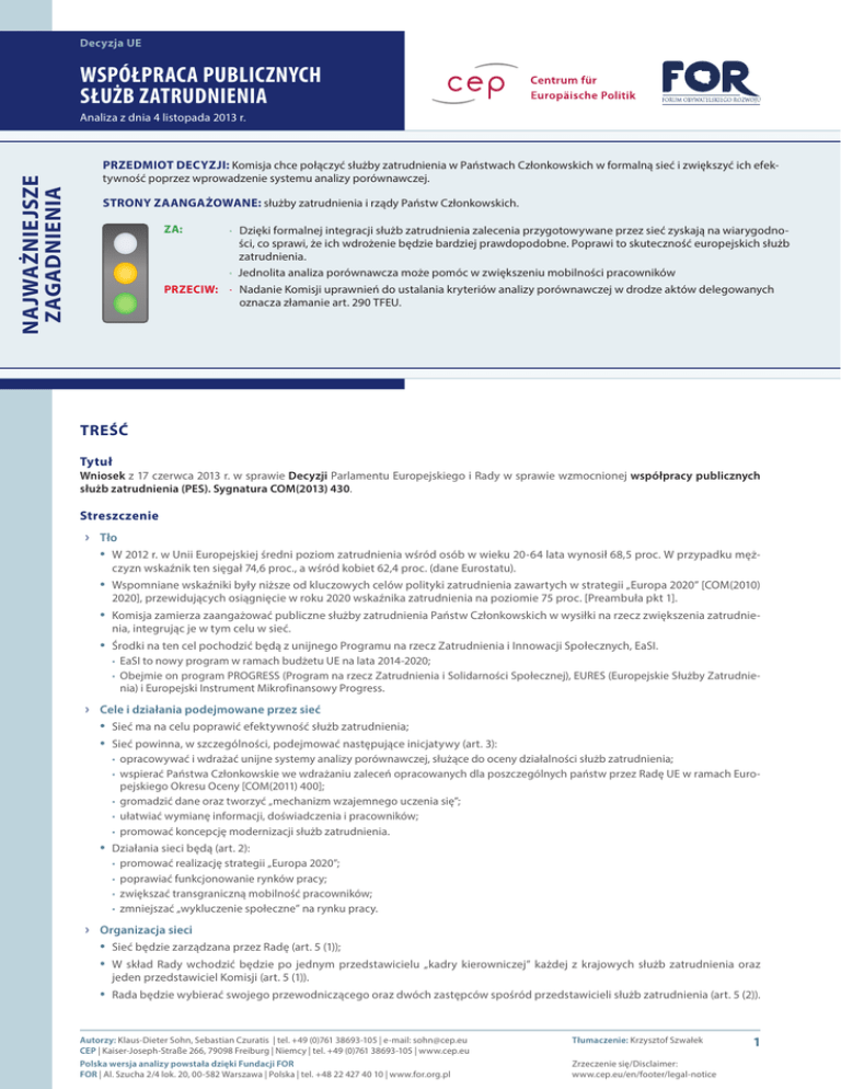 Decyzja UE WSPÓŁPRACA PUBLICZNYCH SŁUŻB ZATRUDNIENIA NAJWAŻNIEJSZE ZAGADNIENIA Analiza z dnia 4 listopada 2013 r. PRZEDMIOT DECYZJI: Komisja chce połączyć służby zatrudnienia w Państwach Członkowskich w formalną sieć i zwiększyć ich efektywność poprzez wprowadzenie systemu analizy porównawczej. STRONY ZAANGAŻOWANE: służby zatrudnienia i rządy Państw Członkowskich. ZA: ·· Dzięki formalnej integracji służb zatrudnienia zalecenia przygotowywane przez sieć zyskają na wiarygodności, co sprawi, że ich wdrożenie będzie bardziej prawdopodobne. Poprawi to skuteczność europejskich służb zatrudnienia. ·· Jednolita analiza porównawcza może pomóc w zwiększeniu mobilności pracowników PRZECIW: ·· Nadanie Komisji uprawnień do ustalania kryteriów analizy porównawczej w drodze aktów delegowanych oznacza złamanie art. 290 TFEU. TREŚĆ Tytuł Wniosek z 17 czerwca 2013 r. w sprawie Decyzji Parlamentu Europejskiego i Rady w sprawie wzmocnionej współpracy publicznych służb zatrudnienia (PES). Sygnatura COM(2013) 430. Streszczenie ›› Tło • W 2012 r. w Unii Europejskiej średni poziom zatrudnienia wśród osób w wieku 20-64 lata wynosił 68,5 proc. W przypadku mężczyzn wskaźnik ten sięgał 74,6 proc., a wśród kobiet 62,4 proc. (dane Eurostatu). • Wspomniane wskaźniki były niższe od kluczowych celów polityki zatrudnienia zawartych w strategii „Europa 2020” [COM(2010) 2020], przewidujących osiągnięcie w roku 2020 wskaźnika zatrudnienia na poziomie 75 proc. [Preambuła pkt 1]. • Komisja zamierza zaangażować publiczne służby zatrudnienia Państw Członkowskich w wysiłki na rzecz zwiększenia zatrudnienia, integrując je w tym celu w sieć. • Środki na ten cel pochodzić będą z unijnego Programu na rzecz Zatrudnienia i Innowacji Społecznych, EaSI. • EaSI to nowy program w ramach budżetu UE na lata 2014-2020; • Obejmie on program PROGRESS (Program na rzecz Zatrudnienia i Solidarności Społecznej), EURES (Europejskie Służby Zatrudnie- nia) i Europejski Instrument Mikrofinansowy Progress. ›› Cele i działania podejmowane przez sieć • Sieć ma na celu poprawić efektywność służb zatrudnienia; • Sieć powinna, w szczególności, podejmować następujące inicjatywy (art. 3): • opracowywać i wdrażać unijne systemy analizy porównawczej, służące do oceny działalności służb zatrudnienia; • wspierać Państwa Członkowskie we wdrażaniu zaleceń opracowanych dla poszczególnych państw przez Radę UE w ramach Euro- pejskiego Okresu Oceny [COM(2011) 400]; • gromadzić dane oraz tworzyć „mechanizm wzajemnego uczenia się”; • ułatwiać wymianę informacji, doświadczenia i pracowników; • promować koncepcję modernizacji służb zatrudnienia. • Działania sieci będą (art. 2): • promować realizację strategii „Europa 2020”; • poprawiać funkcjonowanie rynków pracy; • zwiększać transgraniczną mobilność pracowników; • zmniejszać „wykluczenie społeczne” na rynku pracy. ›› Organizacja sieci • Sieć będzie zarządzana przez Radę (art. 5 (1)); • W skład Rady wchodzić będzie po jednym przedstawicielu „kadry kierowniczej” każdej z krajowych służb zatrudnienia oraz jeden przedstawiciel Komisji (art. 5 (1)). • Rada będzie wybierać swojego przewodniczącego oraz dwóch zastępców spośród przedstawicieli służb zatrudnienia (art. 5 (2)). Autorzy: Klaus-Dieter Sohn, Sebastian Czuratis | tel. +49 (0)761 38693-105 | e-mail: [email protected] CEP | Kaiser-Joseph-Straße 266, 79098 Freiburg | Niemcy | tel. +49 (0)761 38693-105 | www.cep.eu Polska wersja analizy powstała dzięki Fundacji FOR FOR | Al. Szucha 2/4 lok. 20, 00-582 Warszawa | Polska | tel. +48 22 427 40 10 | www.for.org.pl Tłumaczenie: Krzysztof Szwałek Zrzeczenie się/Disclaimer: www.cep.eu/en/footer/legal-notice 1 Decyzja UE WSPÓŁPRACA PUBLICZNYCH SŁUŻB ZATRUDNIENIA Analiza z dnia 4 listopada 2013 r. • Rada przyjmować będzie: • ◦ jednomyślne - swój Regulamin Wewnętrzny; • ◦ zwykłą większością głosów – roczny plan pracy (art. 5 (3)). • Komisja Europejska zapewni Radzie sekretariat (art. 5 (4)). ›› Uprawnienia przyznane Komisji • Komisja przyjmować będzie – w formie aktów delegowanych – przepisy dotyczące (art. 7): • wdrażania analizy porównawczej oraz m.in. „metodologii, podstawowych wskaźników jakościowych i ilościowych służących oce- nie działania publicznych służb zatrudnienia”, • „narzędzi dydaktycznych wzajemnego uczenia się” oraz warunków uczestnictwa w tego rodzaju przedsięwzięciach. ›› Czas trwania i koszty • Działalność sieci przewidziano na lata 2014-2020. • Koszty działania sieci nie zostały określone. Uwagi Komisji w sprawie zasady pomocniczości Komisja stoi na stanowisku, że publiczne służby zatrudnienia są uprawnione „do realizacji interesów i priorytetów krajowych” (s. 5). Mimo to uznaje, że istnieje istotna wartość dodana wynikająca z analizy porównawczej i wzajemnego uczenia się w porównaniu z działalnością na poziomie krajowym. Tło polityczne Decyzja ma na celu wspieranie reform służb zatrudnienia. Ma być uzupełnieniem Gwarancji dla Młodzieży [COM(2012) 729] oraz Inicjatywy na rzecz Zatrudnienia Ludzi Młodych [COM(2013) 144], które Komisja wprowadziła w odpowiedzi na wysoki poziom bezrobocia wśród młodych ludzi. W komunikacie dotyczącym walki z bezrobociem młodzieży [COM(2013) 447] Komisja zapowiedziała też podjęcie dalszych kroków. Procedura prawna 17 czerwca 2013 r. Przyjęcie przez Komisję Termin nieustalony Przyjęcie przez Parlament Europejski i Radę, publikacja w Dzienniku Urzędowym Unii Europejskiej, wejście w życie Podmioty mające wpływ na proces polityczny Dyrekcja Generalna: Dyrekcja generalna ds. zatrudnienia i spraw społecznych (prowadząca) Prowadzące Komisje Parlamentu Europejskiego: Komisja ds. zatrudnienia (pr