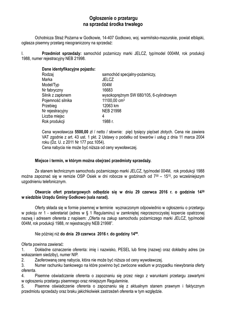 Ogłoszenie o przetargu na sprzedaŜ środka trwałego Ochotnicza StraŜ PoŜarna w Godkowie, 14-407 Godkowo, woj. warmińsko-mazurskie, powiat elbląski, ogłasza pisemny przetarg nieograniczony na sprzedaŜ: I. Przedmiot sprzedaŜy: samochód poŜarniczy marki JELCZ, typ/model 0004M, rok produkcji 1988, numer rejestracyjny NEB 21998. Dane identyfikacyjne pojazdu: Rodzaj Marka Model/Typ Nr fabryczny Silnik z zapłonem Pojemność silnika Przebieg Nr rejestracyjny Liczba miejsc Rok produkcji samochód specjalny-poŜarniczy, JELCZ 004M 16683 wysokopręŜnym SW 680/105, 6-cylindrowym 11100,00 cm3 12063 km NEB 21998 4 1988 r. Cena wywoławcza 5500,00 zł / netto / słownie: pięć tysięcy pięćset złotych. Cena nie zawiera VAT zgodnie z art. 43 ust. 1 pkt. 2 Ustawy o podatku od towarów i usług z dnia 11 marca 2004 roku (Dz. U. z 2011 Nr 177 poz.1054). Cena nabycia nie moŜe być niŜsza od ceny wywoławczej. Miejsce i termin, w którym moŜna obejrzeć przedmioty sprzedaŜy. Ze stanem technicznym samochodu poŜarniczego marki JELCZ, typ/model 004M, rok produkcji 1988 moŜna zapoznać się w remizie OSP Osiek w dni robocze w godzinach od 730 – 1515, po wcześniejszym uzgodnieniu telefonicznym. Otwarcie ofert przetargowych odbędzie się w dniu 29 czerwca 2016 r. o godzinie 1430 w siedzibie Urzędu Gminy Godkowo (sala narad). Oferty składa się w formie pisemnej w terminie wyznaczonym odpowiednio w ogłoszeniu o przetargu w pokoju nr 1 - sekretariat (adres w § 1 Regulaminu) w zamkniętej nieprzezroczystej kopercie opatrzonej nazwą i adresem oferenta z napisem: „Oferta na zakup samochodu poŜarniczego marki JELCZ, typ/model 004M, rok produkcji 1988, nr rejestracyjny NEB 21998”. Nie później niŜ do dnia 29 czerwca 2016 r. do godziny 14ºº. Oferta powinna zawierać: 1. Dokładne oznaczenie oferenta: imię i nazwisko, PESEL lub firmę (nazwę) oraz dokładny adres (ze wskazaniem siedziby), numer NIP. 2. Zaoferowaną cenę nabycia, która nie moŜe być niŜsza od ceny wywoławczej. 3. Numer rachunku bankowego na które powinno być zwrócone wadium w przypadku niewybrania oferty oferenta. 4. Pisemne oświadczenie oferenta o zapoznaniu się przez niego z warunkami przetargu zawartymi w ogłoszeniu przetargu pisemnego oraz niniejszym Regulaminie. Pisemne oświadczenie oferenta o zapoznaniu się z aktualnym stanem prawnym i faktycznym 5. przedmiotu sprzedaŜy oraz braku jakichkolwiek zastrzeŜeń oferenta w tym względzie. 6. 7. Potwierdzenie wpłaty wadium. Pełnomocnik obowiązany jest złoŜyć pełnomocnictwo udzielone przez umocowane osoby. Składający ofertę pozostaje nią związany przez okres 7 dni od daty upływu terminu składania ofert. Warunkiem przystąpienia oferenta do przetargu jest wniesienie wadium w kwocie 550,00 zł przelewem na konto 16 8309 0000 0045 0238 2000 0010 w terminie do dnia 27 czerwca 2016 r. Potwierdzeniem wpłaty wadium jest wpływ środków na konto Ochotniczej StraŜy PoŜarnej w Godkowie w wyŜej podanym terminie. Cena nabycia musi być równa co najmniej cenie wywoławczej. Wadium zwraca się w terminie 7 dni od daty przetargu, niezwłocznie po dokonaniu wybory oferty, a wpłacone przez oferenta, który wygrał przetarg zalicza się na poczet ceny nabycia. Wadium przepada w razie uchylenia się oferenta, który przetarg wygrał, od zawarcia umowy sprzedaŜy środka trwałego. BliŜsze informacje moŜna uzyskać w Urzędzie Gminy Godkowo, Godkowo 14, 14- 407 Godkowo pokój nr 10, tel. (55) 249-72-10. Osoba do kontaktu – Eugeniusz Karpiński. Po zatwierdzeniu protokołu z przetargu wystawiany zostanie dokument sprzedaŜy, który nabywca zobowiązany jest opłacić w terminie nie dłuŜszym niŜ do dnia zawarcia umowy sprzedaŜy. Wydanie samochodu nastąpi niezwłocznie po zapłacie przez nabywcę ceny nabycia. Organizatorowi przysługuje prawo odwołania przetargu bez podania przyczyny. Ochotnicza StraŜ PoŜarna w Godkowie REGULAMIN PRZETARGU PISEMNEGO NIEOGRANICZONEGO na sprzedaŜ samochodu poŜarniczego marki JELCZ, typ/model 004M, rok produkcji 1988. Część ogólna §1 Organizatorem przetargu jest Ochotnicza StraŜ PoŜarna w Godkowie. §2 Przetarg organizowany przez Ochotniczą StraŜ PoŜarną w Godkowie ma charakter przetargu pisemnego nieograniczonego, w którym mogą wziąć udział dowolni oferenci. §3 Przetarg przeprowadzony jest w formie pisemnej w drodze składania przez oferentów pisemnych ofert. §4 1. O niniejszym przetargu informuje się poprzez opublikowanie ogłoszenia o przetargu na stronie internetowej www.uggodkowo.bip.doc.pl oraz na tablicy ogłoszeń w siedzibie Organizatora przetargu. 2. Ogłoszenie o przetargu podaje się do publicznej wiadomości na okres nie krótszy jak 21 dni. §5 W przetargu nie mogą uczestniczyć osoby wchodzące w skład komisji przetargowej oraz osoby bliskie tym osobom, a takŜe osoby, które pozostają z członkami komisji przetargowej w takim stosunku prawnym lub faktycznym, Ŝe moŜe budzić to uzasadnienie wątpliwości co do bezstronności członków komisji przetargowej. Przedmiot przetargu §6 Przedmiotem przetargu jest sprzedaŜ: Samochodu poŜarniczego: Rodzaj Marka Model/Typ Nr fabryczny Silnik z zapłonem Pojemność silnika Przebieg Nr rejestracyjny Liczba miejsc Rok produkcji samochód specjalny-poŜarniczy, JELCZ 004M 16683 wysokopręŜnym SW 680/105, 6-cylindrowym 11100,00 cm3 12063 km NEB 21998 4 1988 r. Cena wywoławcza 5500,00 zł / netto /słownie: pięć tysięcy pięćset złotych. Cena nie zawiera VAT zgodnie z art. 43 ust. 1 pkt 2 Ustawy o podatku od towarów i usług z dnia 11 marca 2004 roku (Dz. U. z 2011 Nr 177 poz.1054). §7 1. Szczegółowe informacje o przedmiocie przetargu moŜna uzyskać w Urzędzie Gminy Godkowo, Godkowo 14, 14- 407 Godkowo - pokój nr 10, tel.(55) 249-72-10. Osoba do kontaktu – Eugeniusz Karpiński. 2. Ze stanem technicznym samochodu poŜarniczego marki JELCZ, typ/model 004M, moŜna zapoznać się w remizie OSP Osiek w dni robocze w go