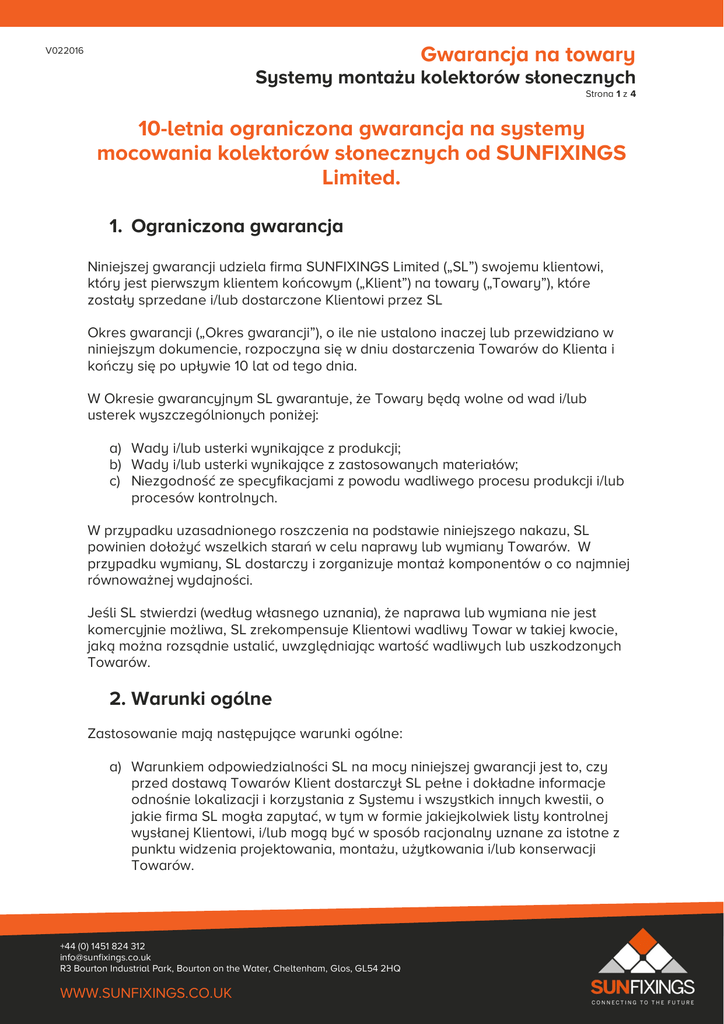 Gwarancja na towary V022016 Systemy montażu kolektorów słonecznych Strona 1 z 4 10-letnia ograniczona gwarancja na systemy mocowania kolektorów słonecznych od SUNFIXINGS Limited. 1. Ograniczona gwarancja Niniejszej gwarancji udziela firma SUNFIXINGS Limited („SL”) swojemu klientowi, który jest pierwszym klientem końcowym („Klient”) na towary („Towary”), które zostały sprzedane i/lub dostarczone Klientowi przez SL Okres gwarancji („Okres gwarancji”), o ile nie ustalono inaczej lub przewidziano w niniejszym dokumencie, rozpoczyna się w dniu dostarczenia Towarów do Klienta i kończy się po upływie 10 lat od tego dnia. W Okresie gwarancyjnym SL gwarantuje, że Towary będą wolne od wad i/lub usterek wyszczególnionych poniżej: a) Wady i/lub usterki wynikające z produkcji; b) Wady i/lub usterki wynikające z zastosowanych materiałów; c) Niezgodność ze specyfikacjami z powodu wadliwego procesu produkcji i/lub procesów kontrolnych. W przypadku uzasadnionego roszczenia na podstawie niniejszego nakazu, SL powinien dołożyć wszelkich starań w celu naprawy lub wymiany Towarów. W przypadku wymiany, SL dostarczy i zorganizuje montaż komponentów o co najmniej równoważnej wydajności. Jeśli SL stwierdzi (według własnego uznania), że naprawa lub wymiana nie jest komercyjnie możliwa, SL zrekompensuje Klientowi wadliwy Towar w takiej kwocie, jaką można rozsądnie ustalić, uwzględniając wartość wadliwych lub uszkodzonych Towarów. 2. Warunki ogólne Zastosowanie mają następujące warunki ogólne: a) Warunkiem odpowiedzialności SL na mocy niniejszej gwarancji jest to, czy przed dostawą Towarów Klient dostarczył SL pełne i dokładne informacje odnośnie lokalizacji i korzystania z Systemu i wszystkich innych kwestii, o jakie firma SL mogła zapytać, w tym w formie jakiejkolwiek listy kontrolnej wysłanej Klientowi, i/lub mogą być w sposób racjonalny uznane za istotne z punktu widzenia projektowania, montażu, użytkowania i/lub konserwacji Towarów. +44 (0) 1451 824 312 [email protected] R3 Bourton Industrial Park, Bourton on the Water, Cheltenham, Glos, GL54 2HQ WWW.SUNFIXINGS.CO.UK Gwarancja na towary V022016 Systemy montażu kolektorów słonecznych Strona 2 z 4 b) SL nie ponosi odpowiedzialności na mocy niniejszej Gwarancji lub w żaden inny sposób za wady i/lub usterki wynikające z (w całości lub częściowo) jakichkolwiek błędów lub innych nieścisłości w jakimkolwiek rysunku, specyfikacji lub informacji dostarczonych przez Klienta. c) SL nie ponosi odpowiedzialności na mocy niniejszej Gwarancji lub w żaden inny sposób, jeśli Klient używa produktów podmiotów trzecich w systemie mocowania kolektora słonecznego, do którego Towary zostały Klientowi sprzedane i/lub dostarczone przez SL. d) Poza wszelkimi innymi instrukcjami i/lub wymogami, o których Klient został poinformowany przez SL, musi on zapewnić, że Towary co najmniej raz do roku, będą przechodzić przegląd i konserwację, prowadzone przez odpowiednio wykwalifikowane i doświadczone osoby z akredytacją MCS lub równoważną . e) Okres gwarancji może zostać skrócony, o czym firma SL poinformuje Klienta przed dostawą Towarów, w przypadku gdy dla Towarów określono krótszy okres eksploatacji lub wymiany. f) Reklamacje na mocy niniejszej Gwarancji mogą być składane wyłącznie przez Klienta (o ile nie uzgodniono inaczej z SL w formie pisemnej). g) Wszelkie domniemane wady i/lub usterki muszą być zgłoszone SL w formie pisemnej w terminie 21 dni od dnia, w którym zostały odkryte przez Klienta (lub mogłyby zostać odkryte w wyniku uzasadnionego przeglądu). h) Firma SL będzie mieć zapewnioną możliwość dokonania przeglądu Towarów, w tym, jeżeli będzie to wymagane, zorganizuje przegląd systemu przez specjalistę lub niezależną firmę kontrolną . i) Po upływie Okresu gwarancji nie przysługuje prawo do składania reklamacji na mocy niniejszej Gwarancji. j) SL nie podlega żadnym zobowiązaniom z tytułu niniejszej gwarancji lub w inny sposób: i) ii) jeśli Klient naruszy warunki niniejszej Gwarancji, jeśli Towary są zgodne z rysunkiem, projektem i/lub specyfikacją otrzymaną od Klienta, iii) jeśli Klient nie przestrzega pisemnych instrukcji SL i/lub ogólnie przyjętych norm i zasad budowlanych odnoszących się do obchodzenia się, składowania, montażu, użytkowania, przeglądów i/lub konserwacji Towarów, iv) jeśli dana wada i/lub usterka powstała w wyniku, lub jest efektem w całości lub częściowo zaniedbania, nieprawidłowych warunków pracy, używania Towarów do celów innych niż zgodne z ich przeznaczeniem, +44 (0) 1451 824 312 [email protected] R3 Bourton Industrial Park, Bourton on the Water, Cheltenham, Glos, GL54 2HQ WWW.SUNFIXINGS.CO.UK Gwarancja na towary V022016 Systemy montażu kolektorów słonecznych Strona 3 z 4 v) lub w świetle parametrów technicznych lub instrukcji dostarczonych i/lub przekazanych Klientowi przez SL, wada i/lub usterka powstała w wyniku nieprawidłowego używania, zaniedbania, wypadku, nieprawidłowego montażu lub zastosowania, usunięcia elementów lub naprawy bez pisemnej zgody ze strony SL, i/lub jeśli dana wada i/lub usterka jest spowodowana w inny sposób (w całości lub częściowo) w warunkach przekraczających wartości określone w specyfikacji w odniesieniu do napięcia, siły wiatru lub obciążenia śniegiem (jeśli dotyczy), awarii zasilania, przepięć, pożaru, wybuchu, niepokojów społecznych, zamieszek, uszkodzeń spowodowanych przez ludzi, owady lub zwierzęta; lub w wyniku narażenia na działanie substancji chemicznych lub biologicznych, toksyn i/lub potencjalnie szkodliwych substancji zawartych w lub emitowanych z otaczającego terenu (bez względu na to, czy firma SL została o tym poinformowana); w wyniku korozji wywołanej solą morską, w wyniku pęknięcia (w tym zbicia szkła), w wyniku działania burzy, piorunów, tornad, huraganów, trzęsienia zie
