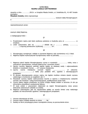 UMOWA NAJMU LOKALU UŻYTKOWEGO zawarta w dniu ……………..2013r. w Urzędzie Miasta Imielin, ul. Imielińska 81, 41-407 Imielin pomiędzy: Miastem Imielin, które reprezentuje ………………………………………………………………………………………, zwanym dalej Wynajmującym a ........................................................................................................................................ ........................................................................................................................................ reprezentowanym przez: …………………………………………………………………………………………………………………………………… zwanym dalej Najemcą o następującej treści : §1 1. Przedmiotem najmu jest lokal użytkowy położony w budynku przy ul. …………………… w Imielinie. 2. Lokal usytuowany jest na ………………i składa się z ………….. pokoju, ……………., ……………o łącznej powierzchni użytkowej ……………… m². §2 1. Wynajmujący wynajmuje i oddaje w używanie Najemcy cały wymieniony w § 1 lokal. 2. Najemca będzie wykorzystywał wynajmowany lokal na potrzeby…………………………. §3 1. Najemca płacić będzie Wynajmującemu czynsz w wysokości ……………….. netto, wraz z centralnym ogrzewaniem, energią elektryczną i wywozem śmieci. 2. Oprócz czynszu Najemca uiszczać będzie opłaty za dostawę wody i odprowadzanie ścieków w wysokości równej …….m³ zużycia miesięcznie. 3. Łączny czynsz miesięczny wynosić będzie: …………………….. zł (słownie: ………………………………………) netto plus podatek VAT, zgodnie z obowiązującymi przepisami. 4. W okresie obowiązywania umowy najmu nie będzie możliwa zmiana stawki czynszu ustalonego w konkursie za wyjątkiem ust. 5 5. Wysokość czynszu będzie waloryzowana rocznie w oparciu o średnioroczny wskaźnik wzrostu cen towarów i usług konsumpcyjnych, publikowanym przez GUS. 6. Czynsz płatny będzie przelewem na konto Urzędu Miasta Imielin w terminie 14 dni po otrzymaniu prawidłowo wystawionej faktury. 7. W razie zwłoki z uiszczaniem należności za najem Wynajmującemu służy prawo doliczania ustawowych odsetek za zwłokę. 8. Najemca zobowiązany jest do regulowania opłaty za wywóz śmieci oraz należnego podatku od nieruchomości zgodnie z obowiązującymi przepisami. §4 1. Umowa obowiązuje od dnia ………………………………. 2. Umowa najmu została zawarta na okres …….. lat. 3. Każdej ze stron przysługuje prawo rozwiązania umowy za porozumienie stron. Strona 1 z 2 4. Rozwiązanie umowy przez Wynajmującego przed terminem może nastąpić w razie zalegania z zapłatą czynszu przez okres dwóch miesięcy lub niewywiązywania się z obowiązków określonych w § 6 umowy. 5. W razie rozwiązania umowy przed terminem z przyczyn, za które winę ponosi jedna ze Stron, drugiej Stronie przysługuje odszkodowanie. §5 Najemcy nie wolno oddać lokalu w całości lub w części osobie trzeciej w podnajem, bez zgody Wynajmującego. §6 1. Najemca jest zobowiązany do używania lokalu zgodnie z jego przeznaczeniem. 2. Najemca jest zobowiązany utrzymać lokal i pomieszczenia przynależne we właściwym stanie sanitarnym i technicznym poprzez wykonywanie bieżących konserwacji, napraw, remontów. 3. Ewentualne przeróbki, dostosowanie lokalu dla własnych potrzeb, nastąpi po uprzednim uzyskaniu zgody ze strony Wynajmującego – na ryzyko i koszt Najemcy. 4. Najemca jest zobowiązany przestrzegać zasad bezpieczeństwa przeciwpożarowego, sanitarnego, zasad ochrony środowiska oraz ponoszenia odpowiedzialności z tego tytułu. Najemca zobowiązany jest również wyposażyć lokal w sprzęt przeciwpożarowy stosownie do przepisów obowiązujących w tym względzie, w tym do dokonywania na własny koszt przeglądu i konserwacji tego sprzętu. §7 Po zakończeniu najmu Najemca zobowiązany jest zwrócić lokal w stanie nie pogorszonym ponad normalne zużycie. §8 W sprawach nie uregulowanych umową mają zastosowanie odpowiednie przepisy Kodeksu Cywilnego. §9 Zmiany umowy wymagają formy pisemnej pod rygorem nieważności. §10 Umowę sporządzono w 2-ch jednobrzmiących egzemplarzach, po 1 egz. dla każdej ze Stron. WYNAJMUJĄCY: NAJEMCA: Strona 2 z 2