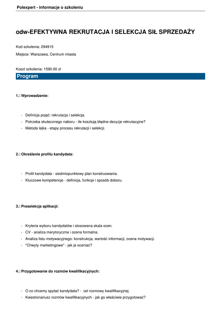 Polexpert - informacje o szkoleniu odw-EFEKTYWNA REKRUTACJA I SELEKCJA SIŁ SPRZEDAŻY Kod szkolenia: 294915 Miejsce: Warszawa, Centrum miasta Koszt szkolenia: 1590.00 zł Program 1. Wprowadzenie: - Definicja pojęć: rekrutacja i selekcja. - Potrzeba skutecznego naboru - ile kosztują błędne decyzje rekrutacyjne? - Metoda lejka - etapy procesu rekrutacji i selekcji. 2. Określenie profilu kandydata: - Profil kandydata - siedmiopunktowy plan konstruowania. - Kluczowe kompetencje - definicja, funkcje i sposób doboru. 3. Preselekcja aplikacji: - Kryteria wyboru kandydatów i stosowana skala ocen. - CV - analiza merytoryczna i ocena formalna. - Analiza listu motywacyjnego: konstrukcja, wartość informacji, ocena motywacji. - "Chwyty marketingowe" - jak je oceniać? 4. Przygotowanie do rozmów kwalifikacyjnych: - O co chcemy spytać kandydata? - cel rozmowy kwalifikacyjnej. - Kwestionariusz rozmów kwalifikacyjnych - jak go właściwie przygotować? Polexpert - informacje o szkoleniu 5. Wywiad selekcyjny z kandydatem: - Etapy i prawidłowy przebieg wywiadu. - Techniki prowadzenia rozmowy kwalifikacyjnej. - Budowanie właściwej atmosfery i relacji z kandydatem. - Komunikacja niewerbalna, aktywne słuchanie oraz elementy skutecznej komunikacji. - Pytania - kiedy zastosować określony rodzaj pytania oraz ocena ich efektywności. - Aspekty formalne - o co nie wolno pytać kandydata? - Weryfikacja cv - o co warto zapytać kandydata? - Wywiad kompetencyjny - założenia i sposoby prowadzenia. - Metoda epizodyczna i sytuacyjna diagnozy kompetencyjnej. - Schemat motywacyjny - czy kandydat będzie Prowadzący