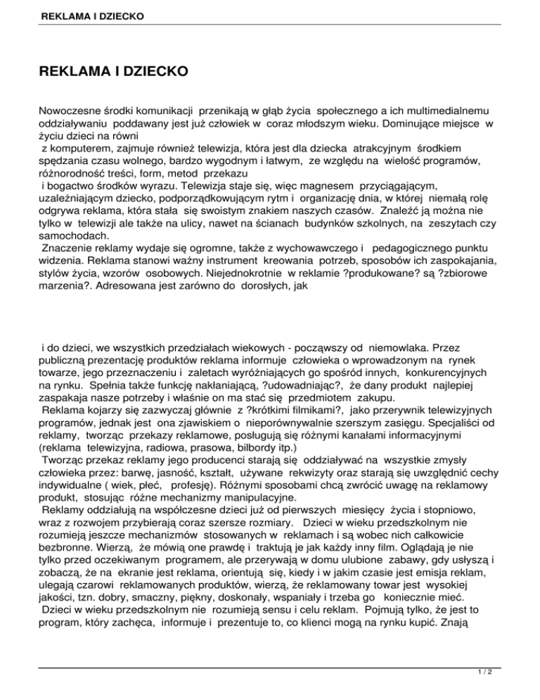 REKLAMA I DZIECKO REKLAMA I DZIECKO Nowoczesne środki komunikacji przenikają w głąb życia społecznego a ich multimedialnemu oddziaływaniu poddawany jest już człowiek w coraz młodszym wieku. Dominujące miejsce w życiu dzieci na równi z komputerem, zajmuje również telewizja, która jest dla dziecka atrakcyjnym środkiem spędzania czasu wolnego, bardzo wygodnym i łatwym, ze względu na wielość programów, różnorodność treści, form, metod przekazu i bogactwo środków wyrazu. Telewizja staje się, więc magnesem przyciągającym, uzależniającym dziecko, podporządkowującym rytm i organizację dnia, w której niemałą rolę odgrywa reklama, która stała się swoistym znakiem naszych czasów. Znaleźć ją można nie tylko w telewizji ale także na ulicy, nawet na ścianach budynków szkolnych, na zeszytach czy samochodach. Znaczenie reklamy wydaje się ogromne, także z wychowawczego i pedagogicznego punktu widzenia. Reklama stanowi ważny instrument kreowania potrzeb, sposobów ich zaspokajania, stylów życia, wzorów osobowych. Niejednokrotnie w reklamie ?produkowane? są ?zbiorowe marzenia?. Adresowana jest zarówno do dorosłych, jak i do dzieci, we wszystkich przedziałach wiekowych - począwszy od niemowlaka. Przez publiczną prezentację produktów reklama informuje człowieka o wprowadzonym na rynek towarze, jego przeznaczeniu i zaletach wyróżniających go spośród innych, konkurencyjnych na rynku. Spełnia także funkcję nakłaniającą, ?udowadniając?, że dany produkt najlepiej zaspakaja nasze potrzeby i właśnie on ma stać się przedmiotem zakupu. Reklama kojarzy się zazwyczaj głównie z ?krótkimi filmikami?, jako przerywnik telewizyjnych programów, jednak jest ona zjawiskiem o nieporównywalnie szerszym zasięgu. Specjaliści od reklamy, tworząc przekazy reklamowe, posługują się różnymi kanałami informacyjnymi (reklama telewizyjna, radiowa, prasowa, bilbordy itp.) Tworząc przekaz reklamy jego producenci starają się oddziaływać na wszystkie zmysły człowieka przez: barwę, jasność, kształt, używane rekwizyty oraz starają się uwzględnić cechy indywidualne ( wiek, płeć, profesję). Różnymi sposobami chcą zwrócić uwagę na reklamowy produkt, stosując różne mechanizmy manipulacyjne. Reklamy oddziałują na współczesne dzieci już od pierwszych miesięcy życia i stopniowo, wraz z rozwojem przybierają coraz szersze rozmiary. Dzieci w wieku przedszkolnym nie rozumieją jeszcze mechanizmów stosowanych w reklamach i są wobec nich całkowicie bezbronne. Wierzą, że mówią one prawdę i traktują je jak każdy inny film. Oglądają je nie tylko przed oczekiwanym programem, ale przerywają w domu ulubione zabawy, gdy usłyszą i zobaczą, że na ekranie jest reklama, orientują się, kiedy i w jakim czasie jest emisja reklam, ulegają czarowi reklamowanych produktów, wierzą, że reklamowany towar jest wysokiej jakości, tzn. dobry, smaczny, piękny, doskonały, wspaniały i trzeba go koniecznie mieć. Dzieci w wieku przedszkolnym nie rozumieją sensu i celu reklam. Pojmują tylko, że jest to program, który zachęca, informuje i prezentuje to, co klienci mogą na rynku kupić. Znają 1/2 REKLAMA I DZIECKO nazwy reklamowych wyrobów i nazwy firm produkujących towary. To, co najbardziej podoba się dzieciom w programach reklamowych, to wpadające w ucho melodyjne piosenki. Lubią je nucić i śpiewać przy różnych okazjach. Często znajomość tych śpiewanych treści reklam jest źródłem popisów dziecięcych w rodzinnym gronie, a także okazją do wykazania się wśród rówieśników, kto jest lepszy. Podoba się także dzieciom w reklamach animacja. przemawia do ich wyobraźni świat barw, spostrzegają piękną kolorystykę, estetykę i smak. Podobają się im także śmieszne dialogi. Reklamy telewizyjne wzbudzają dążenia do zaspokojenia potrzeb posiadania. Dzieci chcą mieć reklamowane zabawki, słodycze i napoje. Choć nie zawsze wywierają one dobry wpływ. Słodycze ze względów zdrowotnych powinny być np. spożywane z umiarem, jednak w reklamie jest inaczej. Mleczny batonik, według reklamy, zastępuje szklankę mleka, a cudowne mleczne dropsy ?przeniosą każdego w krainę dzieciństwa? , co sugeruje, że są bardzo zdrowe.. Reklamy skłaniają dzieci do molestowania rodziców o ciągłe kupowanie reklamowanych produktów. Dzieci najczęściej i najchętniej oglądają reklamy przed dobranocką. Najbardziej podobają im się reklamy prezentujące następujące zabawki i gry komputerowe. Oglądanie ich na ekranie telewizora wywołuje u dzieci marzenia i pragnienia ich posiadania.. Reklama stała się tematem codziennych rozmów. Niektóre z fragmentów są cytowane, a dzieci odgrywają też role charakterystycznych postaci, próbują je naśladować, posługują się zapożyczonym z reklam słownictwem (nie zawsze adekwatnym do rzeczywistości). Podświadomie utożsamiają się czasem z ich bohaterami. Reasumując magia reklam telewizyjnych oddziałuję na dzieci silnie, iż wymuszają one na rodzicach zakup zabawek, słodyczy itp. , reklamy w rodzinach gorzej sytuowanych stają się źródłem napięć i konfliktów, dziecko odbiera reklamę bezkrytycznie, w przypadku posiadania reklamowanego przedmiotu, dziecko często przekonuję się, że wymarzony przedmiot nie jest tak doskonały lub funkcjonalny, a cukierek nie smakuje tak, jak sobie wyobrażało ? i zaczyna wątpić w autentyzm opinii ludzi dorosłych. To drastyczne odkrycie i odsłonięcie utajonego fałszu stanowi dla dziecka prawdziwą klęskę. Niewątpliwie oddziaływanie mediów ( telewizji, reklam) na dzieci w wieku przedszkolnym i nie tylko jest ogromne, ma ono skutki pozytywne tzn. rozwija wyobraźnię dziecka, poszerza jego słownictwo, a także wiedzę o świecie. Jednak oprócz pozytywów płynących z oglądania telewizji ( filmów i reklam ), jest mnóstwo negatywnych tego stron i od nas zależy by te pozytywne skutki p