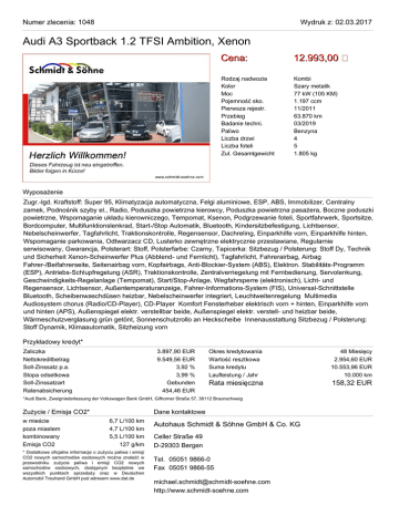 Numer zlecenia: 1048 Wydruk z: 02.03.2017 Audi A3 Sportback 1.2 TFSI Ambition, Xenon Cena: 12.993,00 Rodzaj nadwozia Kolor Moc Pojemność sko. Pierwsza rejestr. Przebieg Badanie techni. Paliwo Liczba drzwi Liczba foteli Zul. Gesamtgewicht Kombi Szary metalik 77 kW (105 KM) 1.197 ccm 11/2011 63.870 km 03/2019 Benzyna 4 5 1.805 kg Wyposażenie Zugr.-lgd. Kraftstoff: Super 95, Klimatyzacja automatyczna, Felgi aluminiowe, ESP, ABS, Immobilizer, Centralny zamek, Podnośnik szyby el., Radio, Poduszka powietrzna kierowcy, Poduszka powietrzna pasażera, Boczne poduszki powietrzne, Wspomaganie układu kierowniczego, Tempomat, Ksenon, Podgrzewanie foteli, Sportfahrwerk, Sportsitze, Bordcomputer, Multifunktionslenkrad, Start-/Stop Automatik, Bluetooth, Kindersitzbefestigung, Lichtsensor, Nebelscheinwerfer, Tagfahrlicht, Traktionskontrolle, Regensensor, Dachreling, Einparkhilfe vorn, Einparkhilfe hinten, Wspomaganie parkowania, Odtwarzacz CD, Lusterko zewnętrzne elektrycznie przestawiane, Regularnie serwisowany, Gwarancja, Polsterart: Stoff, Polsterfarbe: Czarny, Tapicerka: Sitzbezug / Polsterung: Stoff Dy, Technik und Sicherheit Xenon-Scheinwerfer Plus (Abblend- und Fernlicht), Tagfahrlicht, Fahrerairbag, Airbag Fahrer-/Beifahrerseite, Seitenairbag vorn, Kopfairbags, Anti-Blockier-System (ABS), Elektron. Stabilitäts-Programm (ESP), Antriebs-Schlupfregelung (ASR), Traktionskontrolle, Zentralverriegelung mit Fernbedienung, Servolenkung, Geschwindigkeits-Regelanlage (Tempomat), Start/Stop-Anlage, Wegfahrsperre (elektronisch), Licht- und Regensensor, Lichtsensor, Außentemperaturanzeige, Fahrer-Informations-System (FIS), Universal-Schnittstelle Bluetooth, Scheibenwaschdüsen heizbar, Nebelscheinwerfer integriert, Leuchtweitenregelung Multimedia Audiosystem chorus (Radio/CD-Player), CD-Player Komfort Fensterheber elektrisch vorn + hinten, Einparkhilfe vorn und hinten (APS), Außenspiegel elektr. verstellbar beide, Außenspiegel elektr. verstell- und heizbar beide, Wärmeschutzverglasung grün getönt, Sonnenschutzrollo an Heckscheibe Innenausstattung Sitzbezug / Polsterung: Stoff Dynamik, Klimaautomatik, Sitzheizung vorn Przykładowy kredyt* Zaliczka Nettokreditbetrag Soll-Zinssatz p.a. Stopa odsetkowa Soll-Zinssatzart Ratenabsicherung 3.897,90 EUR 9.549,56 EUR 3,92 % 3,99 % Gebunden 454,46 EUR Okres kredytowania Wartość resztkowa Suma kredytu Laufleistung / Jahr 48 Miesięcy 2.954,60 EUR 10.553,96 EUR 10.000 km Rata miesięczna 158,32 EUR *Audi Bank, Zweigniederlassung der Volkswagen Bank GmbH, Gifhorner Straße 57, 38112 Braunschweig Zużycie / Emisja CO2* w mieście poza miastem kombinowany Emisja CO2 Dane kontaktowe 6,7 L/100 km 4,7 L/100 km 5,5 L/100 km 127 g/km * Dodatkowe oficjalne informacje o zużyciu paliwa i emisji CO2 nowych samochodów osobowych można znaleźć w przewodniku zużycia paliwa i emisji CO2 nowych samochodów osobowych, dostępnym bezpłatnie we wszystkich punktach sprzedaży oraz w Deutschen Automobil Treuhand GmbH pod adresem www.dat.de Autohaus Schmidt & Söhne GmbH & Co. KG Celler Straße 49 D-29303 Bergen Tel. 05051 9866-0 Fax 05051 9866-55 [email protected] http://www.schmidt-soehne.com Numer zlecenia: 1048 Audi A3 Sportback 1.2 TFSI Ambition, Xenon Wydruk z: 02.03.2017
