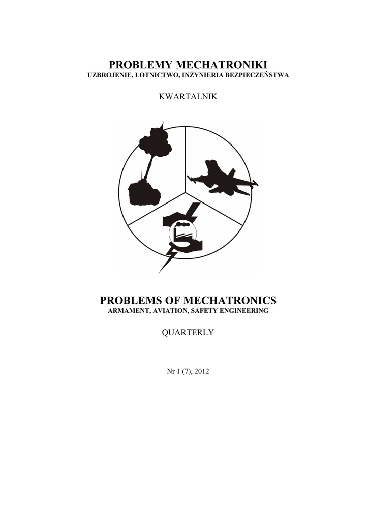 PROBLEMY MECHATRONIKI UZBROJENIE, LOTNICTWO, INśYNIERIA BEZPIECZEŃSTWA KWARTALNIK PROBLEMS OF MECHATRONICS ARMAMENT, AVIATION, SAFETY ENGINEERING QUARTERLY Nr 1 (7), 2012 Copyright © by Military University of Technology, Poland. All rights reserved. Warsaw 2012 ISSN 2081-5891 Korekta / Proof: Renata Borkowska, Adrian Kemp DTP: Sławomir Dębski, Renata Chromik Projekt okładki / Book cover design: Barbara Chruszczyk Wydawca: Wojskowa Akademia Techniczna ul. Gen. Sylwestra Kaliskiego 2 00-908 Warszawa Published by: Military University of Technology 2 Gen. Sylwestra Kaliskiego St. 00-908 Warsaw, Poland Redaktor naczelny / Editor-in-Chief: prof. dr hab. inŜ. Radosław TRĘBIŃSKI Redakcja: Wydział Mechatroniki i Lotnictwa Wojskowa Akademia Techniczna ul. Gen. Sylwestra Kaliskiego 2 00-908 Warszawa tel. 22 683 99 56 fax 22 683 95 08 www.wmt.wat.edu.pl Editorial Office: Faculty of Mechatronics and Aerospace Military University of Technology 2 Gen. Sylwestra Kaliskiego St. 00-908 Warsaw, Poland phone: 48 22 683 99 56 fax: 48 22 683 95 08 www.wmt.wat.edu.pl Druk: Remigraf Sp. z o.o. ul. Ratuszowa 11 03-450 Warszawa, tel./fax 22 619 29 12 www.remigraf.pl [email protected] Printed by: Remigraf Sp. z o.o. 11 Ratuszowa St. 03-450 Warsaw, Poland tel./fax 48 22 619 29 12 www.remigraf.pl [email protected] RADA WYDAWNICZA / EDITORIAL BOARD Vladimir BELLA Akademia Sił Zbrojnych, Liptovski Mikulasz, Słowacja Armed Forces Academy, Liptovsky Mikulas, Slovakia Zbigniew BIELECKI Wojskowa Akademia Techniczna, Warszawa Military University of Technology, Warsaw, Poland Maciej BOSSAK Instytut Lotnictwa, Warszawa Institute of Aviation, Warsaw, Poland Stanisław CUDZIŁO Wojskowa Akademia Techniczna, Warszawa Military University of Technology, Warsaw, Poland Algimantas Politechnika w Kownie, Litwa FEDARAVICIUS Kaunas University of Technology, Lithuania Józef GACEK Wojskowa Akademia Techniczna, Warszawa Military University of Technology, Warsaw, Poland Jan GODZIMIRSKI Wojskowa Akademia Techniczna, Warszawa Military University of Technology, Warsaw, Poland Adam JACKOWSKI Wojskowa Akademia Techniczna, Warszawa Military University of Technology, Warsaw, Poland Zygmunt KITOWSKI Akademia Marynarki Wojennej, Gdynia Polish Naval Academy, Gdynia, Poland Jan W. KOBIERSKI Akademia Marynarki Wojennej, Gdynia Polish Naval Academy, Gdynia, Poland Piotr KONIORCZYK Wojskowa Akademia Techniczna, Warszawa Military University of Technology, Warsaw, Poland Zbigniew KORUBA Politechnika Świętokrzyska, Kielce Kielce University of Technology, Kielce, Poland Grzegorz KOWALECZKO WyŜsza Szkoła Oficerska Sił Powietrznych, Dęblin Polish Air Force Academy, Dęblin, Poland Andrzej KSIĄśCZAK Politechnika Warszawska, Warszawa Warsaw University of Technology, Warsaw, Poland Zbigniew LECIEJEWSKI Wojskowa Akademia Techniczna, Warszawa Military University of Technology, Warsaw, Poland Martin MACKO Uniwersytet Obrony, Brno, Czechy University of Defence, Brno, Czech Republic Zygmunt MIERCZYK Wojskowa Akademia Techniczna, Warszawa Military University of Technology, Warsaw, Poland Momcilo MILINOVIC Uniwersytet w Belgradzie, Serbia University of Belgrade, Serbia Jerzy MŁOKOSIEWICZ Wojskowa Akademia Techniczna, Warszawa Military University of Technology, Warsaw, Poland Aleksander OLEJNIK Wojskowa Akademia Techniczna, Warszawa Military University of Technology, Warsaw, Poland Andrzej PANAS Wojskowa Akademia Techniczna, Warszawa Military University of Technology, Warsaw, Poland Jan PIETRASIEŃSKI Wojskowa Akademia Techniczna, Warszawa Military University of Technology, Warsaw, Poland Doru SAFTA Techniczna Akademia Wojskowa, Bukareszt, Rumunia Military Technical Academy, Bucharest, Romania Krzysztof SIBILSKI Instytut Techniczny Wojsk Lotniczych, Warszawa Air Force Institute of Technology, Warsaw, Poland Andrzej SKOMRA Wojskowa Akademia Techniczna, Warszawa Military University of Technology, Warsaw, Poland Wiesław SOBIERAJ Wojskowa Akademia Techniczna, Warszawa Military University of Technology, Warsaw, Poland Stanisław TORECKI Wojskowa Akademia Techniczna, Warszawa Military University of Technology, Warsaw, Poland Radosław TRĘBIŃSKI Wojskowa Akademia Techniczna, Warszawa – przewodniczący Military University of Technology, Warsaw, Poland – chairman Adam WIŚNIEWSKI Wojskowy Instytut Techniczny Uzbrojenia, Zielonka Military Institute of Armament Technology, Zielonka, Poland Edward WŁODARCZYK Wojskowa Akademia Techniczna, Warszawa Military University of Technology, Warsaw, Poland Stanisław WRZESIEŃ Wojskowa Akademia Techniczna, Warszawa Military University of Technology, Warsaw, Poland Vladimir E. ZARKO Instytut Kinetyki Chemicznej i Spalania, Nowosybirsk, Rosja Institute of Chemical Kinetics and Combustion, Novosibirsk, Russia Bogdan ZYGMUNT Wojskowa Akademia Techniczna, Warszawa Military University of Technology, Poland Andrzej śYLUK Instytut Techniczny Wojsk Lotniczych, Warszawa Air Force Institute of Technology, Warsaw, Poland Redaktorzy tematyczni / Subject Editors Nauki chemiczne / Chemistry Prof. dr hab. inŜ. Bogdan ZYGMUNT Nauki techniczne / Technology Prof. dr hab. inŜ. Józef GACEK − uzbrojenie/armament Prof. dr hab. inŜ. Aleksander OLEJNIK – lotnictwo/aviation Dr hab. inŜ. Andrzej SKOMRA – inŜynieria bezpieczeństwa/safety engineering Szanowni Czytelnicy! Od początku wydawania kwartalnika naukowego Problemy mechatroniki. Uzbrojenie, lotnictwo, inŜynieria bezpieczeństwa jego zespół redakcyjny czynił starania, aby czasopismo to znalazło swoje godne miejsce wśród polskich czasopism naukowych o profilu technicznym oraz aby publikujący w nim autorzy czerpali satysfakcję z poziomu edytorskiego czasopisma. Celem nadrzędnym redakcji było i jest wprowadzenie czasopisma na publikowaną przez Ministerstwo Nauki i Szkolnictwa WyŜszego listę czasopism punktowanych, co pozwoli potwierdzić zarówno odpowiedni poziom edytorski czasopisma, jak równieŜ poziom merytoryczny zamieszczonych w nim artykułów. Mił
