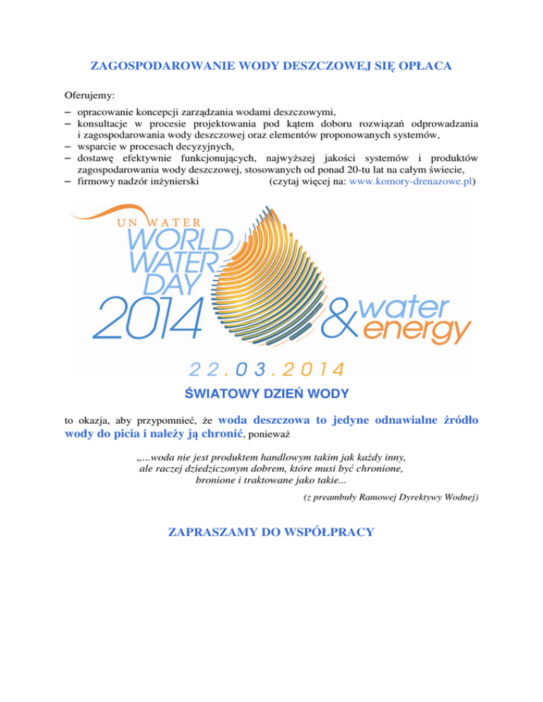 ZAGOSPODAROWANIE WODY DESZCZOWEJ SIĘ OPŁACA Oferujemy: – opracowanie koncepcji zarządzania wodami deszczowymi, – konsultacje w procesie projektowania pod kątem doboru rozwiązań odprowadzania i zagospodarowania wody deszczowej oraz elementów proponowanych systemów, – wsparcie w procesach decyzyjnych, – dostawę efektywnie funkcjonujących, najwyższej jakości systemów i produktów zagospodarowania wody deszczowej, stosowanych od ponad 20-tu lat na całym świecie, – firmowy nadzór inżynierski (czytaj więcej na: www.komory-drenazowe.pl) ŚWIATOWY DZIEŃ WODY to okazja, aby przypomnieć, że woda deszczowa to jedyne odnawialne źródło wody do picia i należy ją chronić, ponieważ „...woda nie jest produktem handlowym takim jak każdy inny, ale raczej dziedziczonym dobrem, które musi być chronione, bronione i traktowane jako takie... (z preambuły Ramowej Dyrektywy Wodnej) ZAPRASZAMY DO WSPÓŁPRACY